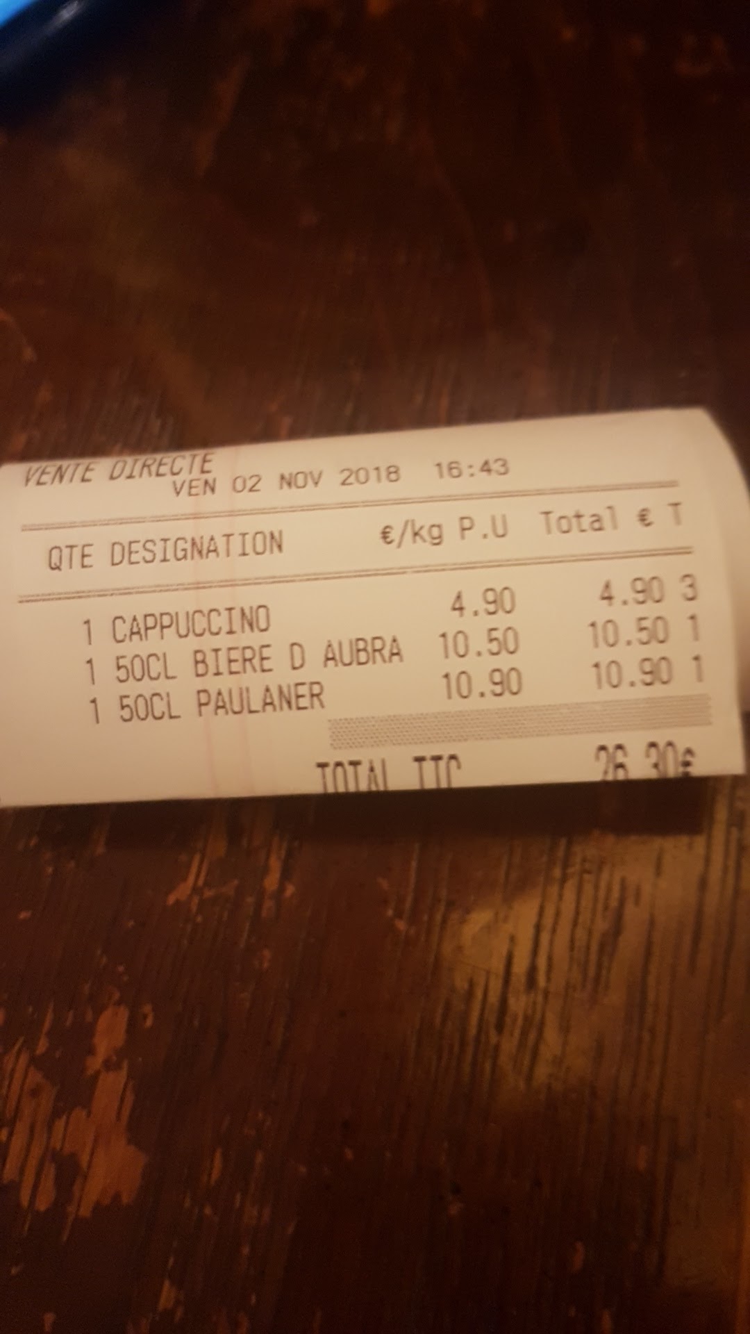Très très bof ! Pinte à 10€90 de Paulaner qui sent la lambic, aucun sens, on l'a changée. Cappuccino insipide. Et en plus ça sort les poubelles en plein milieux de l'aprem 17h15 en passant par la salle de bar. Et des mouches qui nous tournent autour... Merveilleux