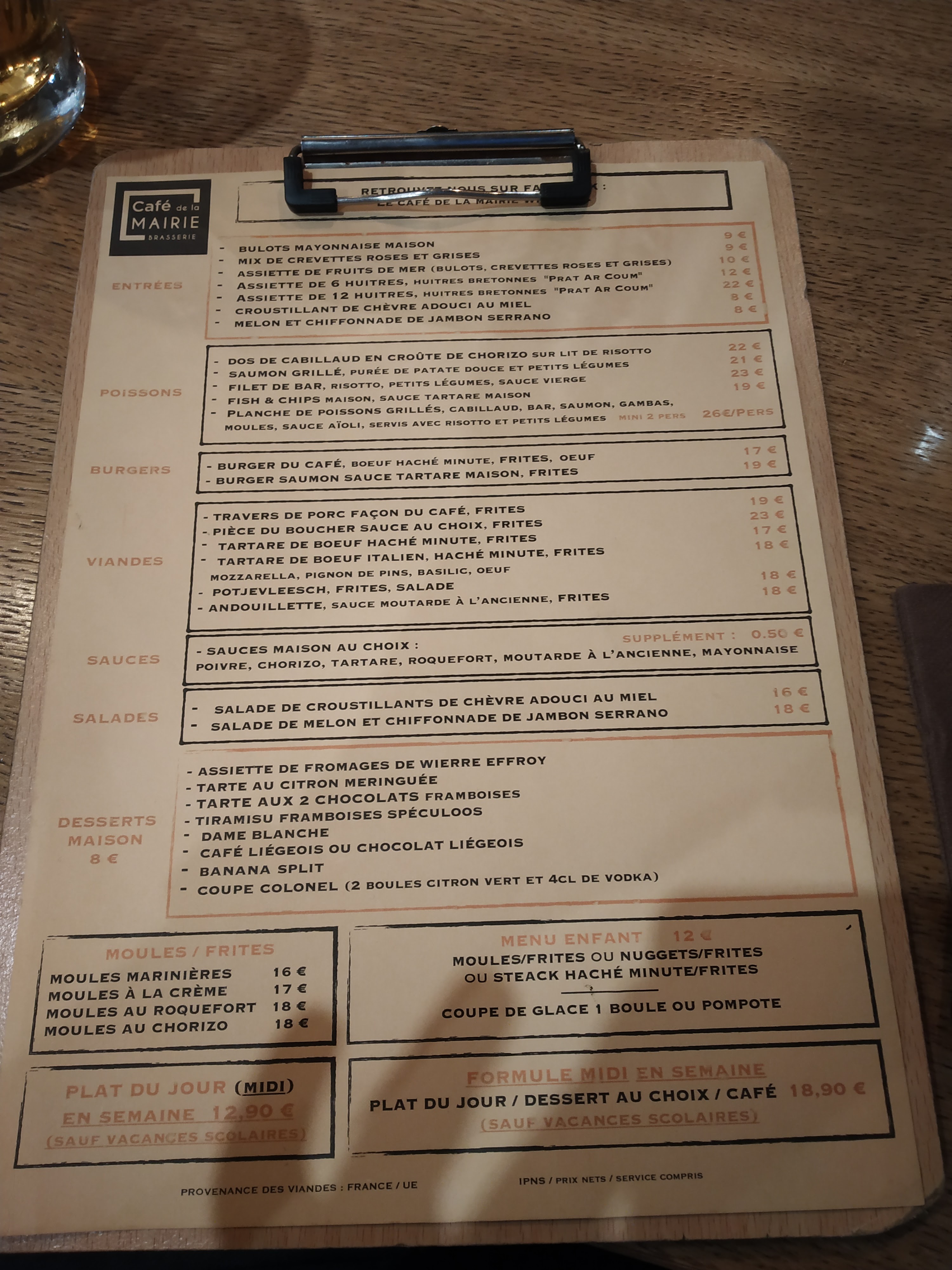 . Service nickel avec le sourire . Repas : moules au chorizo c’était bon mais pas assez de chorizo à mon goût Moules marinières très bon . Burger du café très bon . Petit bémol l’affligem blonde en 33 cl est plus chère de 30 centimes que sur la digue face à la mer. Tarif : 64.30 pour 3 adultes 1 kir, 1 jus de fruits, 1 bière, 2 cafés + les plats si dessus. Continuez comme ça 👍