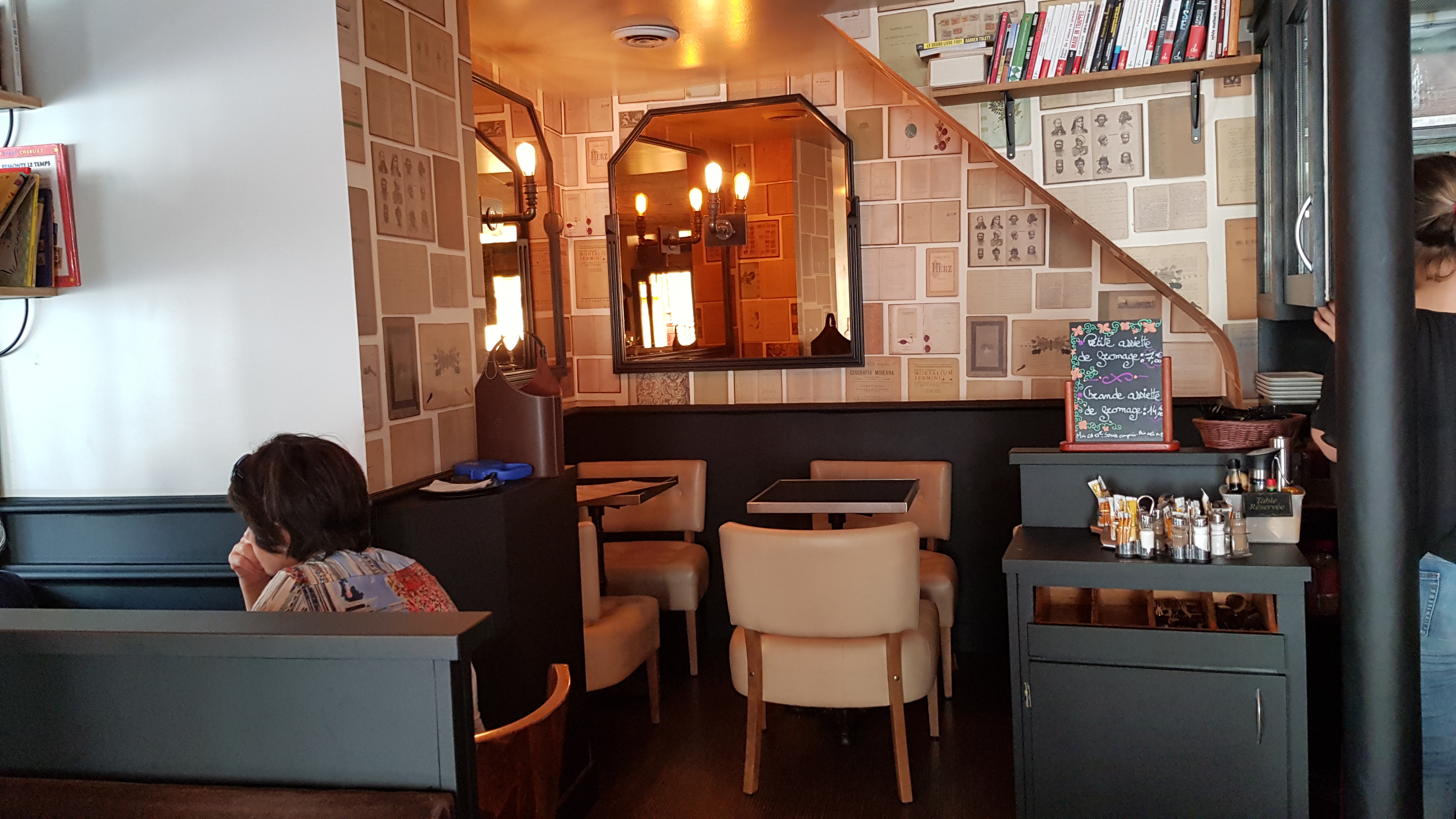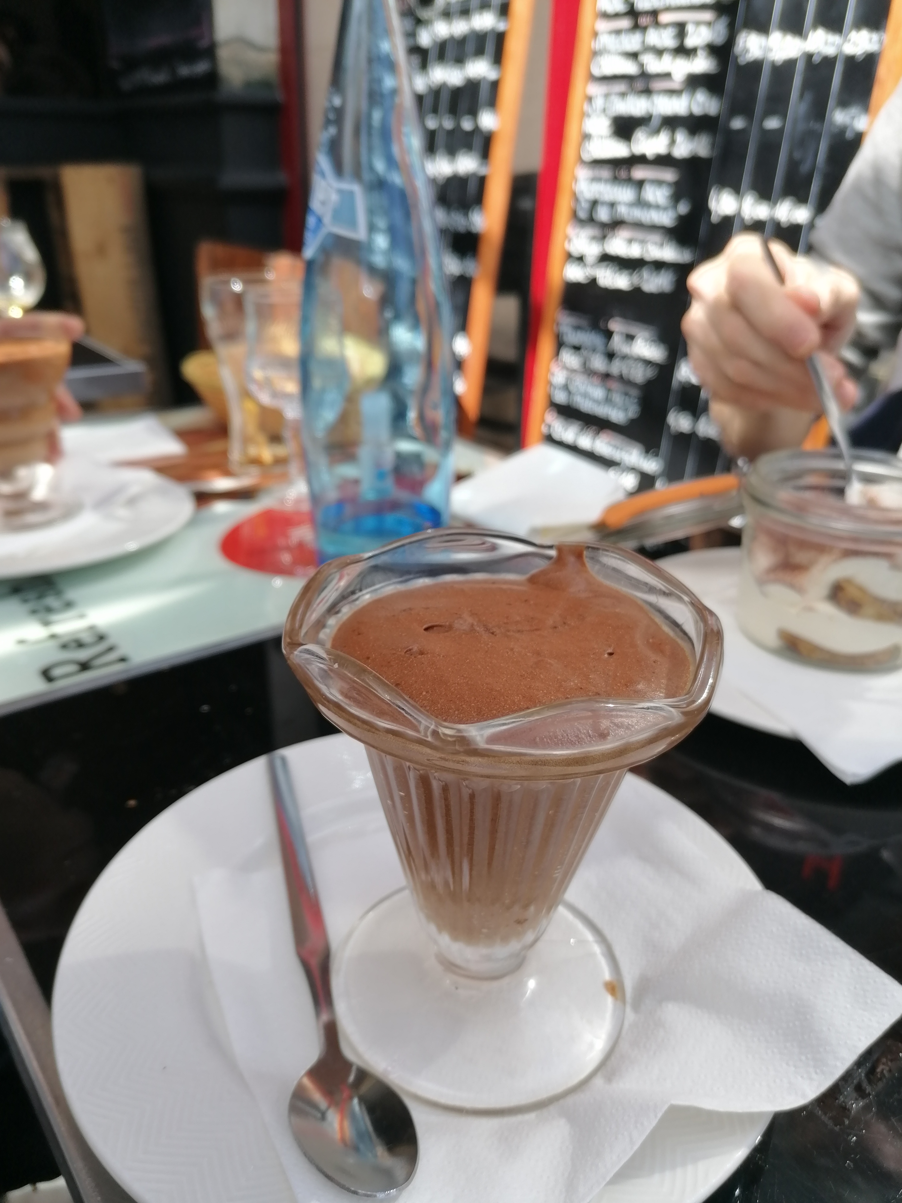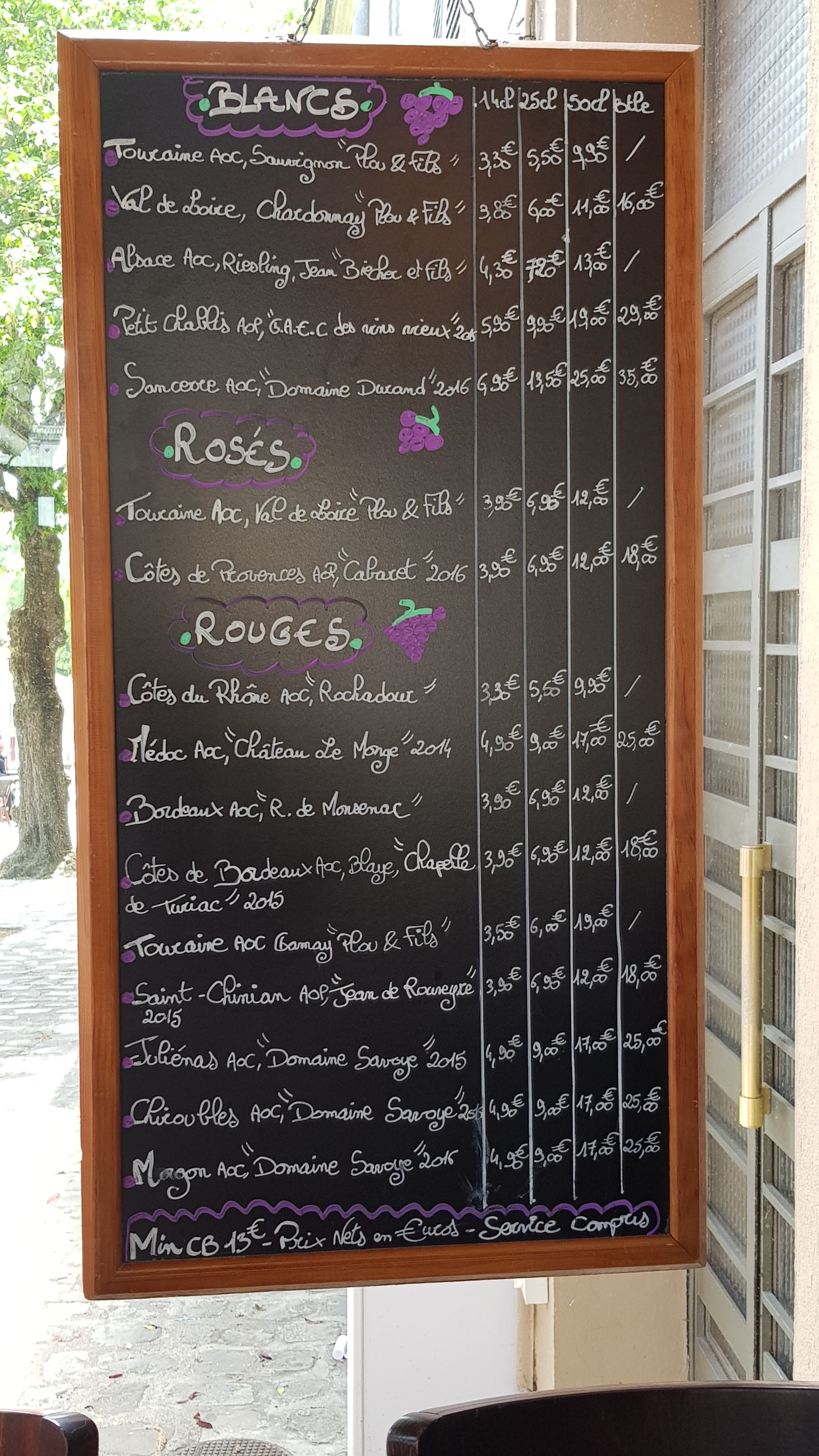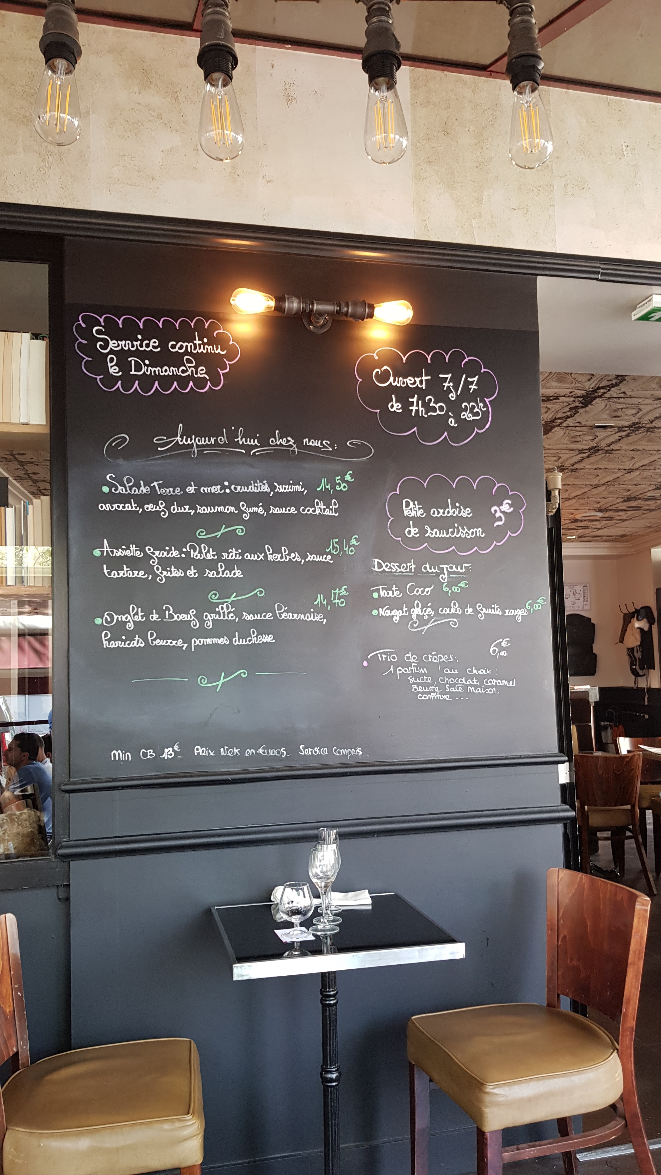 Ambiance sympa table trop serré Paiement en cb à partir de 8€ indiqué en bas d une ardoise en tout petit limite vente forcé