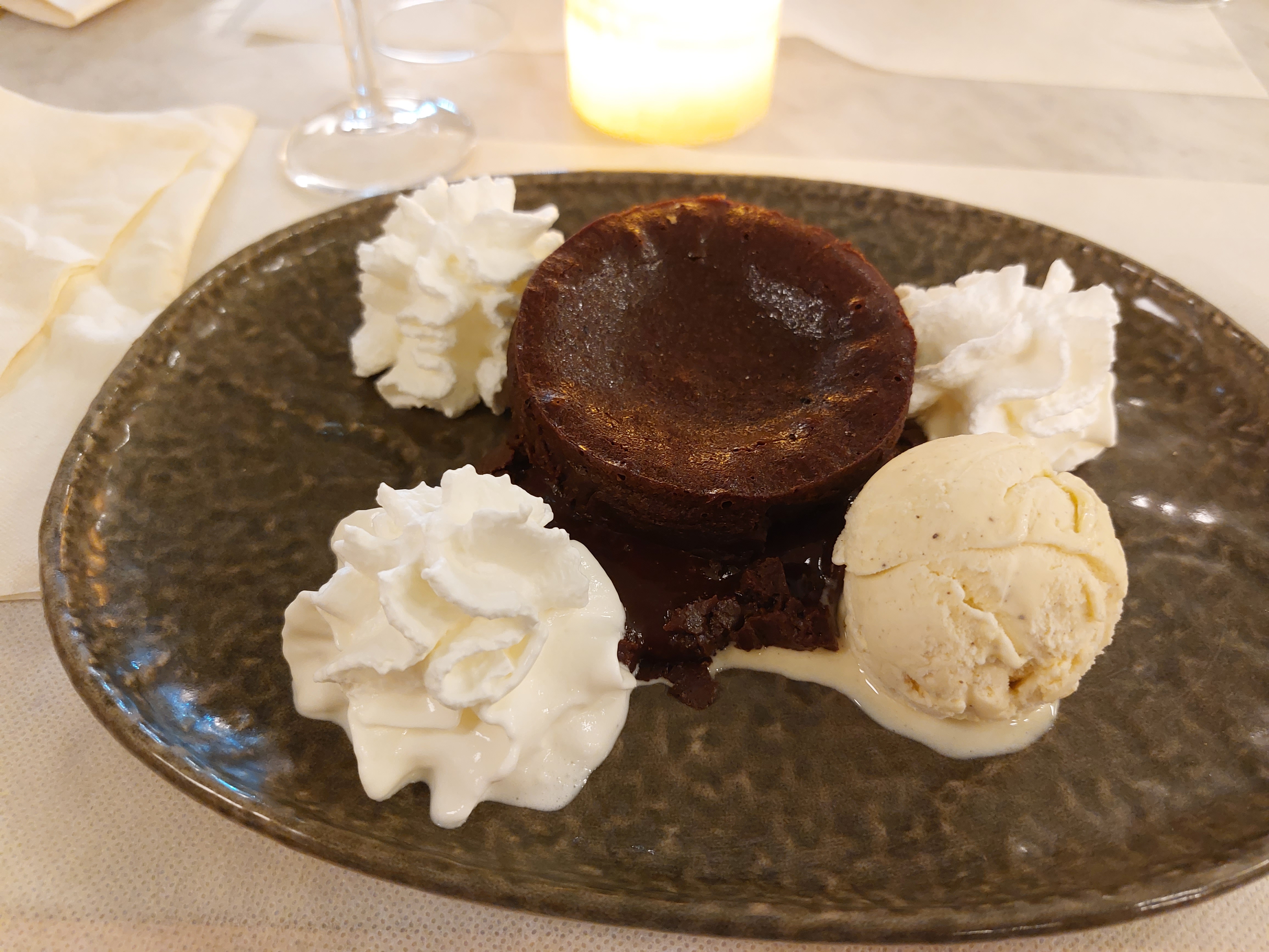 Le service est irréprochable, par contre le dessert brochettes de fruits frais,sablé et sauce au chocolat à 8€ est un peu limite pour le prix.