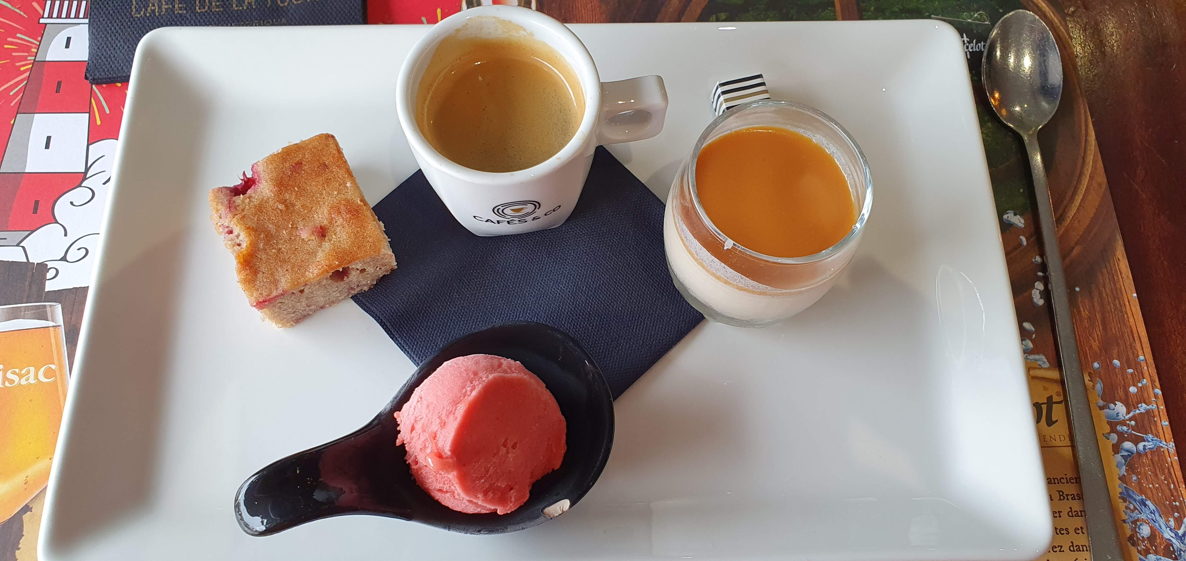 Première repas, un soir j'ai pris une galette au poireaux et pétoncles, pas bon du tout, très amer les poireaux alors que j'adore ça, café gourmand bon, mes enfants ont pris de la pizza Margherita pas bonne dommage. Second repas steak 300g frite bon j'y retournerais pour tester.