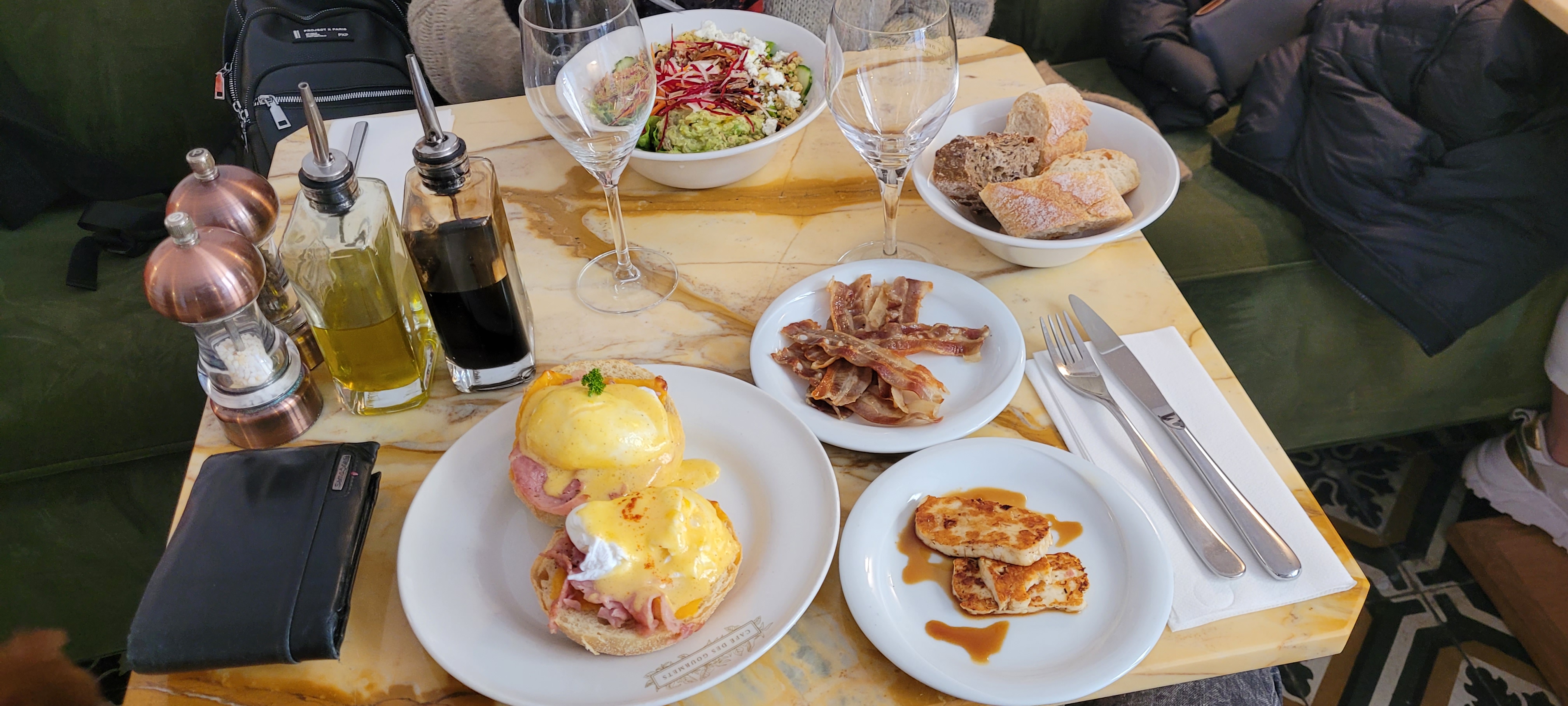 Joli cadre, bon menu mais des détails à retravailler. Sur les 4 oeufs Bénédictes, 3 étaient mollets et 1 presque dur. Les œufs pochés doivent avoir le jaune complètement coulant. Personnellement, je préfère les English muffins que le pain brioché servi avec. Trop de fioriture sur les pancakes dont un pas assez cuit. De bons pancakes avec blanc montés en neige bien moelleux se suffisent avec quelques fraises fraiches et un coulis de chocolat blanc. Service très lent et manque de quoi s'essuyer les mains dans les toilettes.