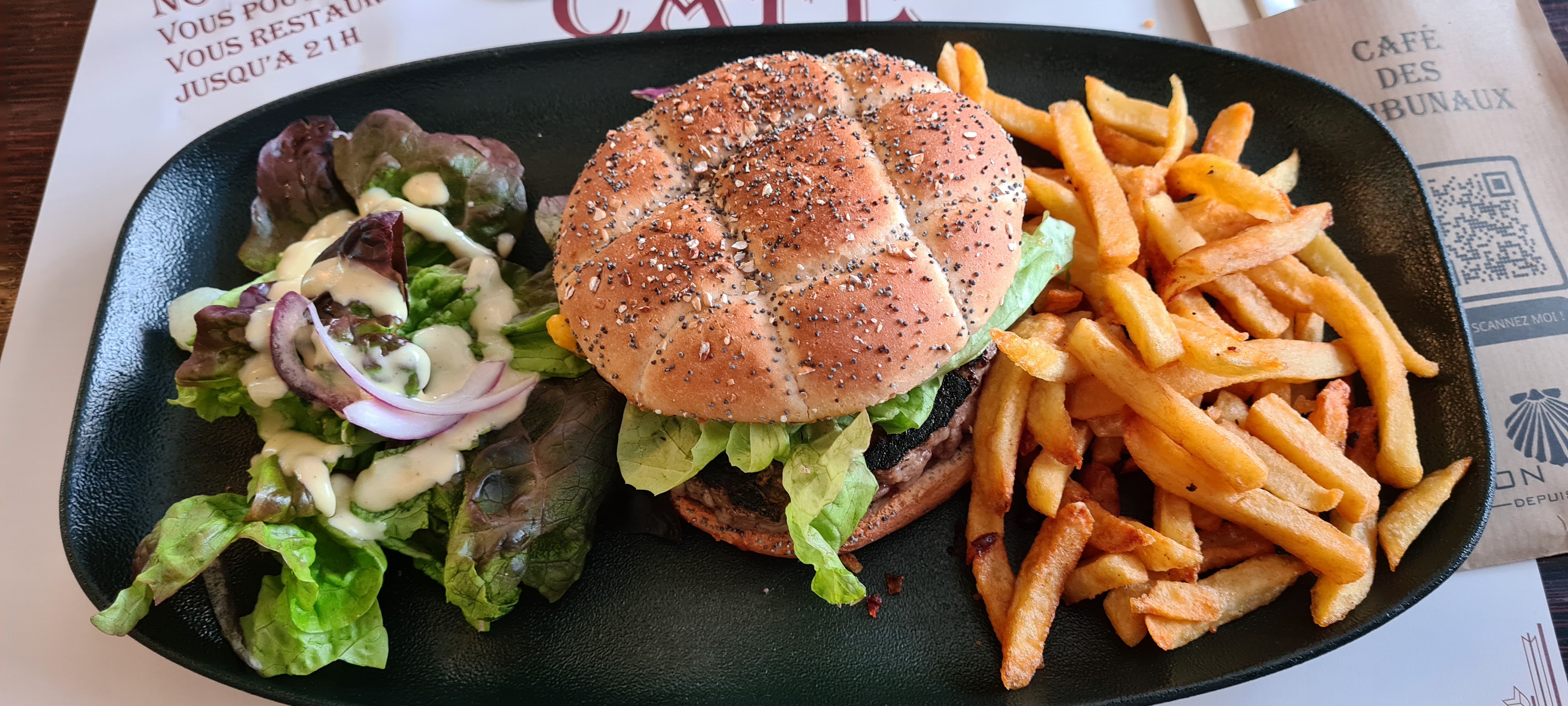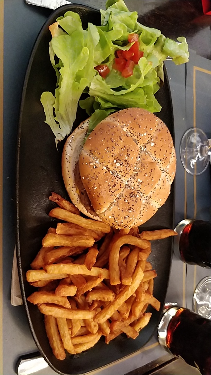 Chouette ambiance à l'intérieur du café, très belle déco. Nous avons commandé un des plats du jour : hamburger montagnard, frites et salade, les plats étaient très bons. Plats de qualité et prix corrects.
