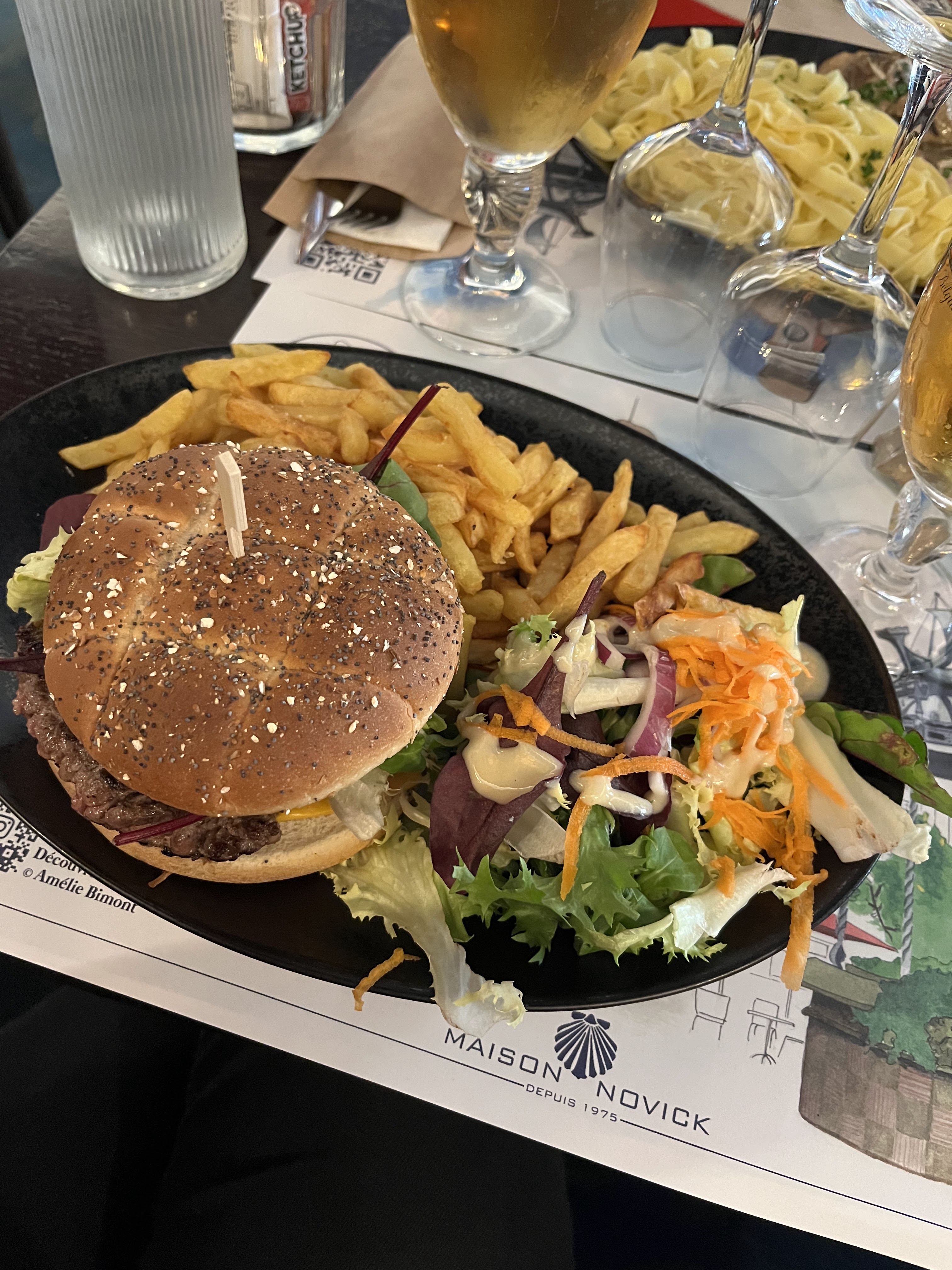 Personnel sympa Bien situé dans la rue piétonne Pas d'attente à midi Bon burger frite normand à 17 € malgré le pain trop grillé Toutefois une petite carte peu de choix mais du coup pas de gâchis en cuisine 👍