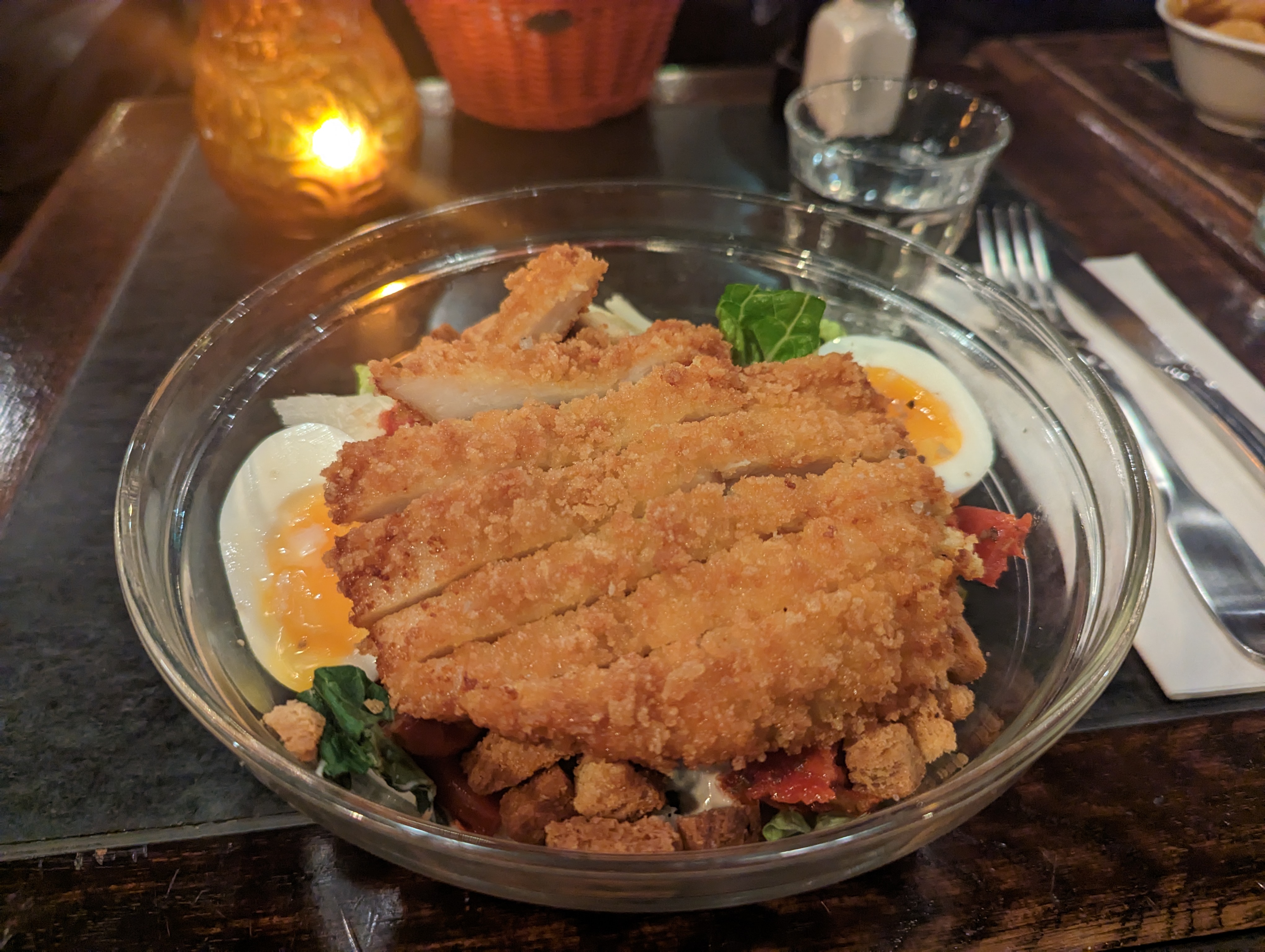Bonne salade césar. Le quart de vin est servi directement dans le verre, non visiblement 'métré' ; je préfère pour ma part avoir une carafe de 25 cl. Serveuse et service très sympa