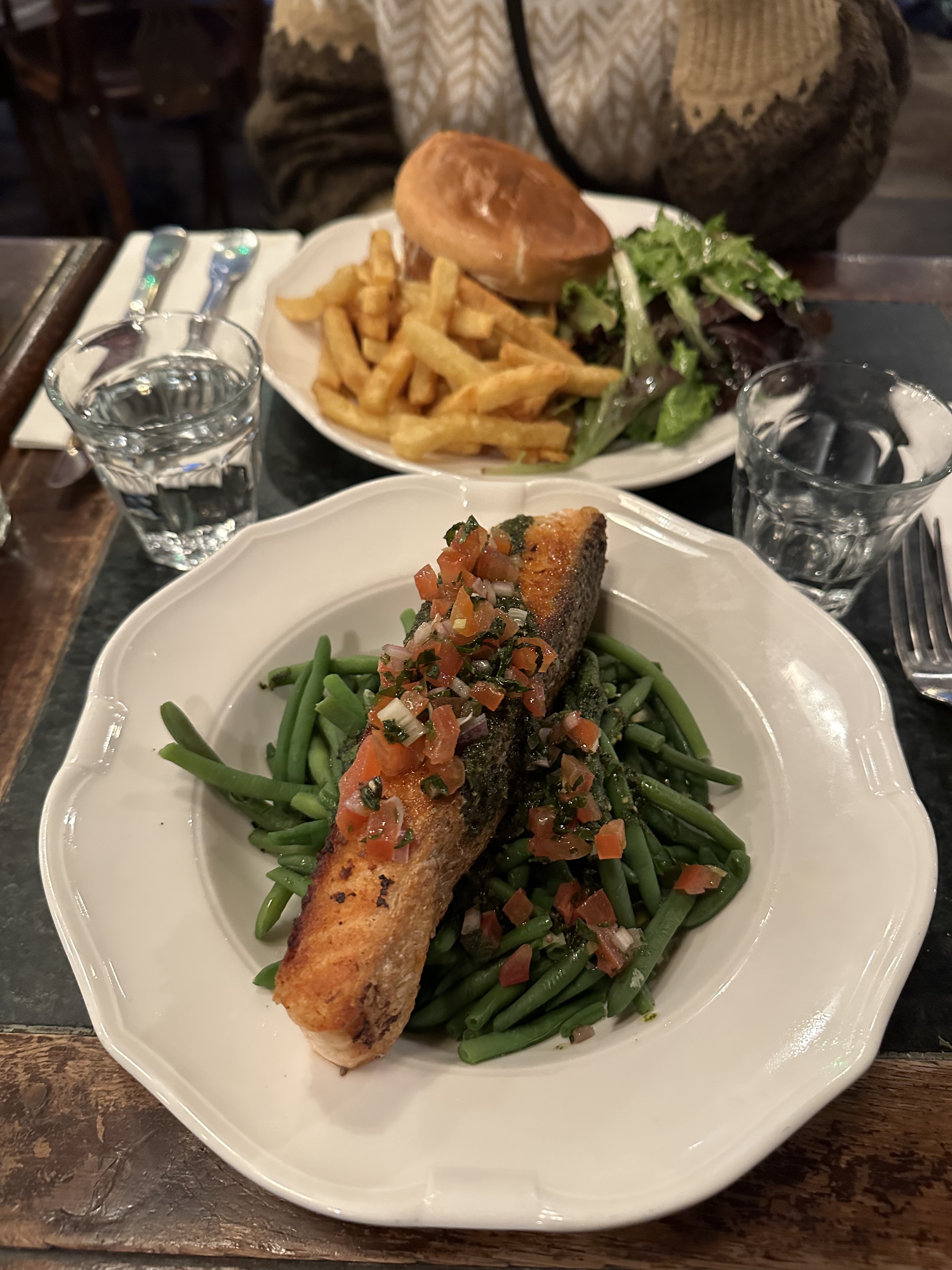 Cuisine au-dessus de la moyenne dans un quartier très branché de Paris, Café Divan Le Café Divan était notre premier repas à Paris, et même si ma copine et moi n'avons pas été époustouflés, la nourriture était quand même excellente et le service était le meilleur que nous ayons connu à Paris. Le restaurant est situé dans un quartier très branché de Paris et est idéalement situé pour dîner et prendre un verre. Le service a dépassé nos attentes et était de loin le meilleur service que nous ayons reçu à Paris. Ce moment gênant où vous réalisez que le menu n'est pas en ligne et que vous ne vous souvenez plus de ce que vous avez commandé. eh bien, d'après ce dont je me souviens et d'après les photos que j'ai prises, j'ai commandé le steak tartare et ma copine a commandé le saumon, les deux. servi avec des légumes verts et un avec des frites. Le Tartare était délicieux, servi un peu frais. Le saumon était parfaitement cuit. Dans l'ensemble, le repas était très bon, sans être exceptionnel, et a été un bon début pour notre aventure parisienne. Je recommanderais certainement cet endroit car vous découvrez les bars intéressants de la région.