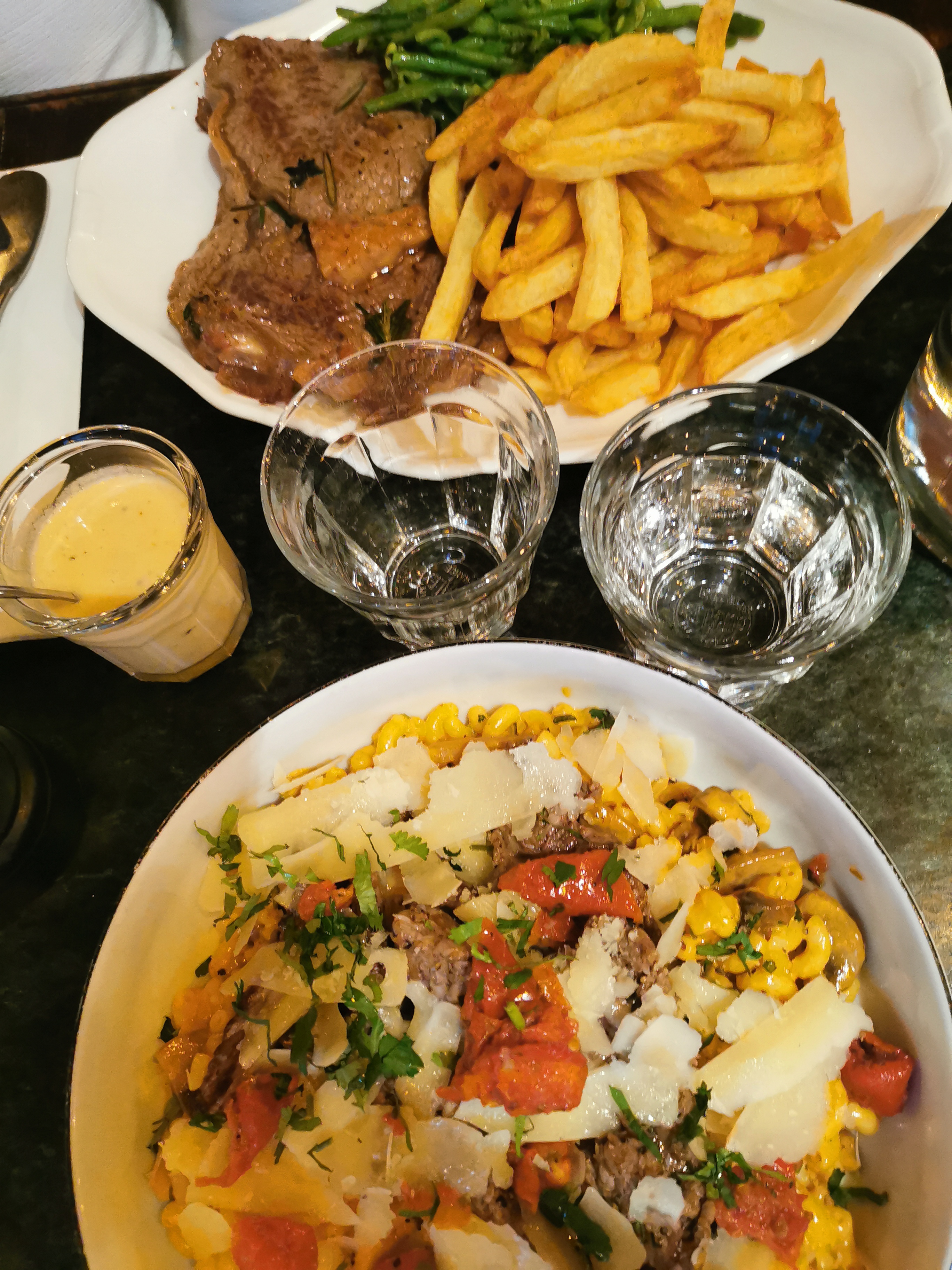 J'ai commandé deux steak frite, une salade César et du hachis de bœuf. Les steaks étaient avariés, de la viande avariée qui n'était pas cuite correctement et qui ne pouvait pas être coupée par les couteaux à beurre qu'on nous avait donnés. Nous avons laissé les deux assiettes non mangées. Les frites étaient des frites au micro-ondes et non frites. La salade César était trempée de vinaigrette et n'était pas du tout convenable. 80 euros pour notre premier repas à Paris et donc très déçu.