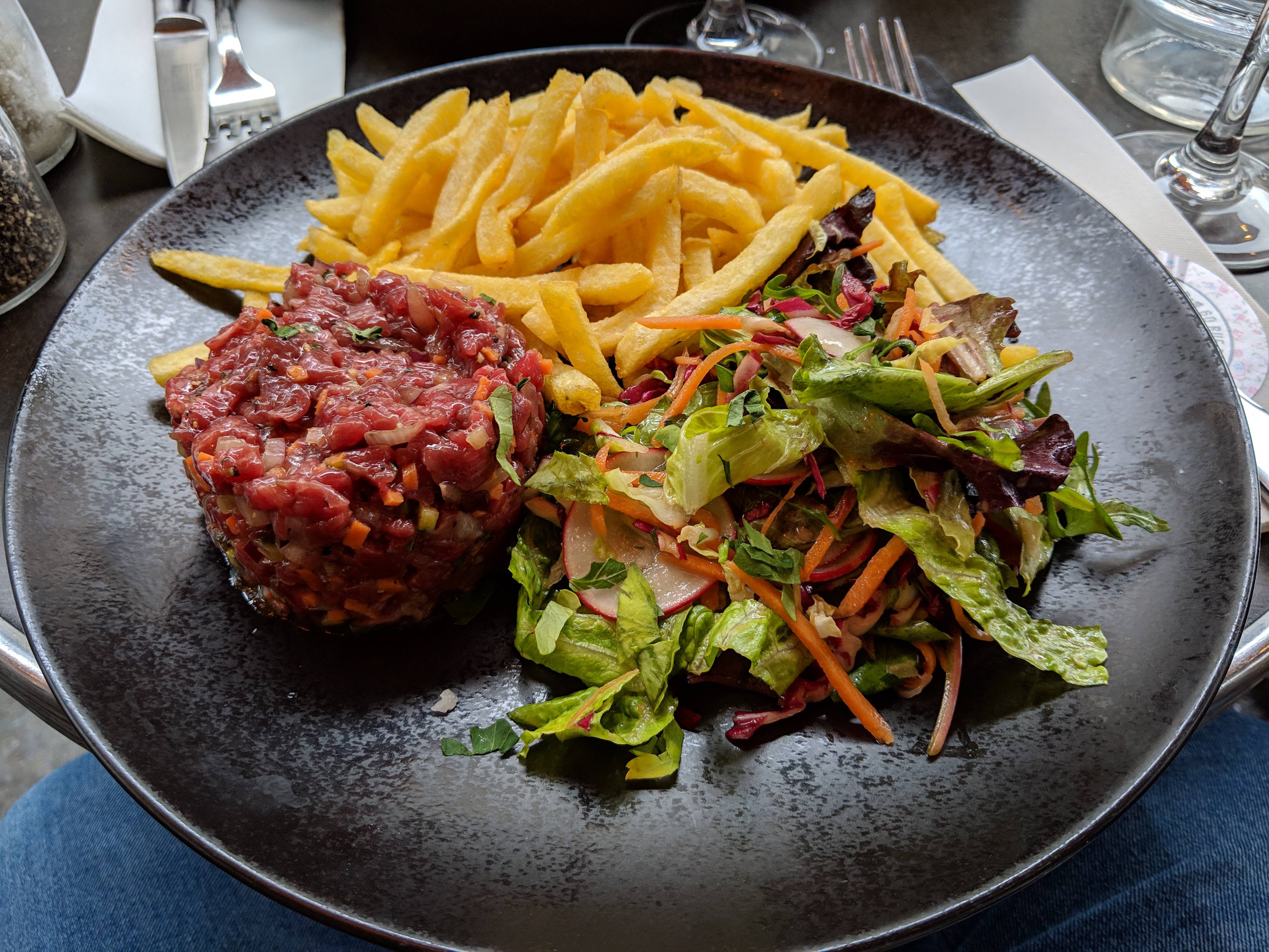 Accueil sérieux. Service pro manque un peu de chaleur. Terrasse agréable à l'écart du bruit. Dans l'assiette c'est correct. La cuisson du boeuf est top. La bavette n'en est pas une mais le morceau est bon.