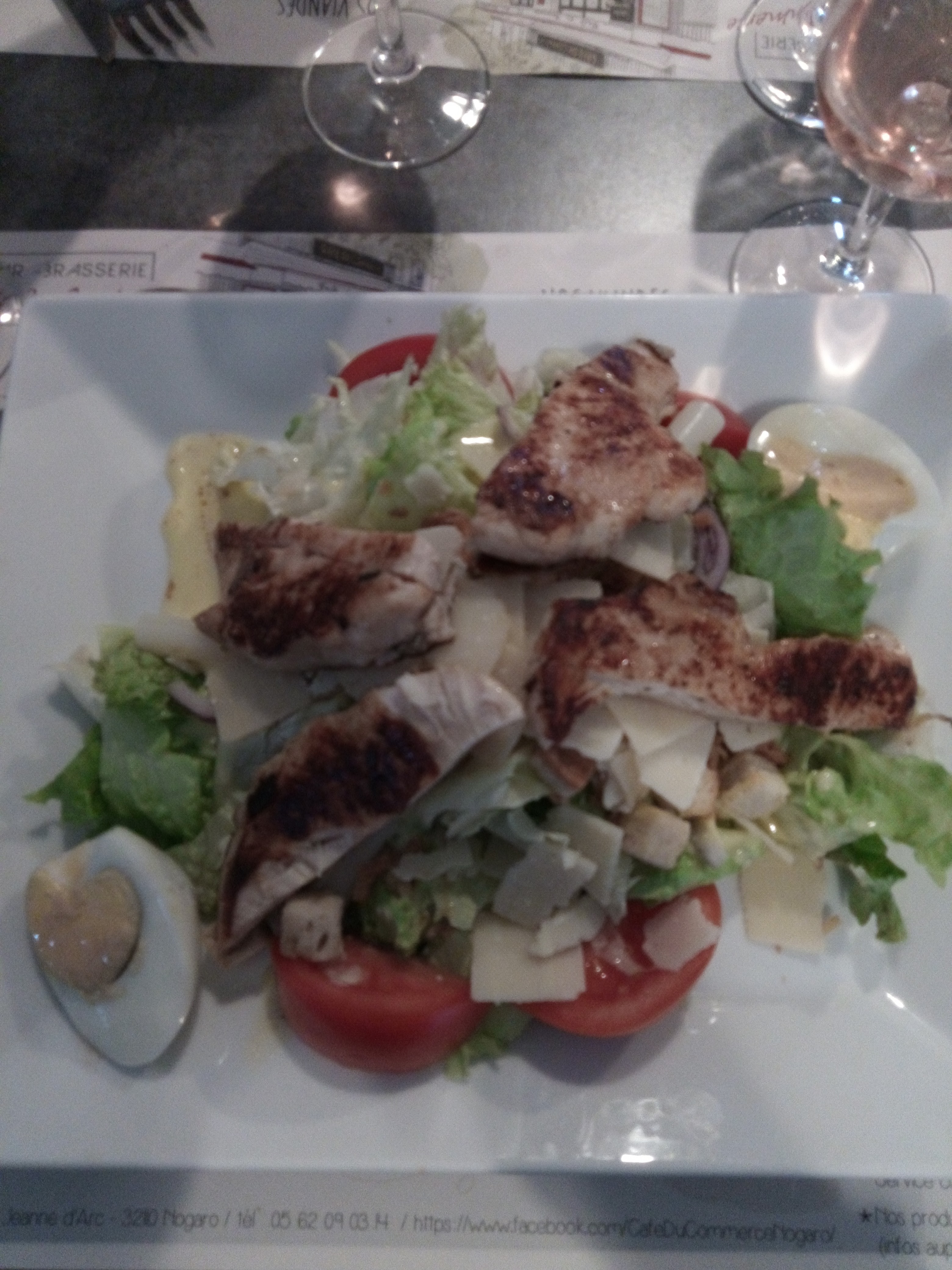 Un soir à Nogaro, où dîner ? Ce fut le Café du Commerce. Une très grande salade qui mérite son titre. Nous avons quand même pris un dessert maison par gourmandise. Avec un Côte de Gascogne rosé. Tout bien. Belle soirée avec des serveurs bien sympathiques.