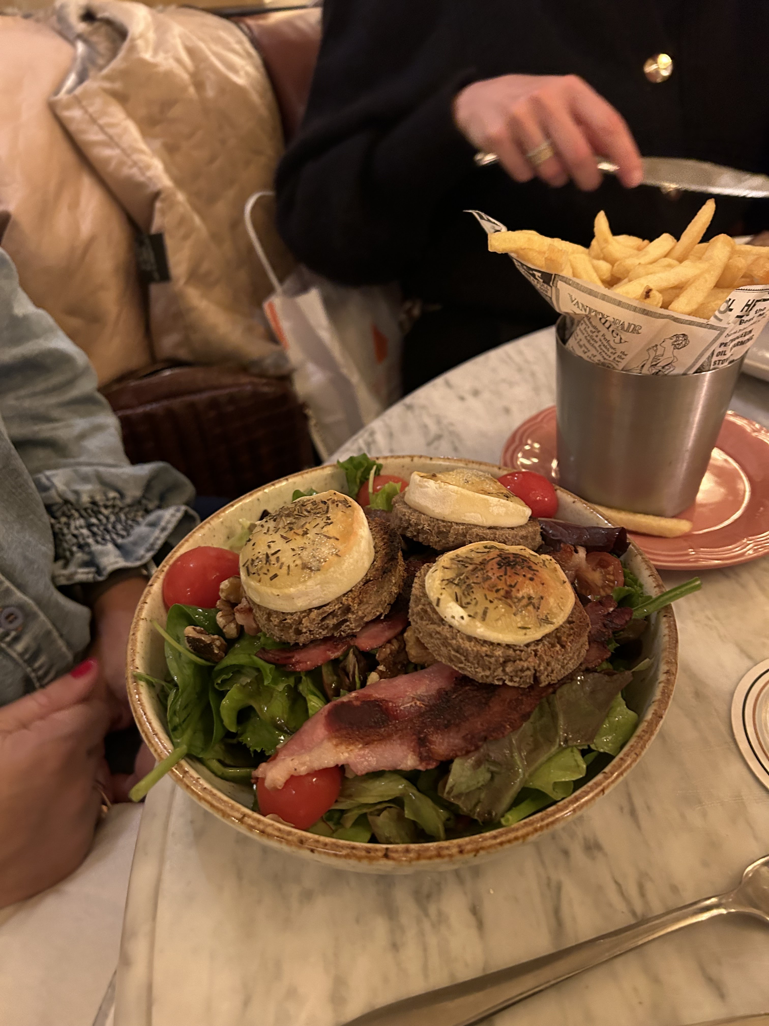 Bonjour, en balade à Paris avec une cousine américaine et son mari, nous avons manger une salade césar et lui un poulet au curry le tout super bon. Serveur extrêmement gentil. Service rapide. Nous avons pris notre temps à table. Je recommande ce restaurant. Merci