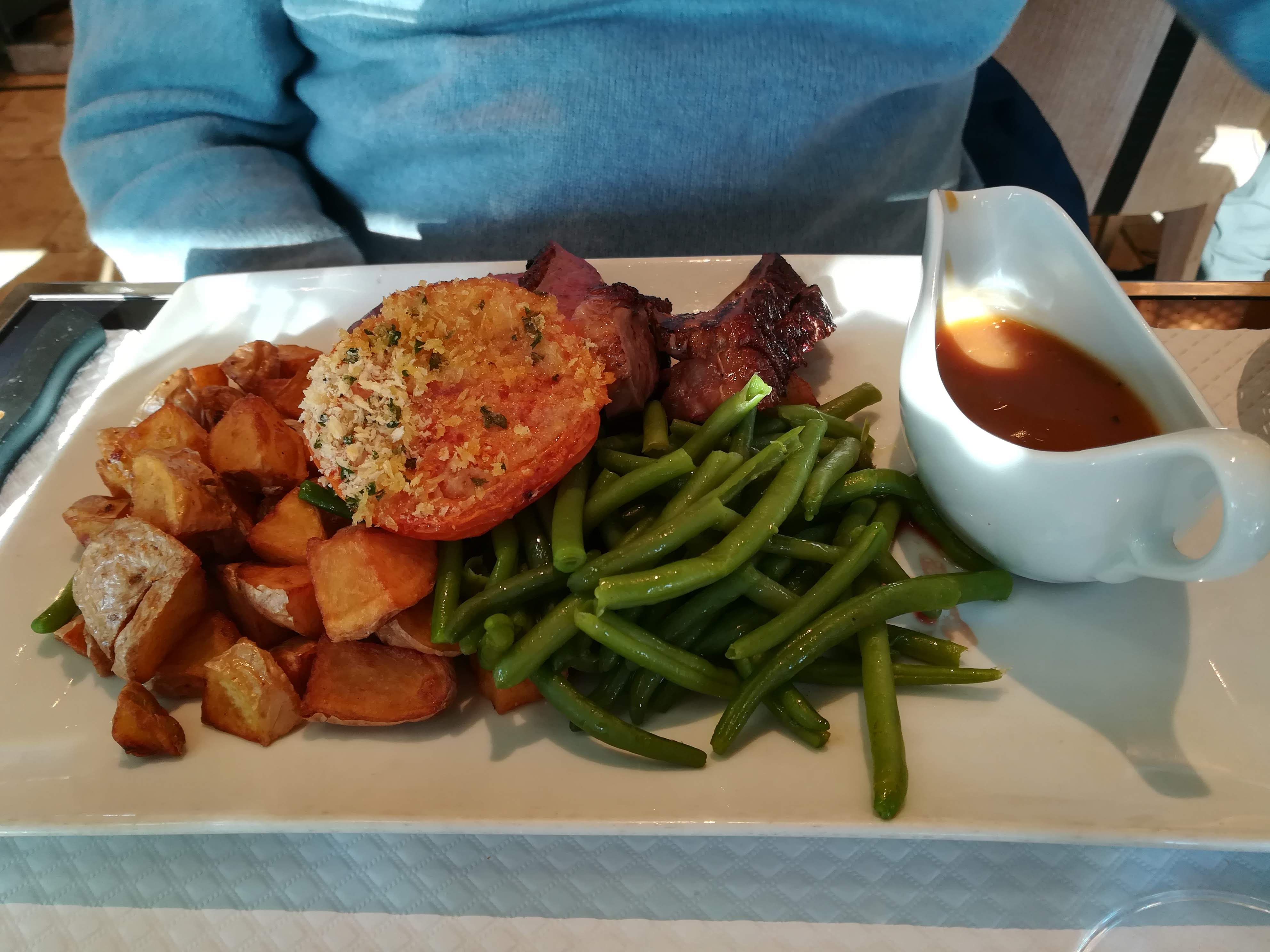 Leur menu à 18euros 50 était super. Un repas simple : une entrée (oeuf mayo ou rillette d'oie ou soupe de legume) + un plat (steak frite ou poulet frite ou patr bolo ) + un café et une petite mousse au chocolat. On est parti avec le bidon plein.