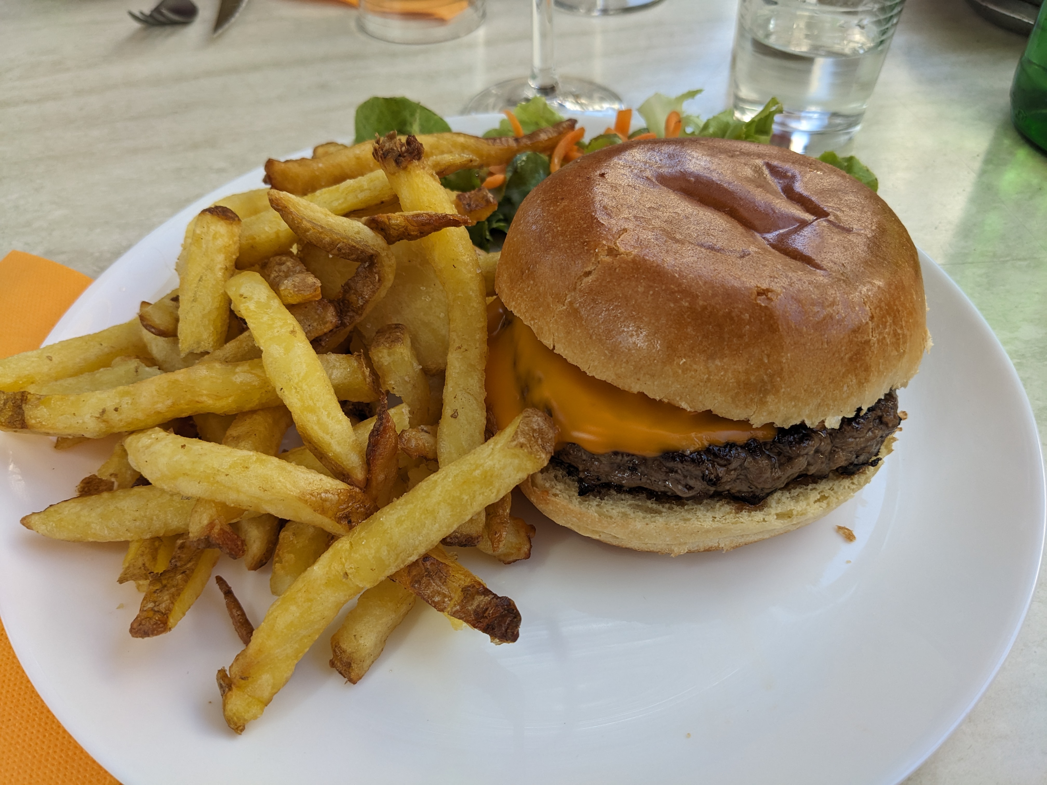 Guidés par des avis plutôt positifs sur l'établissement, nous sommes arrivés pour manger vers 13:30. Pas de soucis pour nous recevoir (d'autres personnes sont d'ailleurs arrivé bien plus tard sans problème) La carte était restreinte (période de fêtes dans le village) On nous a apporté les apéritifs mais pas de bouteilles d'eau... Nous avions pourtant précisé à la commande que ma fille de 5 ans préférerai boire de l'eau ! Il ne semble donc pas important pour l'établissement d'apporter de l'eau à une enfant de 5 ans. Il fesait pourtant 35*C à l'ombre ! J'ai du me déplacer jusqu'au restaurant (nous étions au bout de la terrasse) pour en demander une à 2 serveurs qui était devant la porte, vraisemblablement en pause car en train de discuter avec une cigarette allumée... Les plats sont arrivés (2 cheese Burger et un steak haché frittes pour ma fille) et sans être mauvais, ils était plutôt quelconques. Nous avons une fois de plus demandé une bouteille d'eau à la serveuse qui portait une commande à une table proche et nous avons clairement eu l'impression de l'importuner, que ce soit à la demande ou quand elle nous l'a apporter. Même impression quand nos voisins ont fait une demande similaire. Nous avons alors attendu plus de 30 minutes que l'on vienne récupérer nos assiettes et prendre la commande des déserts : mais personne n'est jamais venu... Pourtant les serveurs étaient encore et toujours en train de fumer et discuter devant la porte du restaurant... Le chemin jusqu'à nous devait être trop épuisant pour que quelqu'un vienne... Ce n'est pourtant pas faute de les regarder pour leur signifier que nous avions fini... Après cette longue attente nous avons préféré partir... Autant pour nous éviter d'attendre davantage dans la chaleur que pour leur éviter de devoir nous servir... Je ne sais pas si cela vient du contexte de fête, mais si c'est le cas. Passez votre chemin. Les serveurs doivent être bien trop fatigués.