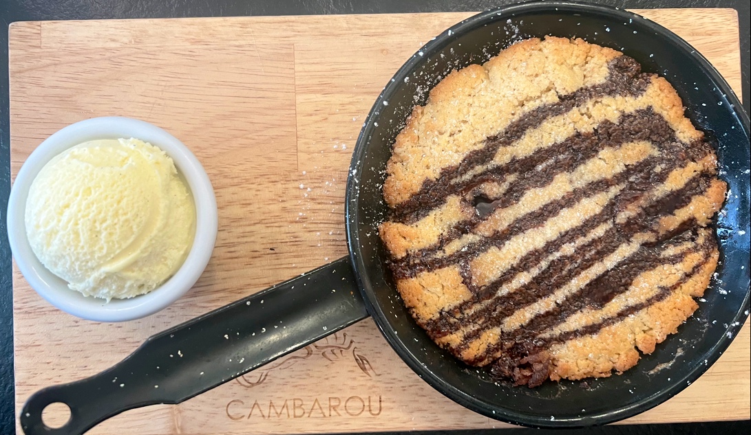 Délicieux cookie à la poêle avec sa boule de glace. Bon service