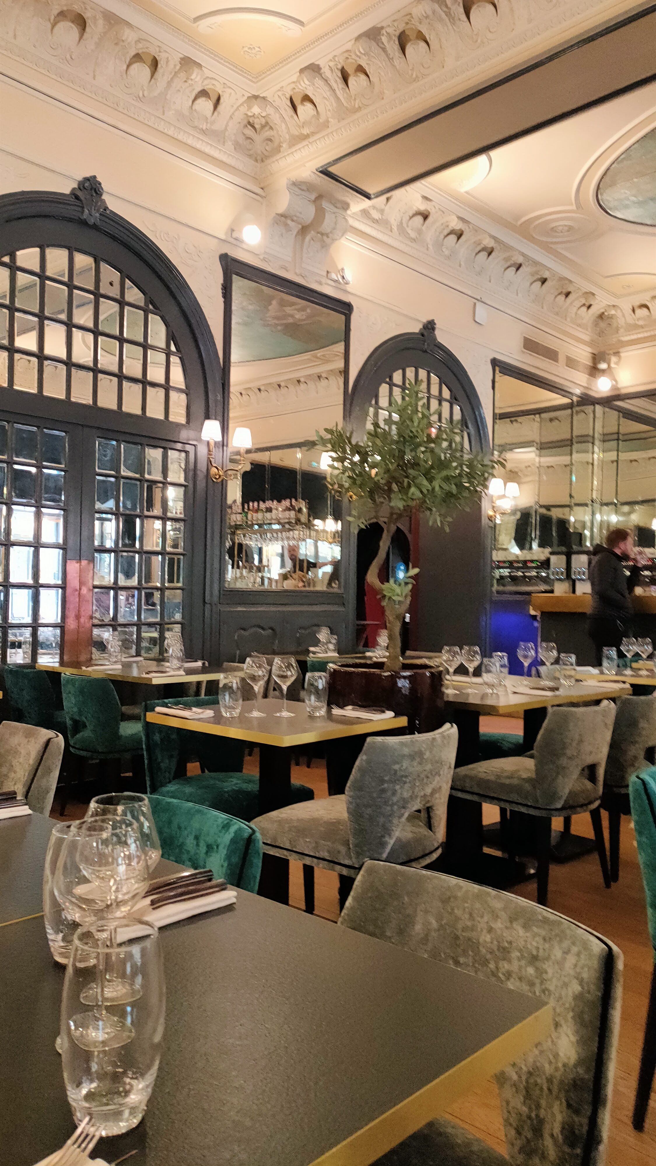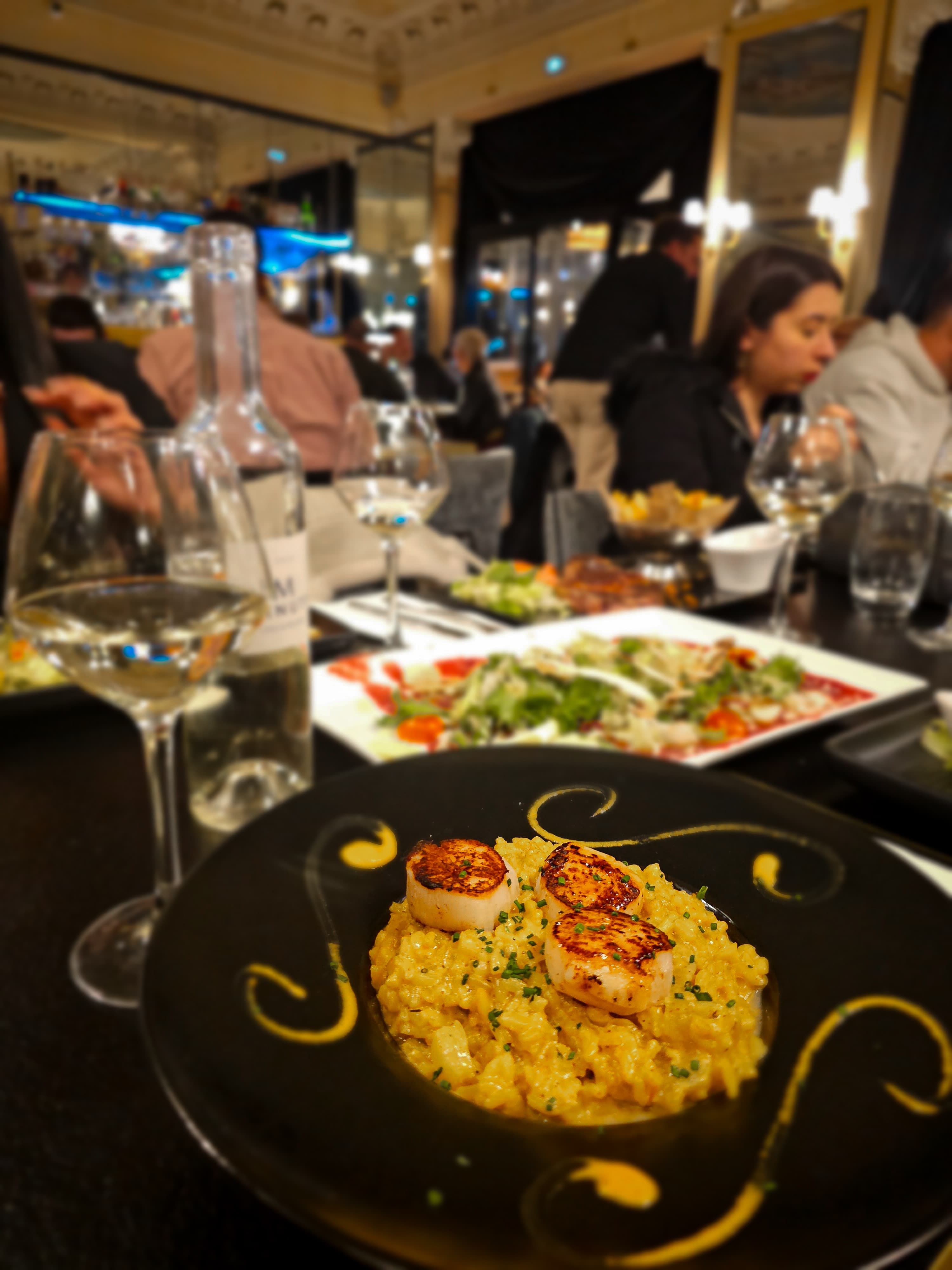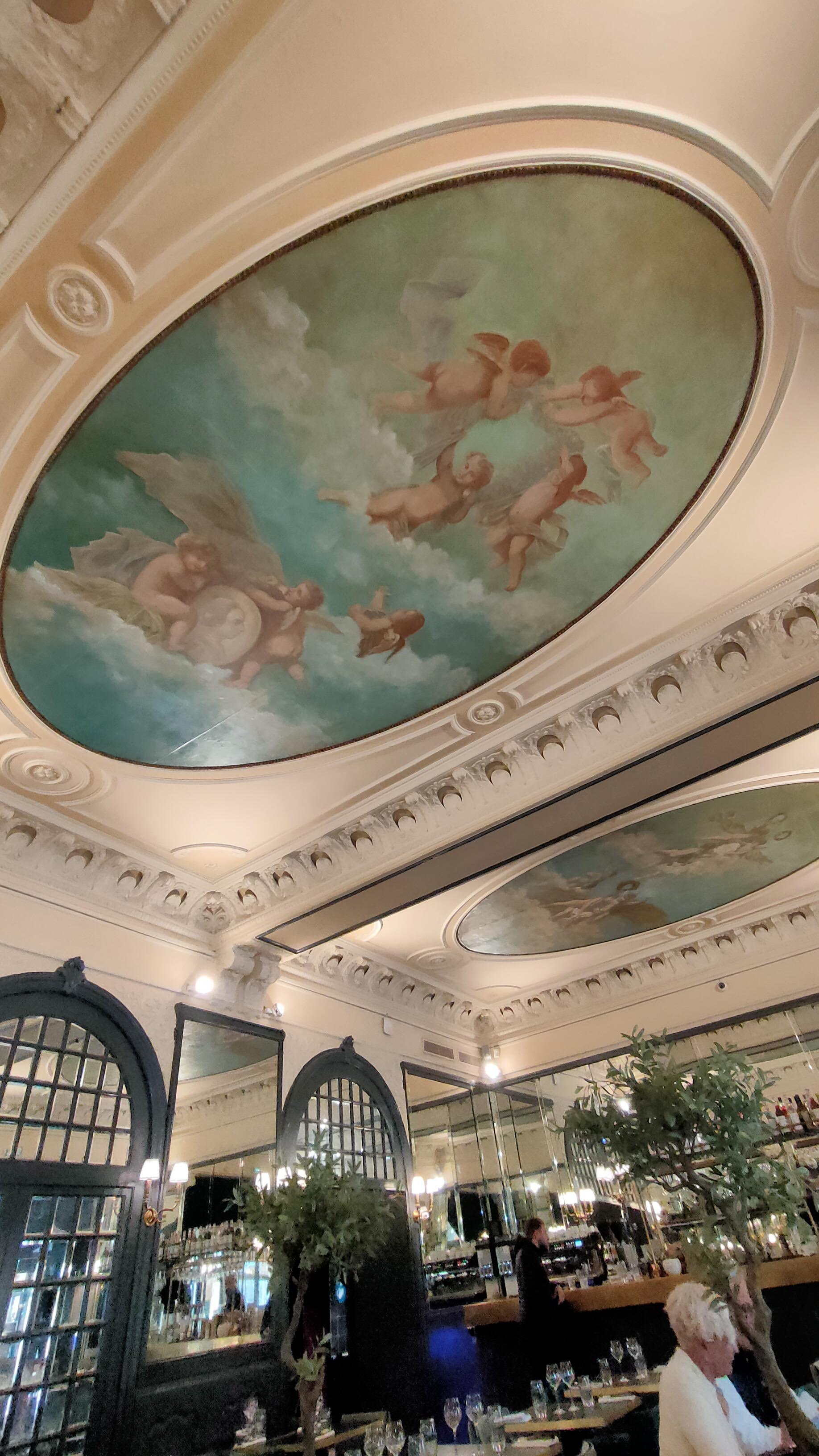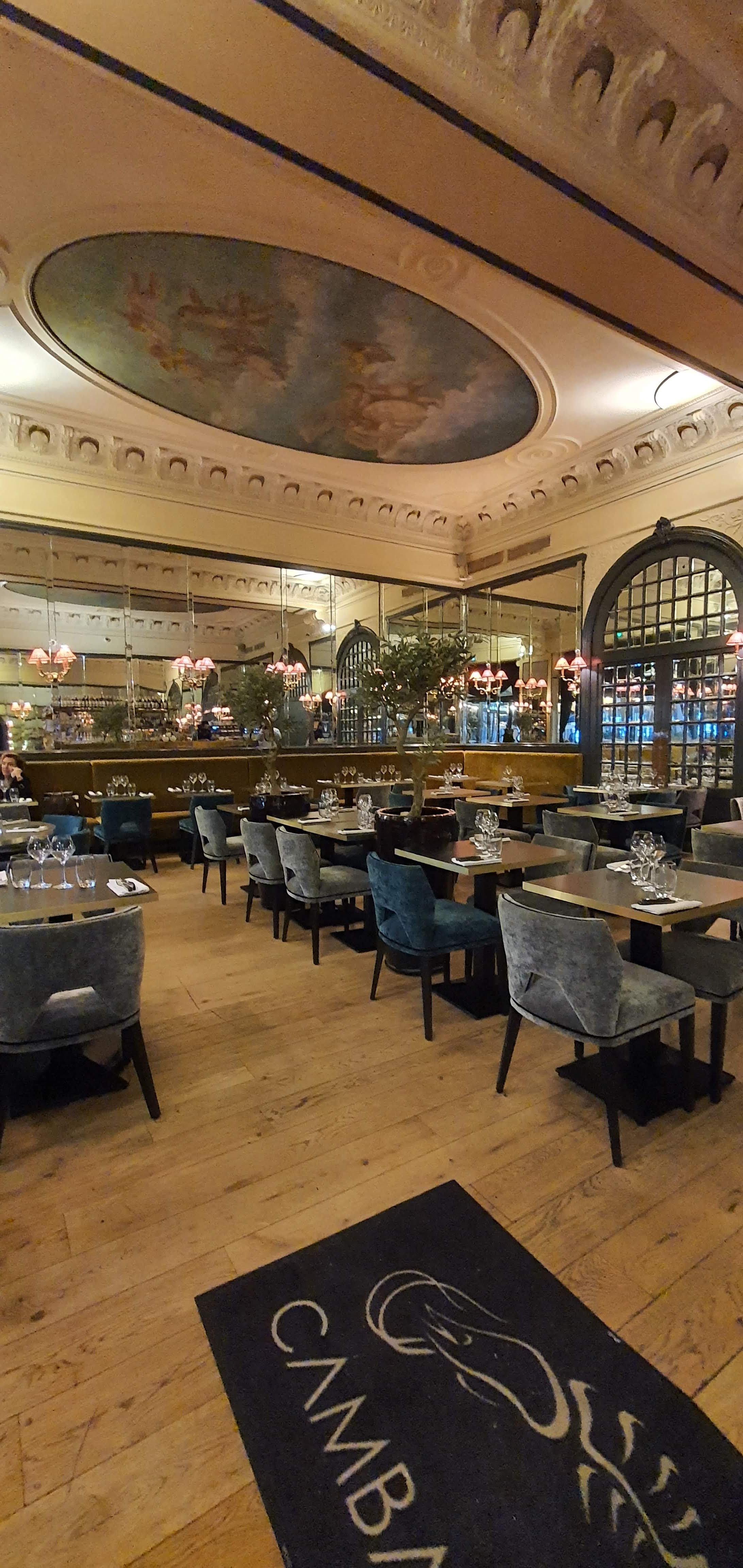 Bon diner dans un beau cadre. Œuf mollet bien accompagné en entrée puis Excellent Thon Rouge et grosses crevettes à la plancha. Et un superbe Irish Coffee pour terminer dans ce cadre historique avec ses plafonds classés. Un petit retour aux sources qui m'a ramené à un repas vers 1980, au fameux Mazarin qui occupait alors le lieu , puis au Bistro Romain et ses fabuleux Carpaccio, qui avait pris la suite… Une Bonne soirée …
