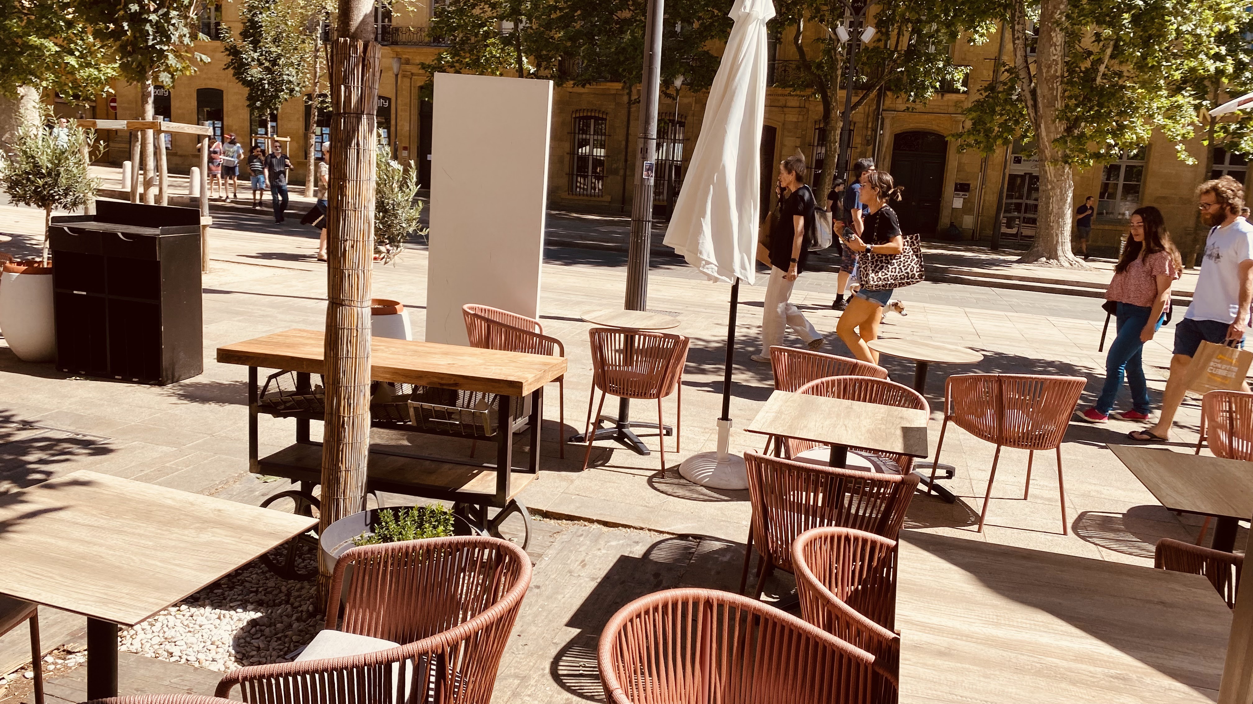 En guise d'accueil, une agression en règle ! A peine assis à l'une des nombreuses tables vides en terrasse à 22 h 30 pour boire un verre, une serveuse nous aboie dessus : Normalement on commence par aller à l'accueil et à dire bonjour Je n'en reviens pas ... D'où sort cette nana ? Je n'ai jamais entendu un truc pareil... pour qui se prend-elle ? Excusez-nous de notre inconsistance, on ne savait pas que dans un bar sur le Cours Mirabeau, il fallait décliner son identité à l'accueil avant de s'asseoir, au risque de se faire insulter par une gamine de 20 ans qui, visiblement, n'aime pas beaucoup son métier. Evidemment, on est partis sur le champ et ne sommes pas prêts à revenir, même pour boire un café, pas plus qu'à conseiller à quiconque d'y aller ! C'est simplement honteux ! Je me mets à la place des étrangers qui arrivent et sont traités comme ça, quelle image pour la restauration française ! On avait plutôt envie de vous donner un coup de main compte tenu du contexte, là, plus du tout, débrouillez-vous sans clients !