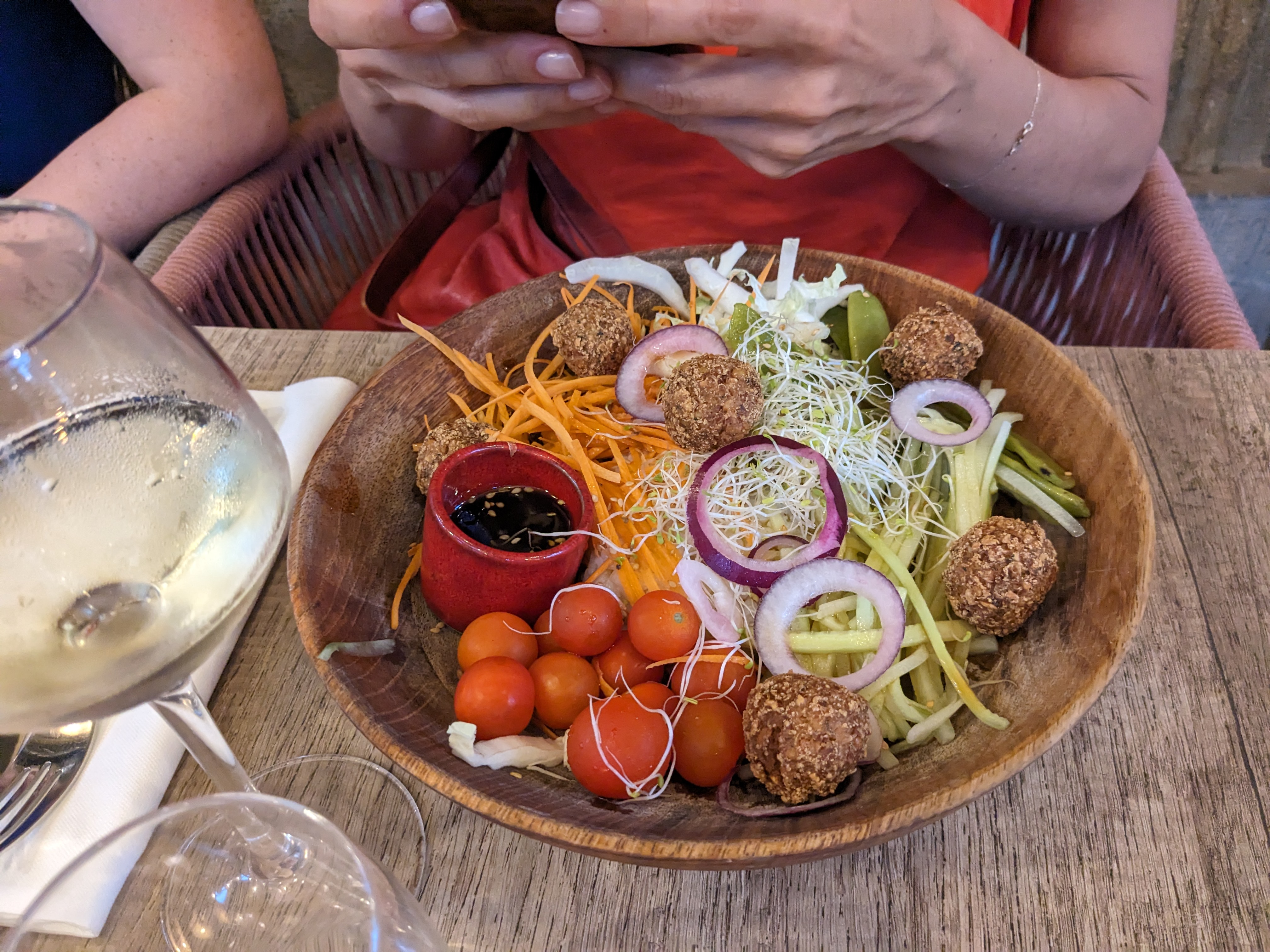 Personnel pas très accueillant, service (trop!) rapide, pas le temps de prendre une bouchée de l’apéritif que les plats étaient servis… en vacances on veut prendre notre temps et pas se sentir pressé c’est dommage! Mon poke bowl de falafels était bon rien a dire, une bonne portion, un peu plus de crudités aurait été apprécié. Mon copain a lui pris un thon rouge à la plancha, c’était bon mais peu copieux, il avait encore bien faim après… on peut trouver mieux comme adresse sur le cour