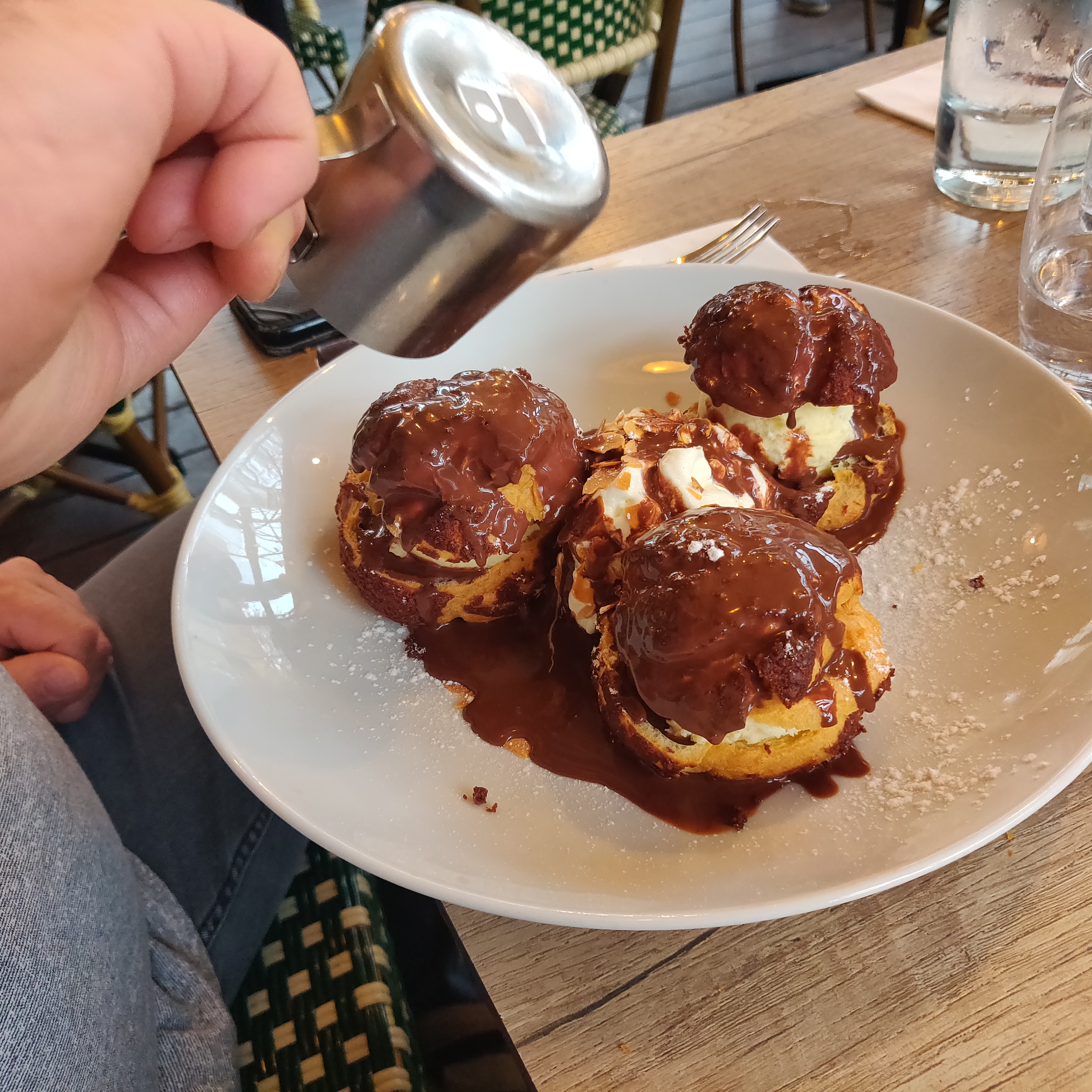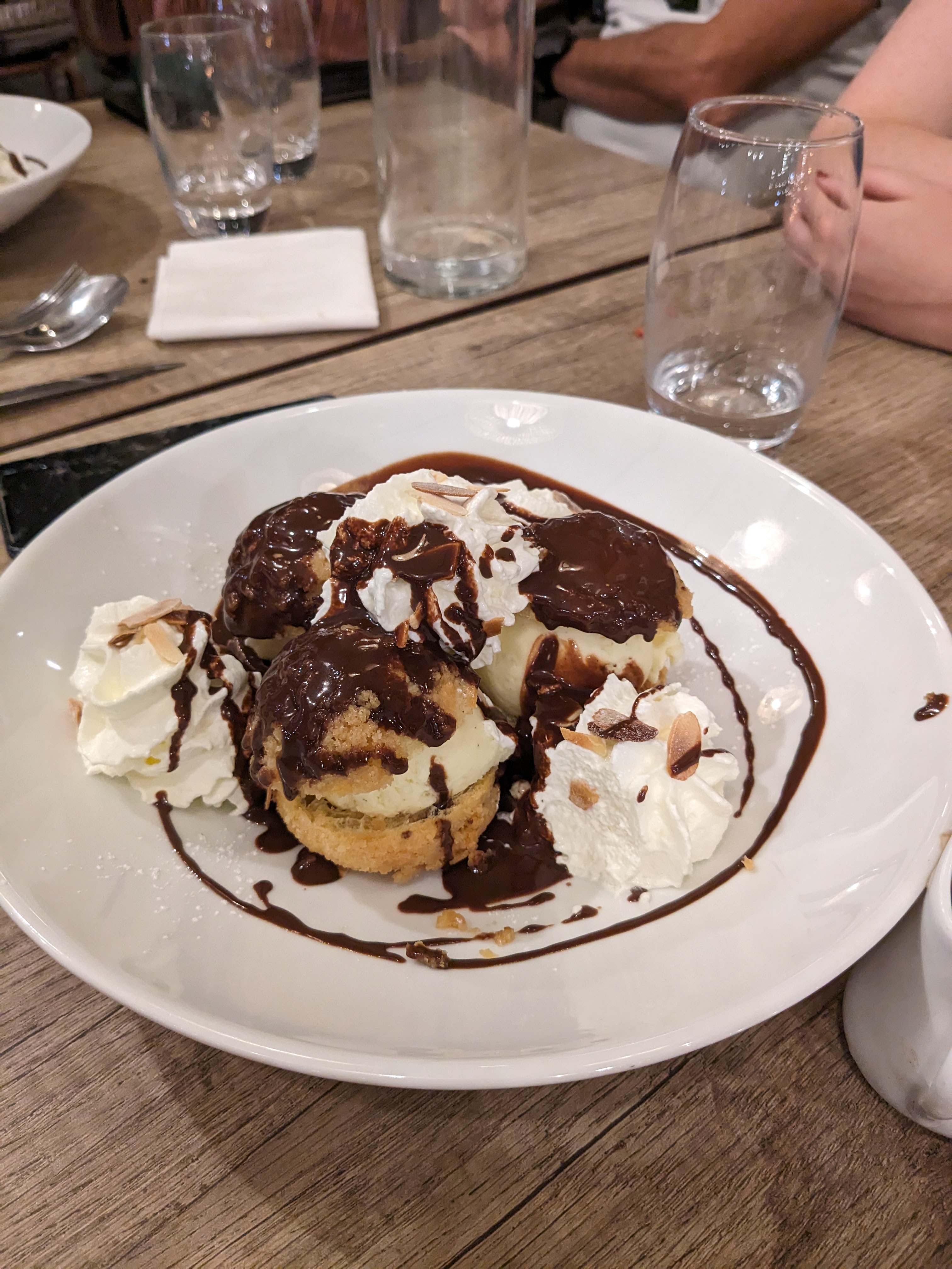 Lieu sympa mais propreté des verres a revoir...pas de pain! Seulement du pain aux noix et raisins. On a demandé du pain classique..réponse On na que ca... vous etes en centre ville et vous avez de quoi vous fournir en pain.... Repas classique rien de fou..quant aux profiterolles..essayez de soigner la presentation...on peut manger a 5 tellement c est lourdement servi.. Bref