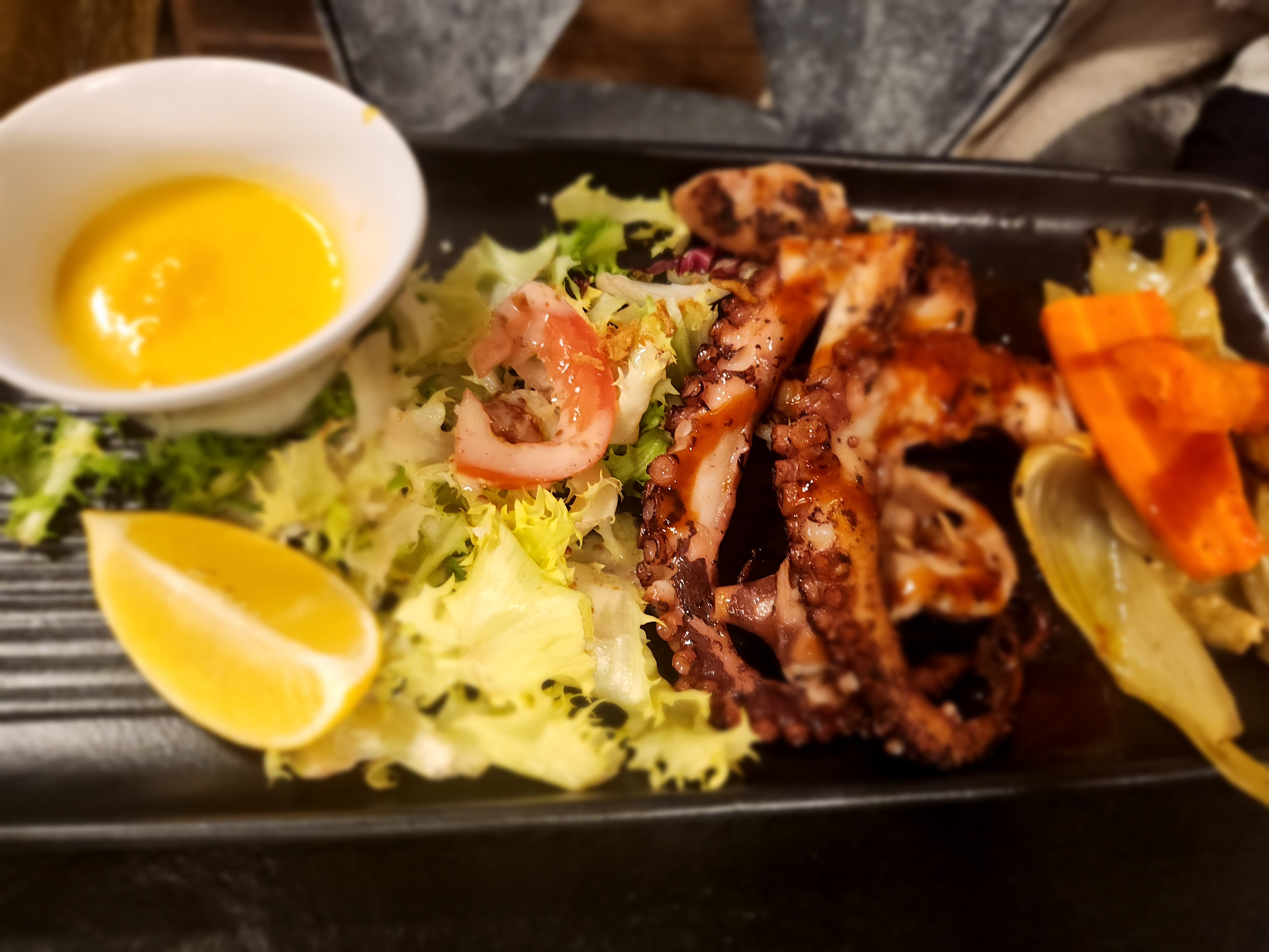 La salade de poulpe est à revoir. Aucune remise, aucun geste malgré le commentaire fait en réponse à la question « qu’en avez-vous pensé ? »… dommage. S’il vous plaît, rendez-nous un service: retravaillez la cuisson du poulpe !
