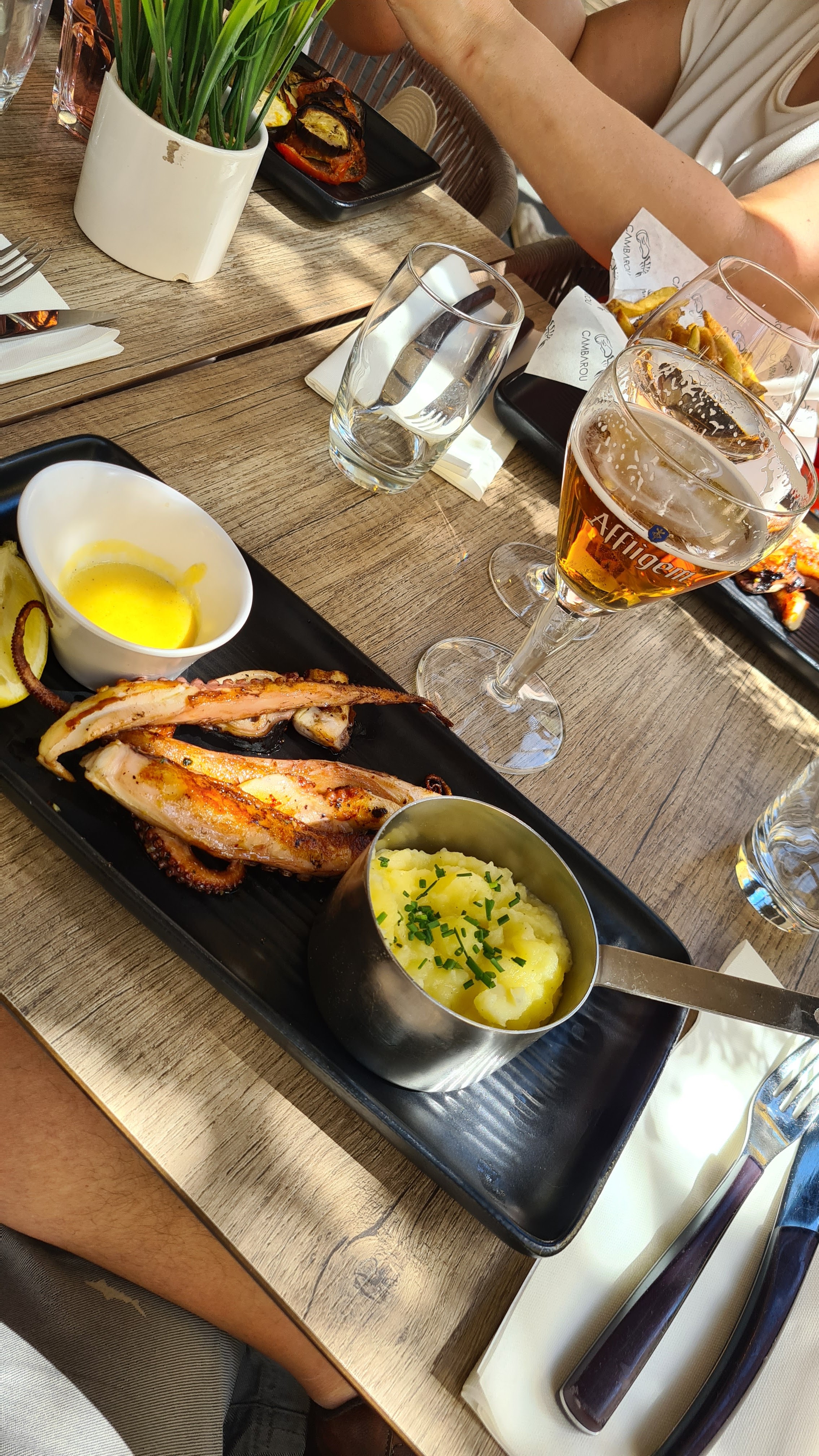 Service très très moyen ainsi que les cocktails qui ont été servi dans des verres à eau ! Nous avons pris 3 cocktail et 4 plats pour 190€ !! Compris 2 petite tentacules 11€ avec 3 gambas par personne 64€... Juste scandaleux, c'est du vol je ne recommande surtout pas cette adresse il y a bien mieux sur Aix-en-Provence et moins chère !! Payer c'est une chose mais payer pour ce résultat ça fait mal au cœur !