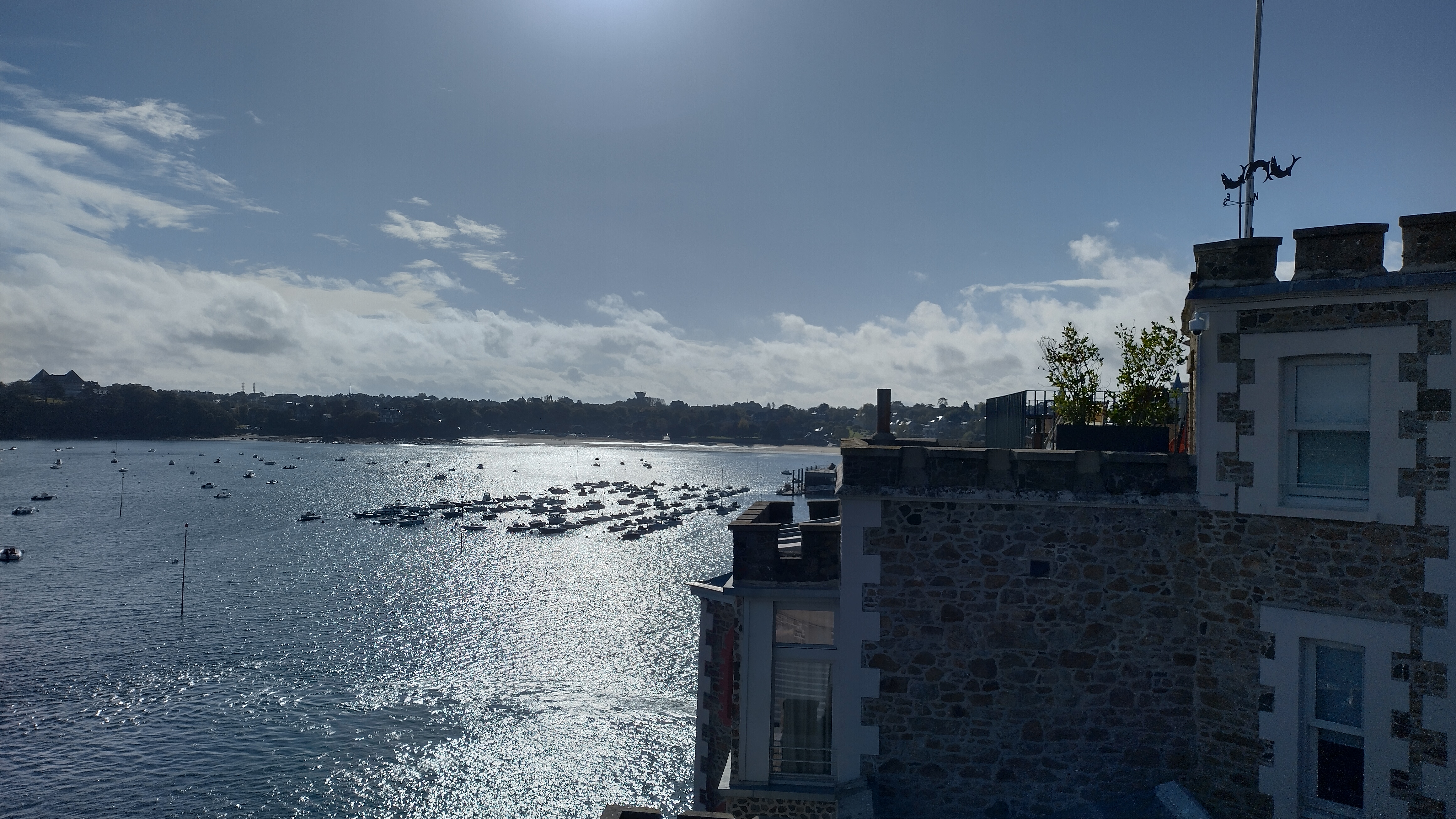 Castelbrac est un très bel hôtel, pas de doute. Pour cela pas besoin d'avis en particulier, la classification en cinq étoiles parle d'elle-même : vous n'êtes pas n'importe où. Cela étant dit cet endroit bénéficie d'un charme tout particulier, lié à la bâtisse, à son histoire, à son architecture et son emplacement. La vue sur Saint-Malo est parfaitement féerique, les chambres superbes, le bar à l'ambiance d'aquarium magnifique. Personnel très prévenant, fort sympathique même au bar. L'accueil est irréprochable, avec une arrivée ponctuée d'un cocktail d'accueil dans ce qui fut le bureau de Charcot, un cocktail de bienvenue à la main, assis dans un fauteuil profond avec vue sur Saint-Malo. Un magnifique séjour, qui met en avant la force première de Dinard: on y a vue sur l'autre côté de la baie.