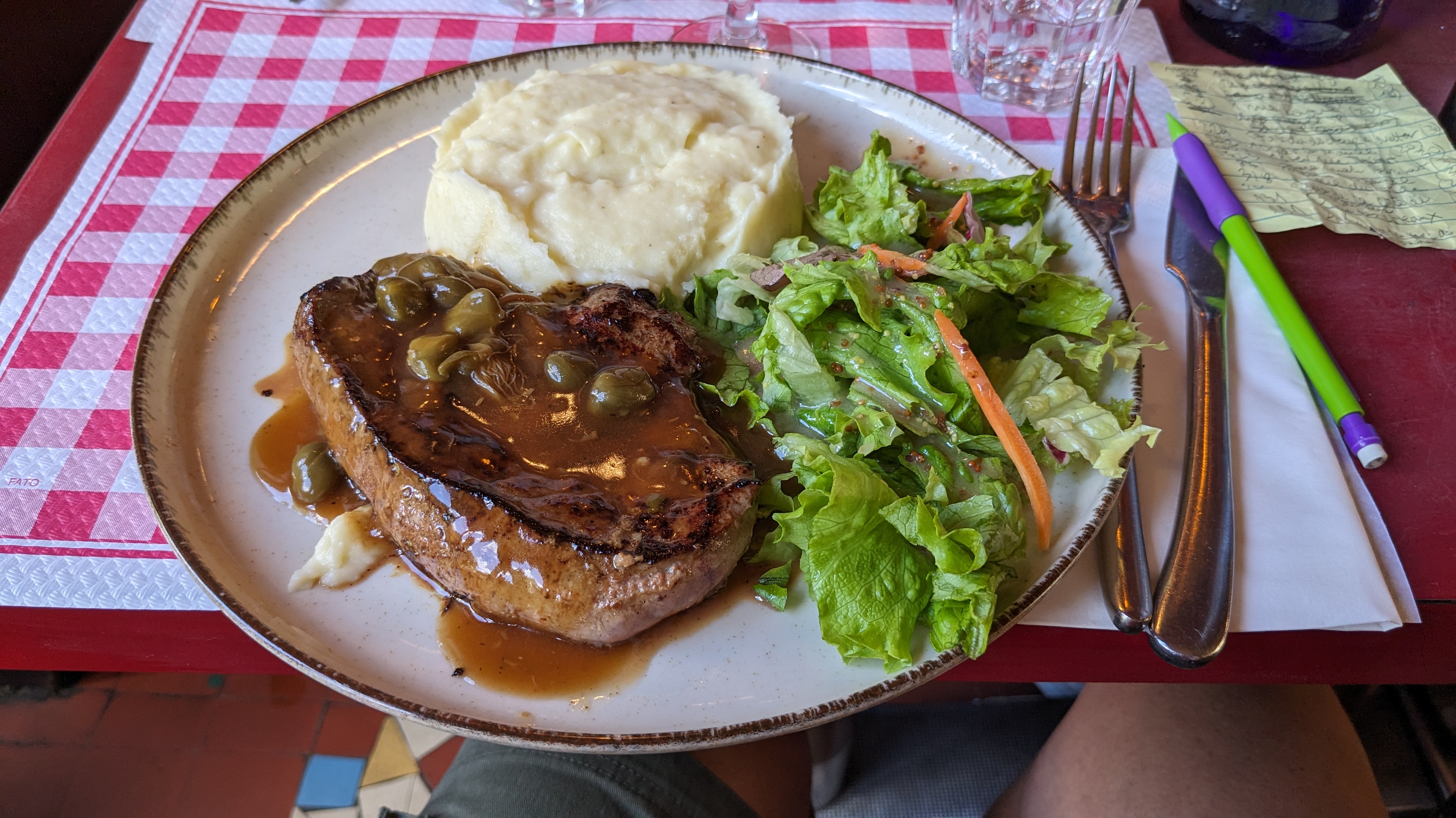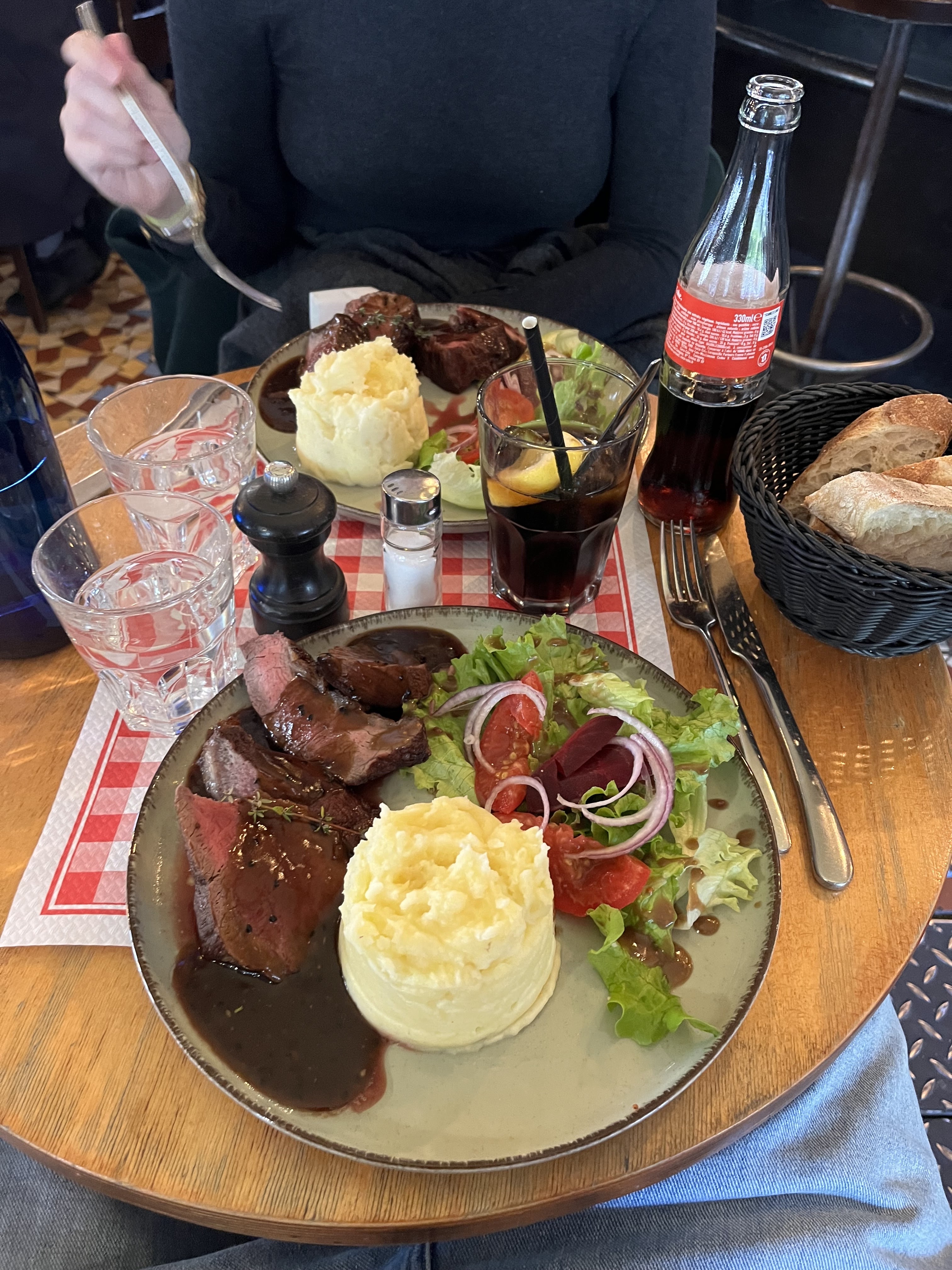 Bistrot sympa, service efficace. Nous avons pris le plat du jour ,entrecôte frites salade et une brioche pain perdue. Tout était très bon, service efficace et bon rapport qualité-prix.