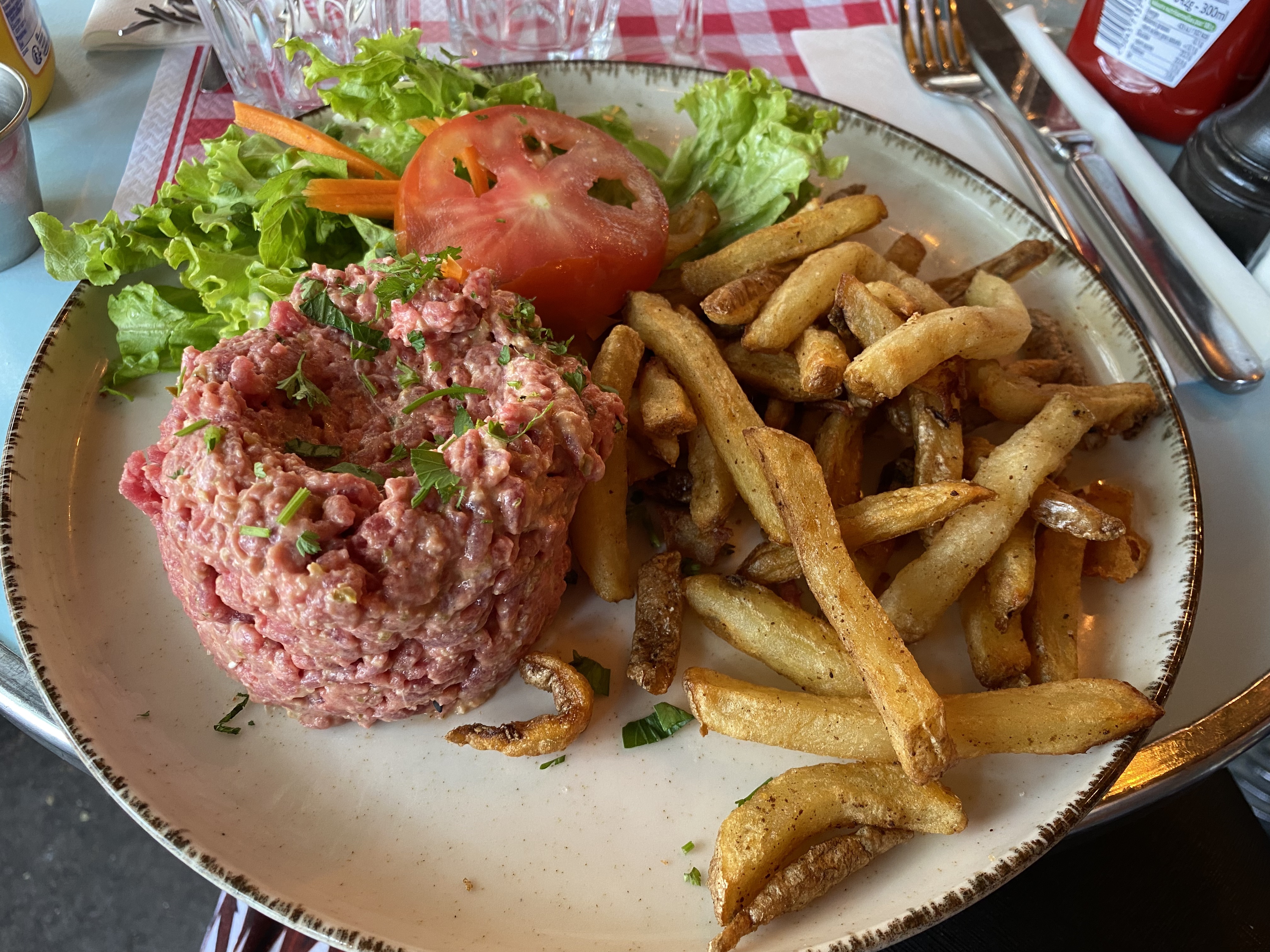 Le tartare n'en est pas un. Viande hachée trop finement. Restaurant mal ventilé. Vos vêtement s seront très parfumés en sortant. Très bon accueil, personnel chaleureux, très bonne ambiance, déco sympathique. C'est un bistro parisien classique, n'allez pas aux toilettes.