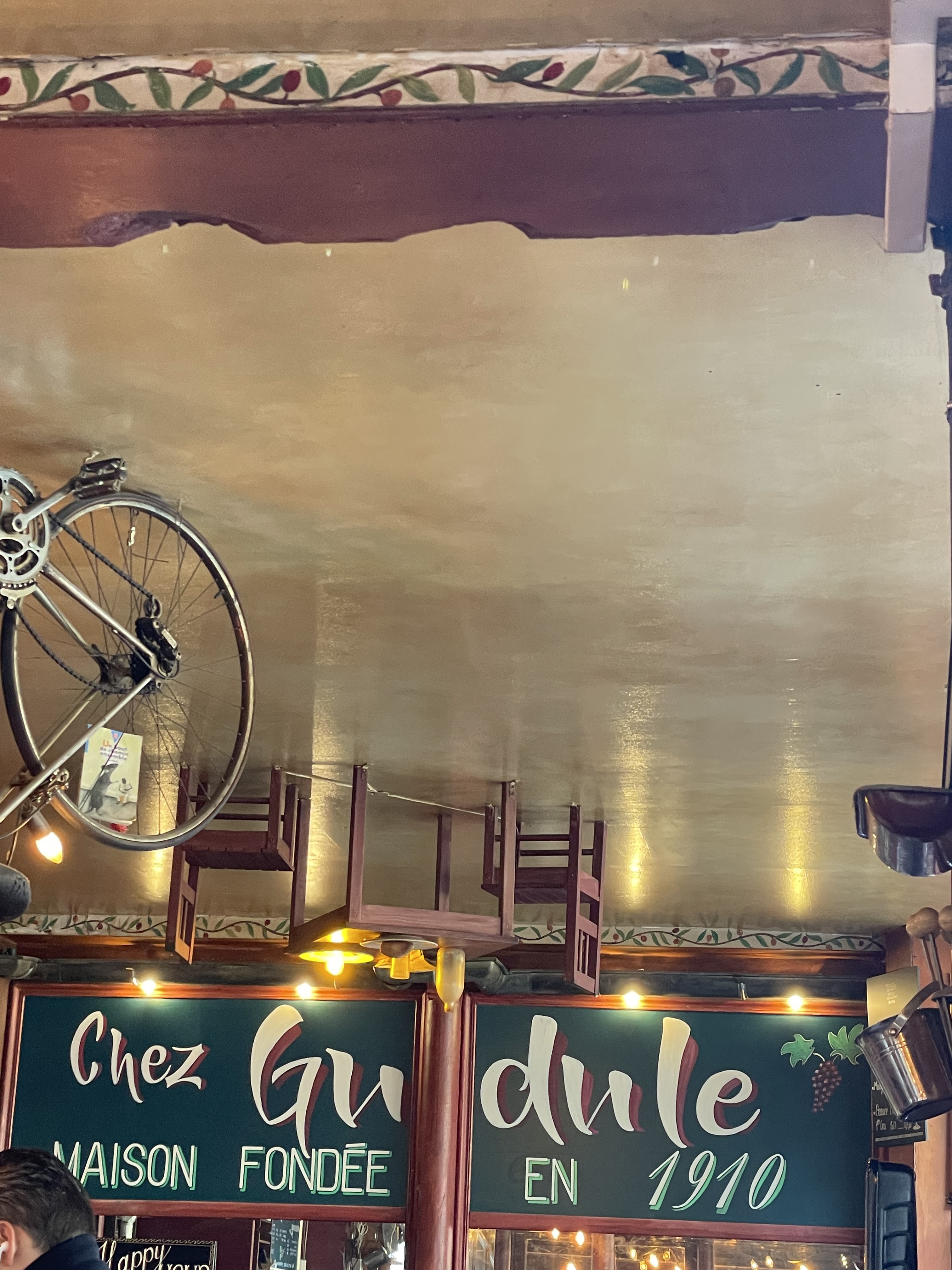 Si vous cherchez un bistrot sympa dans le 12ème, côté Daumesnil (ce qui n'est pas chose aisée), Chez Gudule devrait vous convenir. C'est simple et de bonne facture (ne cherchez pas non plus de la grande cuisine) et l'ambiance y est plutôt bonne. Et le décor, avec ses vélos suspendus au plafond, vaut le détour.