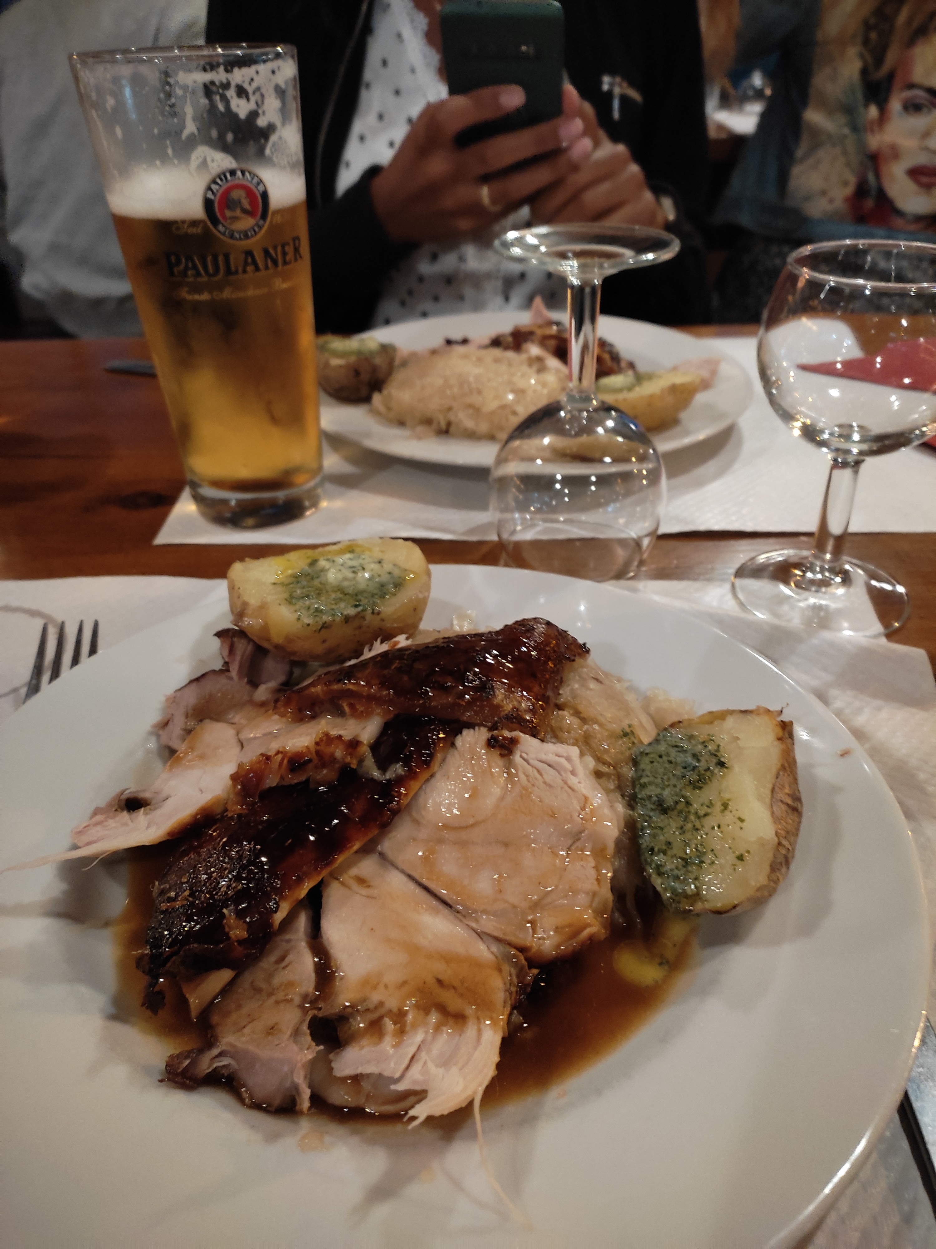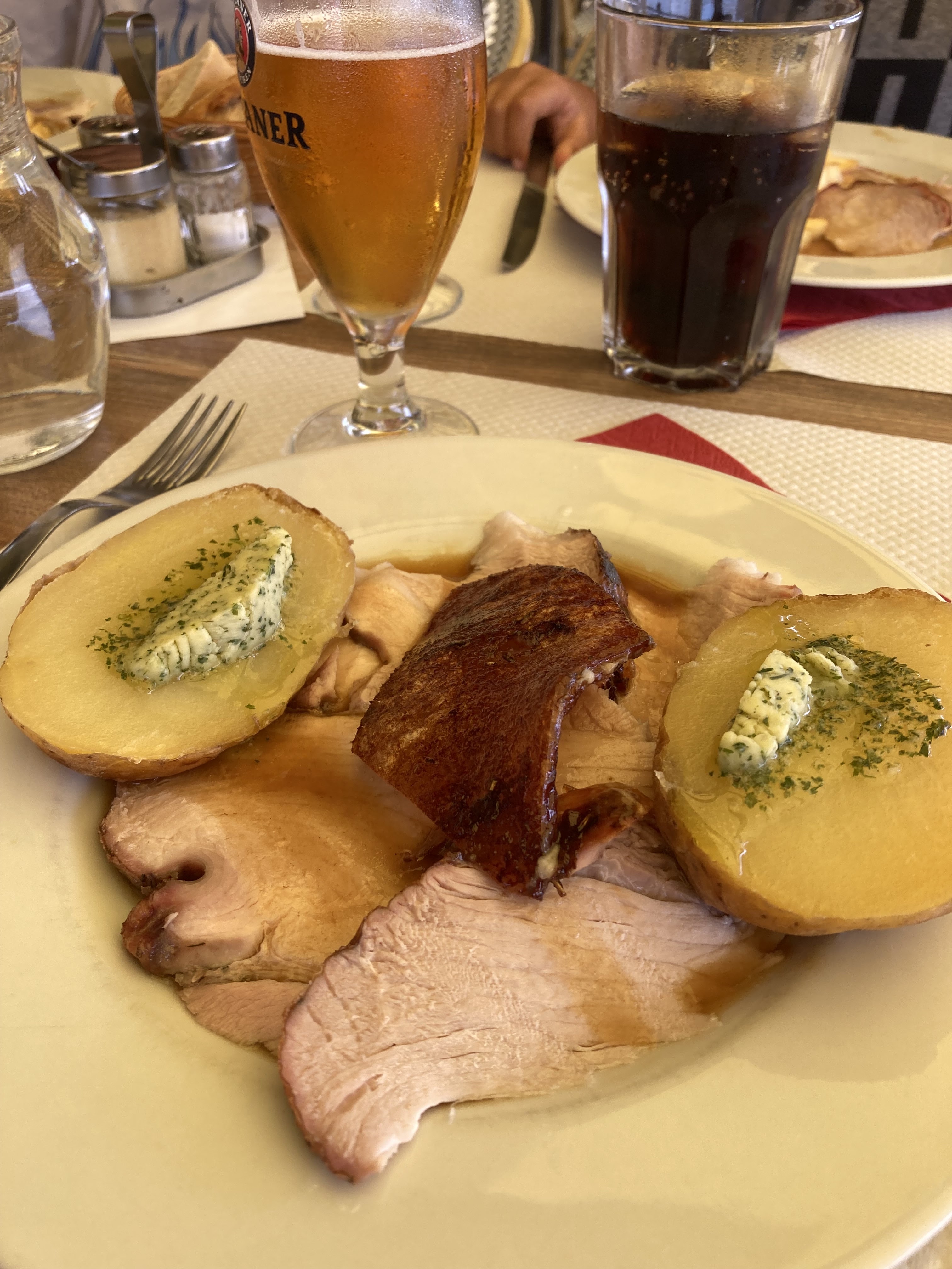 Des délicieux plats de porc grillé à la broche , avec pomme de terre ou choucroute , accompagnés d’une bonne bière brassée 😜