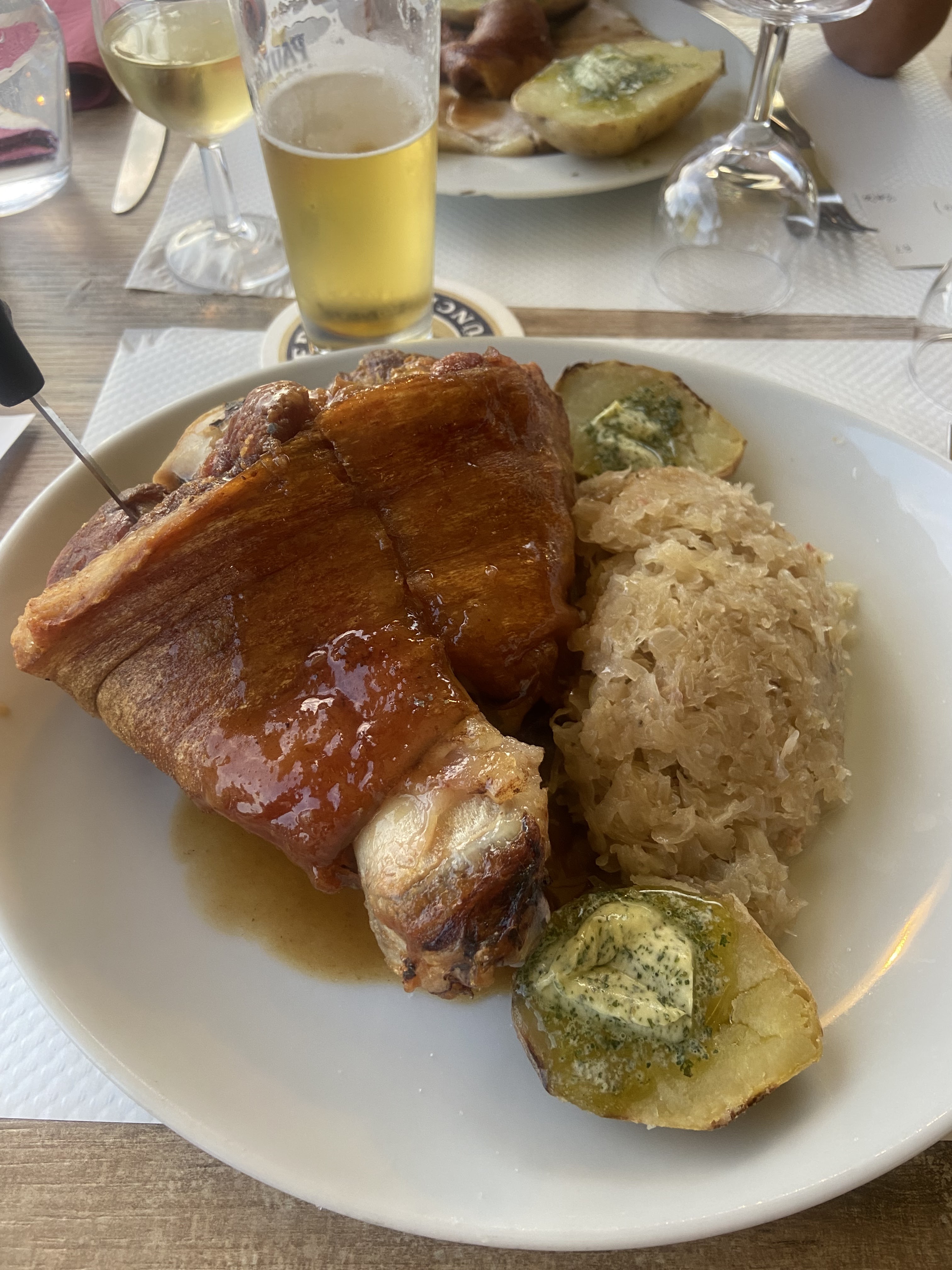 J adore leur jarret de porc grillé bien croustillant avec choucroute et pomme de terre beurre persillé 21 euros très copieux Rillettes 5 euros à l apero Excellente bière Paulaner Bonnes crêpes et coupes glaces