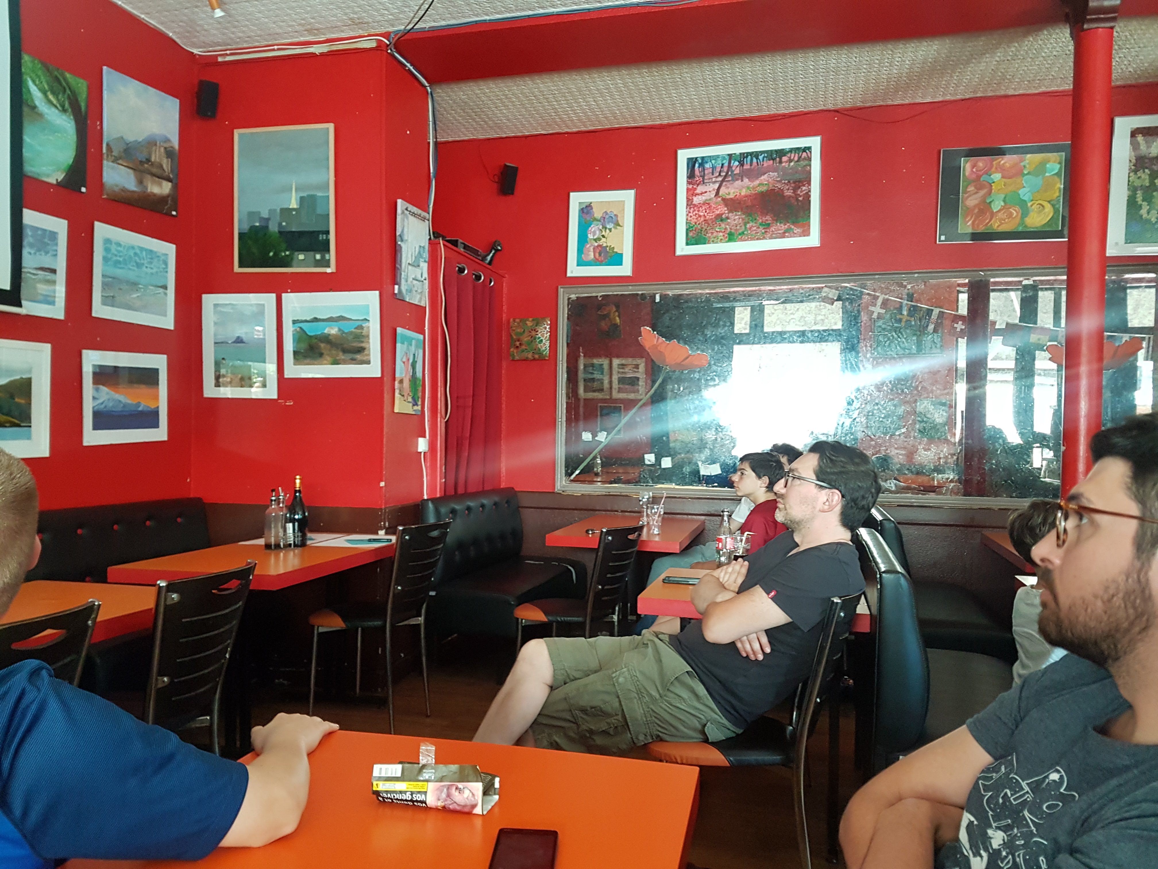 Petit café de quartier sympa pour se retrouver le soir. La déco (peintures, banquettes...) se dégrade dans la salle dommage. Il faut venir commander au bar et repartir avec ses consommations (ex 4,5 euros le.soda). Je n'ai pas vraiment compris pourquoi certains passaient direct pour payer leur boisson tirée du frigo quand d'autres font la queue pour strictement la même chose... favoritisme des habitués ?