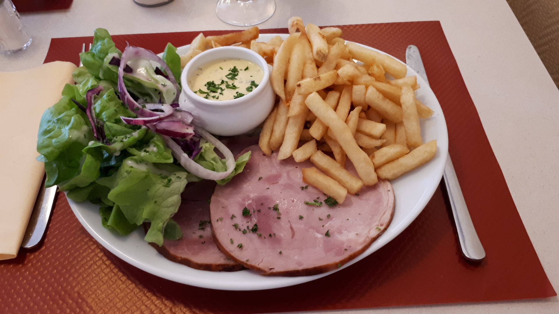 Points positifs: les assiettes sont bien pleines, l'amabilité et le sourire des serveuses, la bière fraîche (Leffe), les sauces des viandes, service rapide même un peu trop. Points négatifs: sans charme spécifique avec une odeur de Chien mouillée qui vous agresse le nez tout le long du repas ( restaurant acceptant les animaux), pas le temps de terminer l'apéro et les cacahuètes qu'elles étaient ramassées et l'entrée servie, la salade qui est largement defraichie voire gâtée, un loupé sur la cuisson du filet mignon (mais ça peut arriver), tiramisu à éviter ( apparemment mascarpone tiède et donc liquide sur un spéculoos surmonté par une fleur de chantilly en bombe). Restaurant plus pour les habitués et les personnes d'un certain âge...