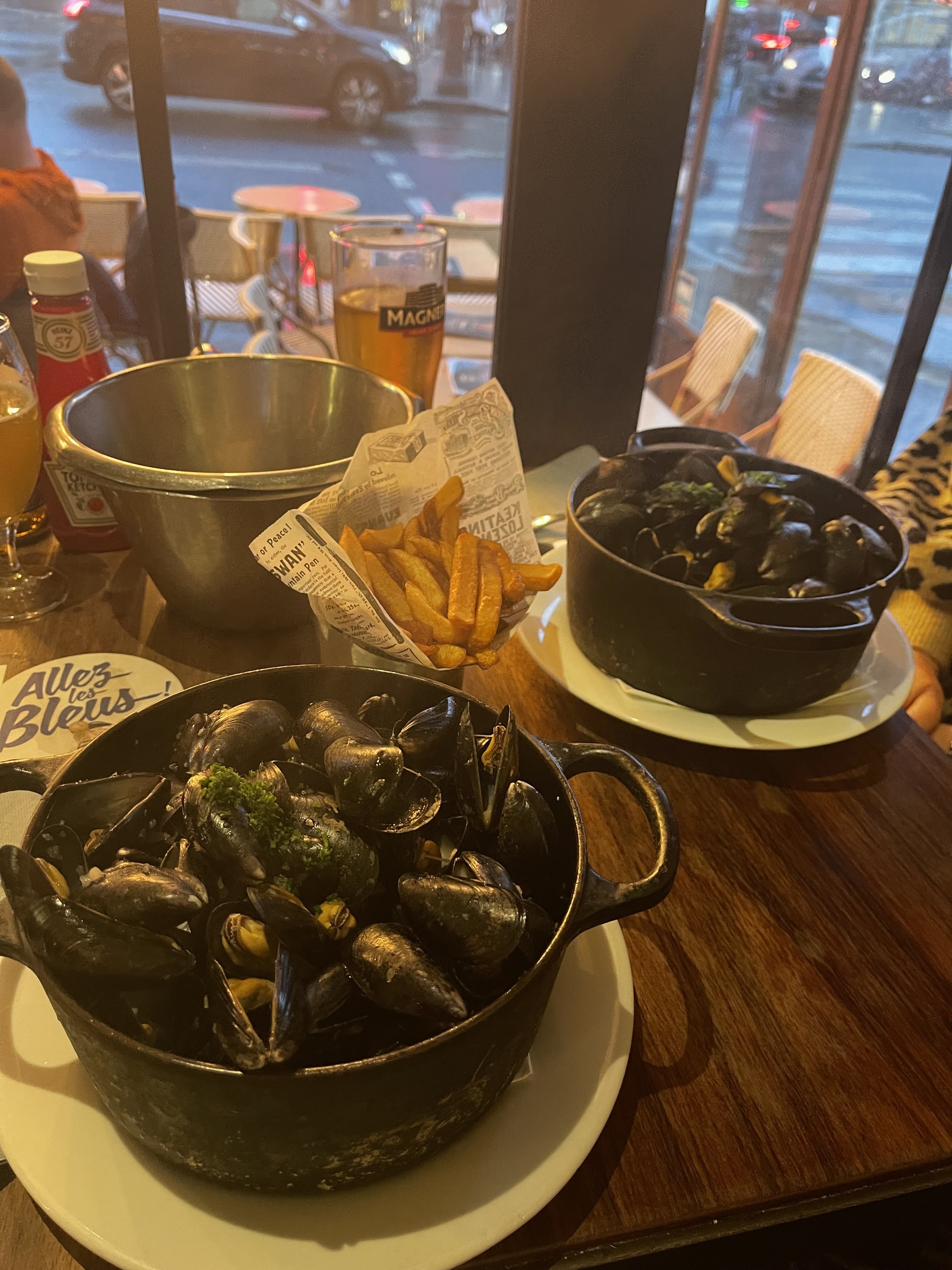A fuir !!!!! Par où commencer ? Les moules pas fraîches qui me vaut une INTOXICATION ALIMENTAIRE ou la malhonnêteté du serveur ?! Nous sommes allés prendre un verre mon amie et moi même. J’ai ensuite commandé des moules à la crème ! Le serveur arrive avec deux plats de moules en nous disant que nous avions passé commande pour deux plats. Il n’en est rien puisque mon amie n’aime pas les moules. Nous lui disons que nous n’en voulons pas il nous dit qu’il a mal compris et que de toute manière il ne pourra pas nous rembourser !! Tant pis pas de scandale ... je mange donc mes moules ( qui au passage sont toutes petites et sans goût mais j’ai faim) avec les frites CONGELÉS qui sont censées être fraiches et faites maison ! L’addition arrive 50€ pour deux verres dont un coca et deux moules dont une non commandées !! Je paye tant pis. Je ne comptais pas mettre d’avis négatif jusqu’à aujourd’hui mon mal de ventre horrible mes vomissements et mes heures passées aux urgences !!!!! A FUIR SI VOUS NE VOULEZ PAS TOMBER TRÈS TRÈS MALADE !!!! Nul. Si je pouvais mettre zéro étoile je l’aurais fait !!!!!!