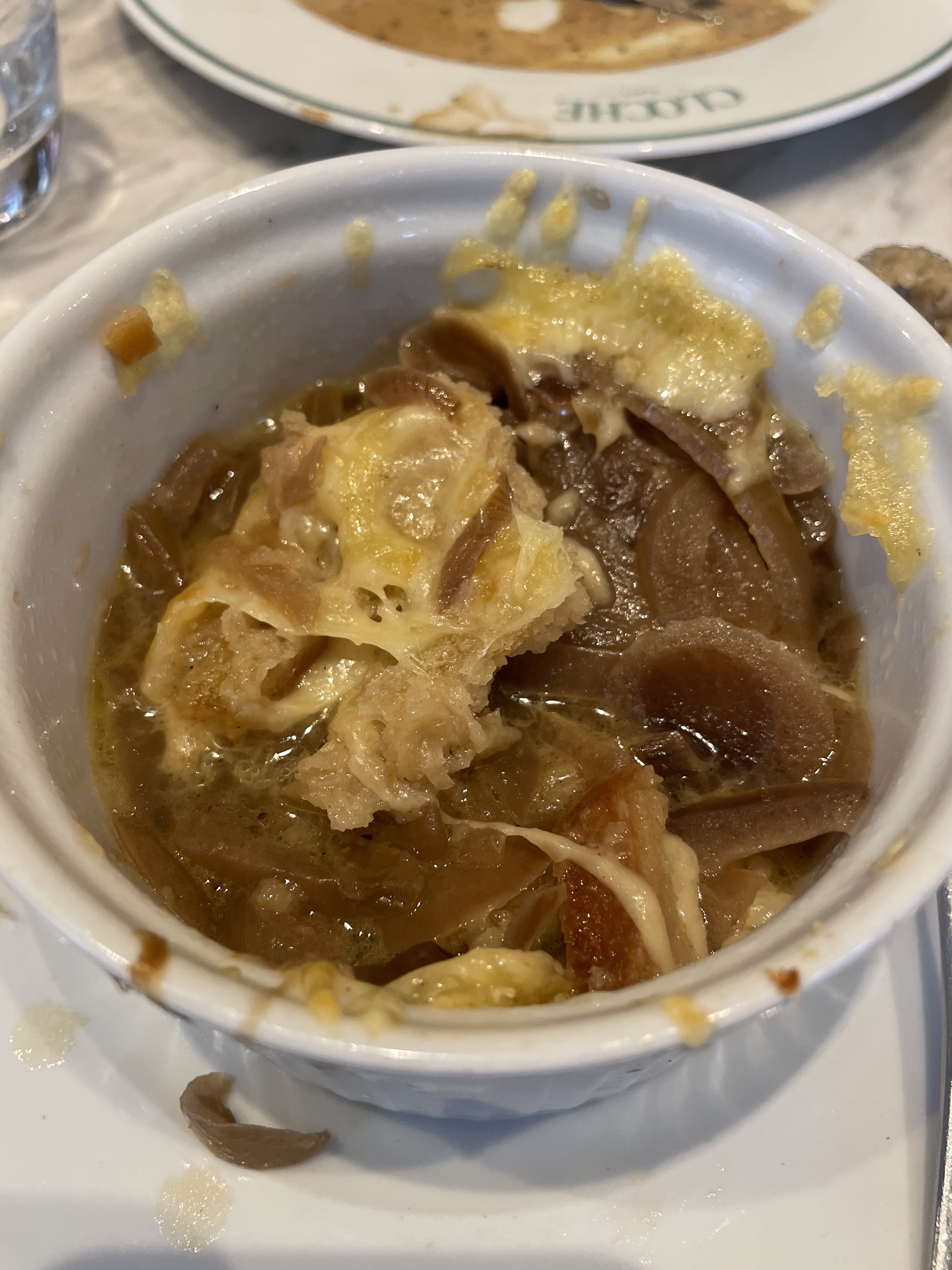 La soupe à l'oignon n'est pas bonne, elle a un goût insipide et à base de cumin. Excellente entrée aux champignons Très bonne viande poivrée, les pommes de terre ne sont pas croustillantes