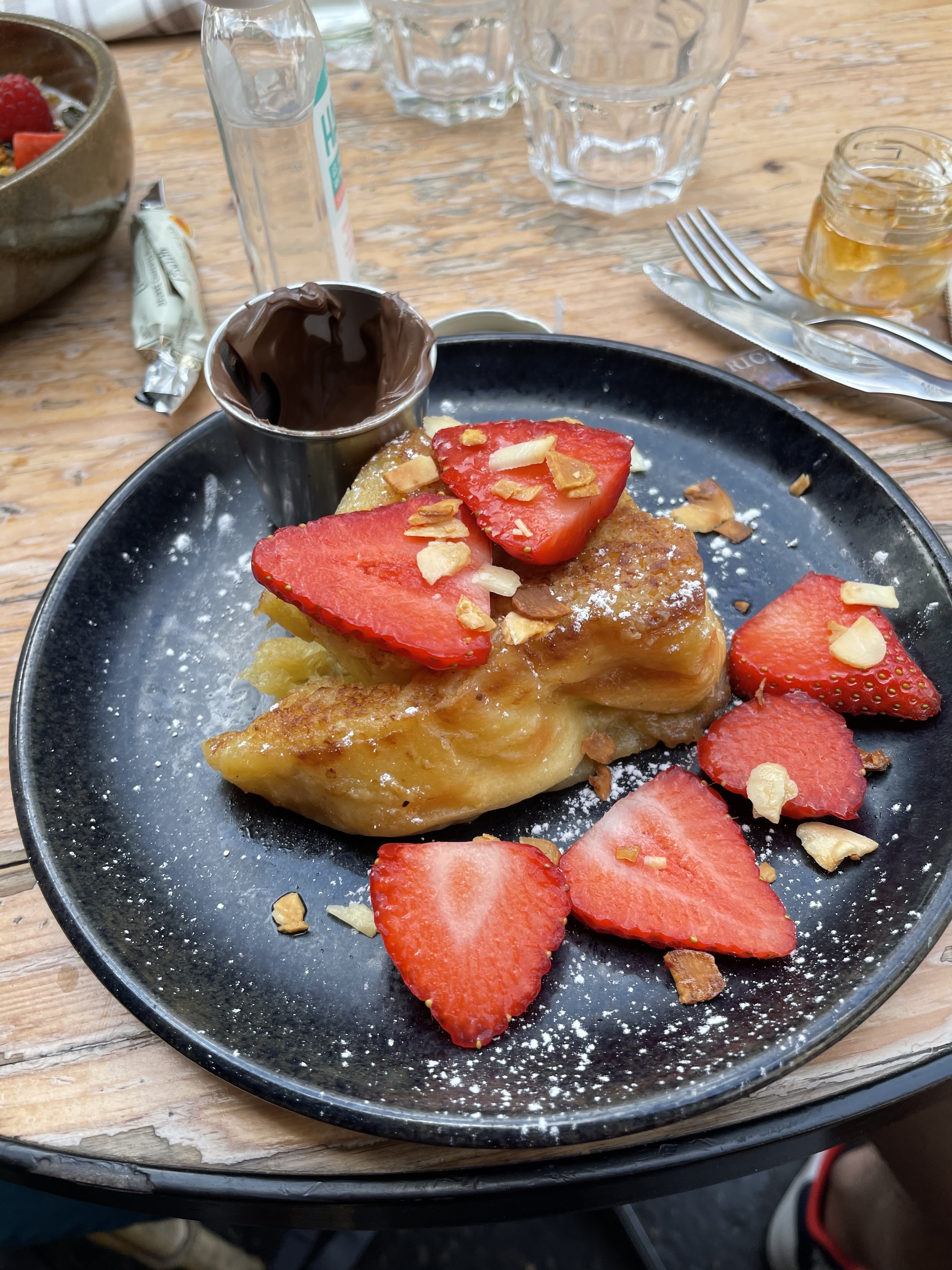Brunch très copieux ! Si le temps le permet, la terrasse est une belle option avec une vue magnifique sur la Tour Eiffel Nous avons été bien servis en quantité de brunch, tellement que nous avons du demander à prendre la fin à emporter. 🥲 C’était vraiment bon, entre les viennoiseries, tartare de saumon, œufs brouillés et pancakes 🥞 Service très bien