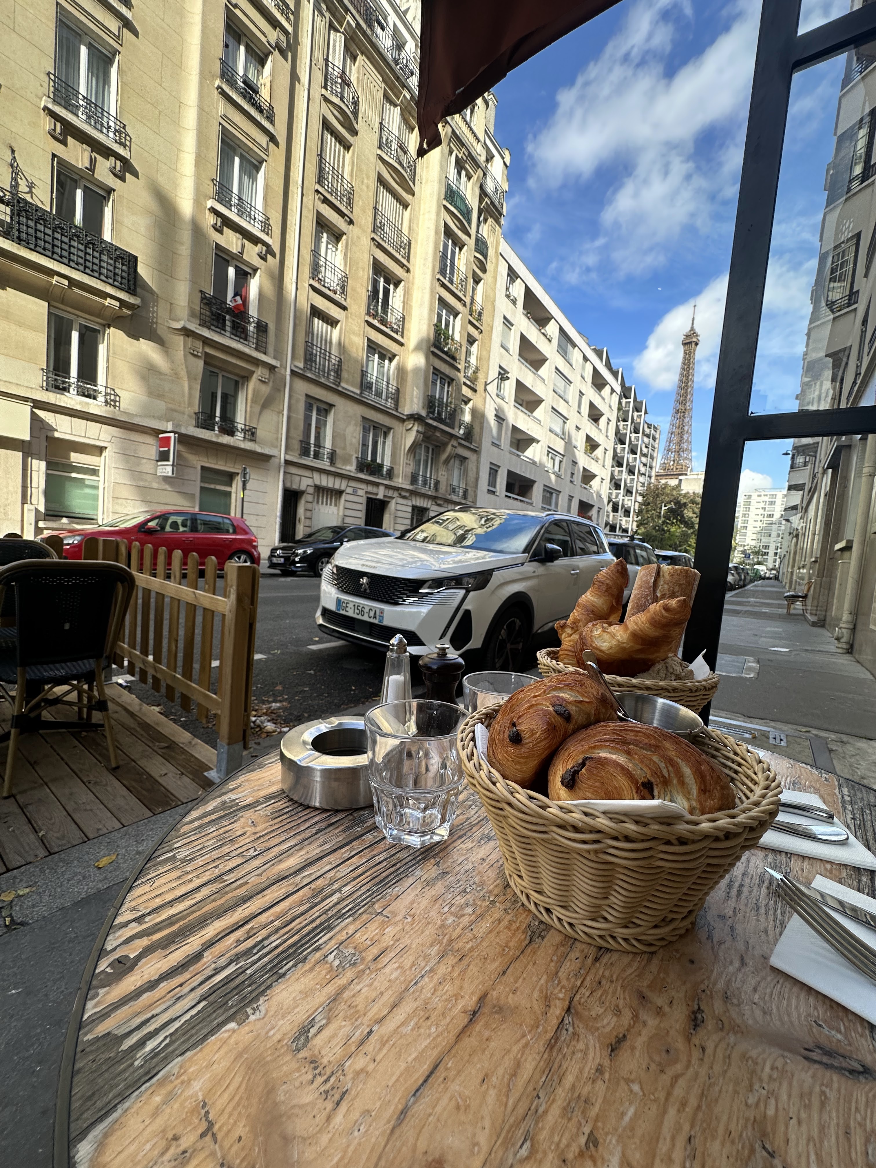 Brunch en terrasse, avec une petite vue sur la tour Eiffel. La réservation est vivement recommandée par téléphone ☎️ L’accueil est sympathique. La formule Brunch est à 29€, c’est assez cher. On apprécie pour ce prix une formule assez complète (boisson chaude et jus, puis viennoiseries, plat puis dessert), le tout plutôt bien présenté et en bonne quantité.