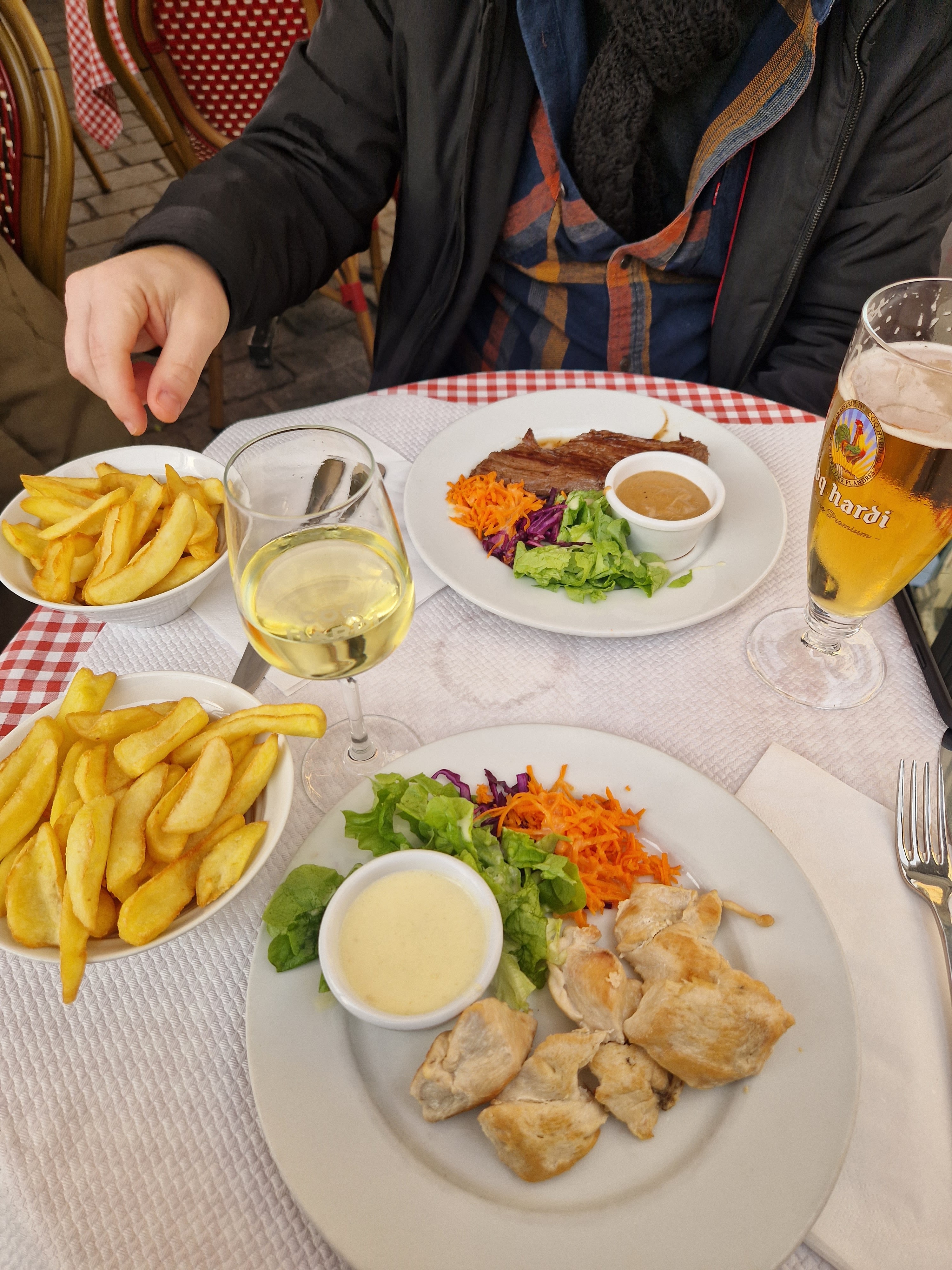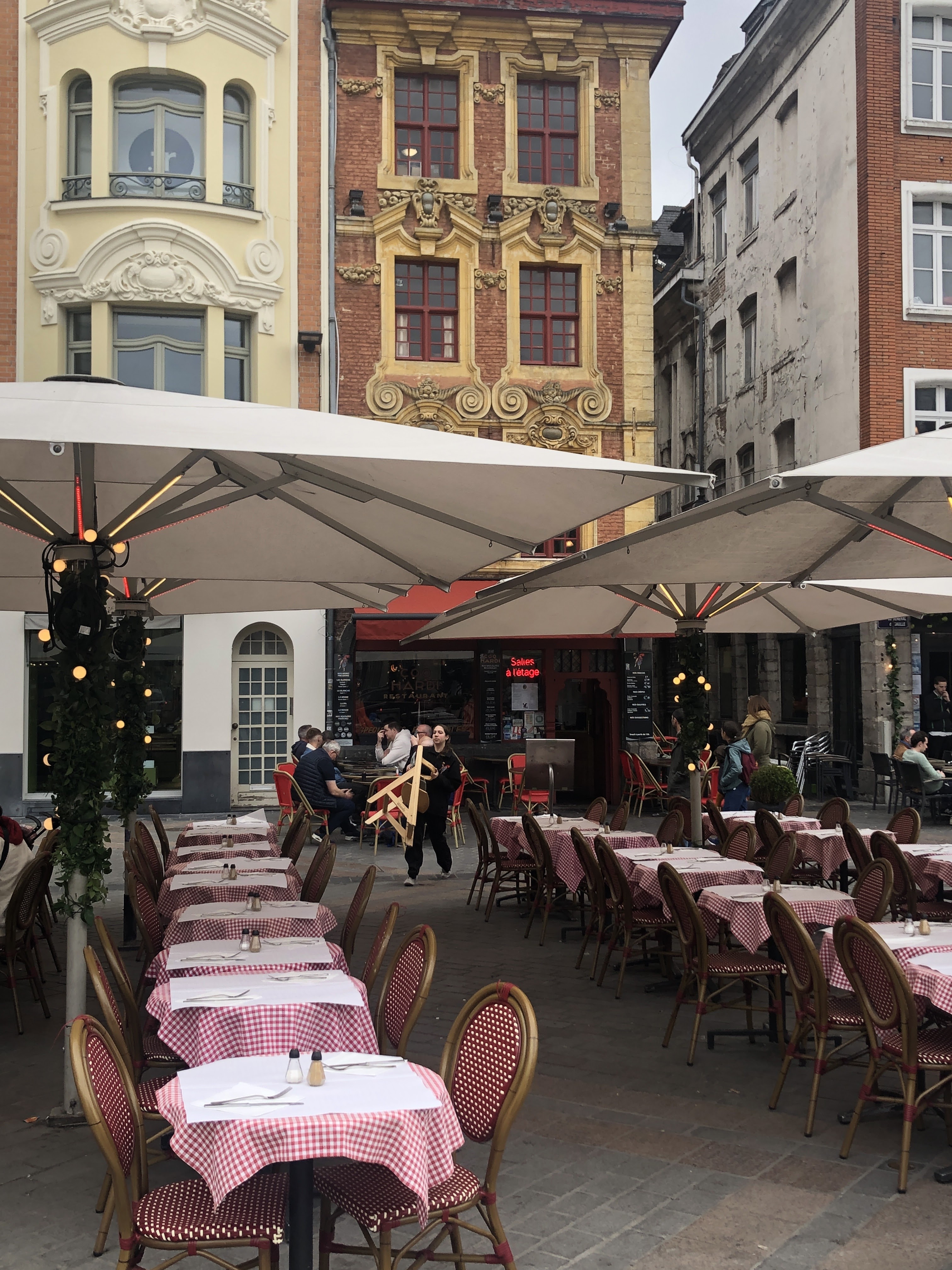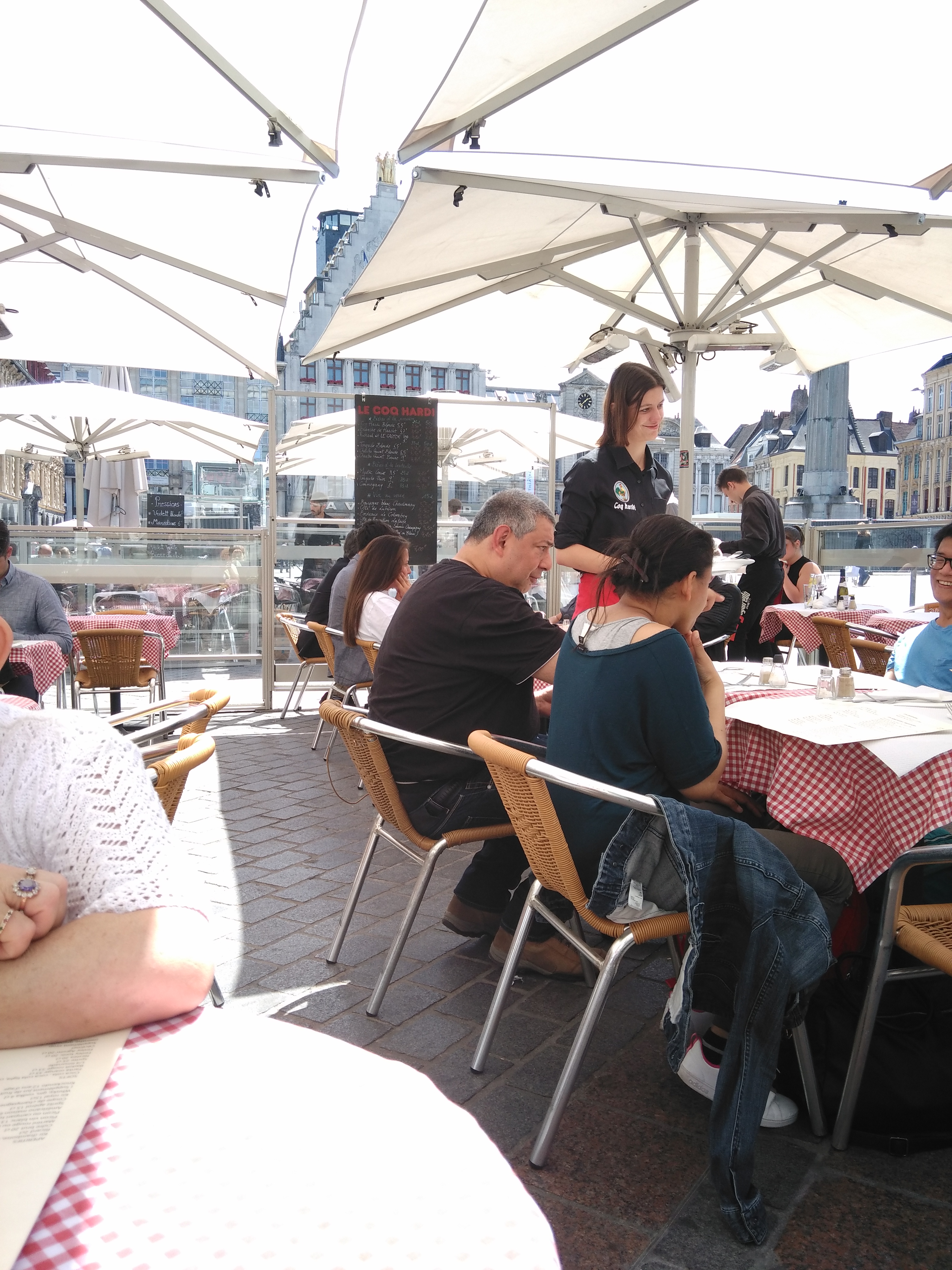 J'ai déjeuné en extérieur malgré une météo mitigée avec quelques giboulées de mars et un vent léger. On apprécie l'efficacité des pare-vent et parasols qui sont de qualité. Le serveur était très agréable et le service assez rapide malgré le monde. La qualité du repas était bonne mais le poids de la pièce de bœuf un peu limite à mon goût. Manger sur la place reste un plaisir. Vous pourrez déguster la bière du coq Hardi sur place et bien d'autres. A la fin du repas, vous êtes au coeur de Lille pour visiter le vieux Lille et ses environs. Je recommande cet endroit ++