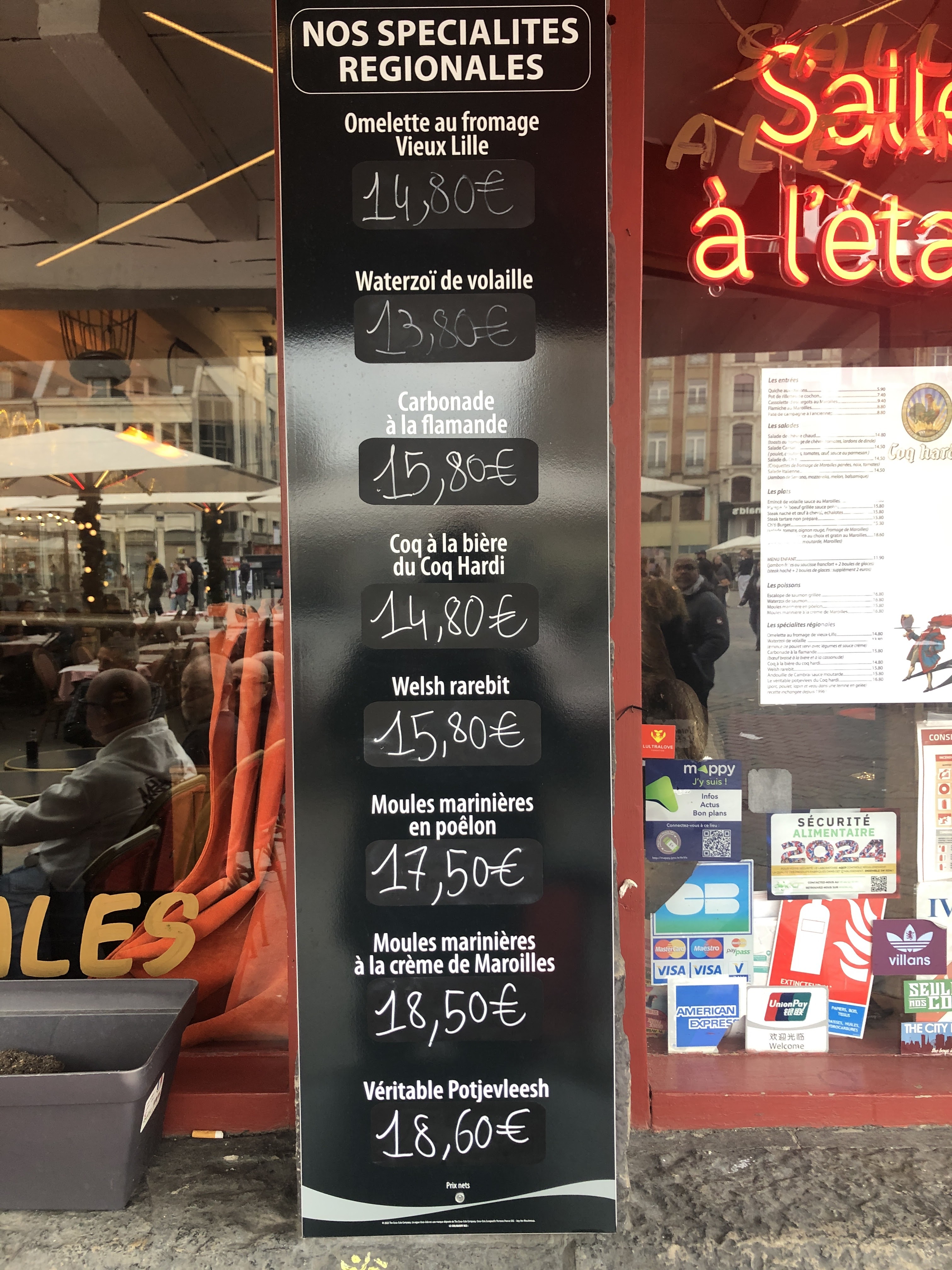 Un petit menu sympa a 22 euros, entrée, plat, dessert. Une serveuse très sympa et efficace, souriante, enjouée. Une cuisine locale bien servie, qualite, quantité, sur la grand place de Lille. Ca fait plaisir d'être des touristes attrapés, pour une fois, dans le bon sens du terme. Bravo ! A faire, et refaire. Merci de ce moment terrasse, entre deux averses