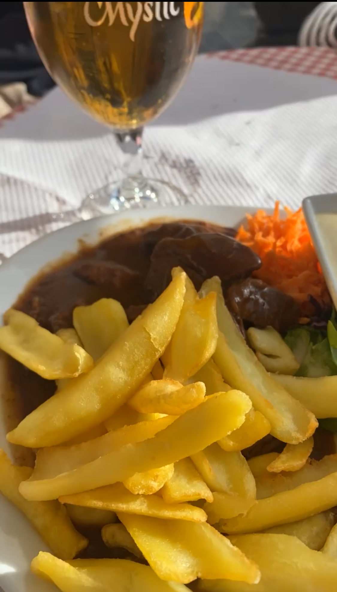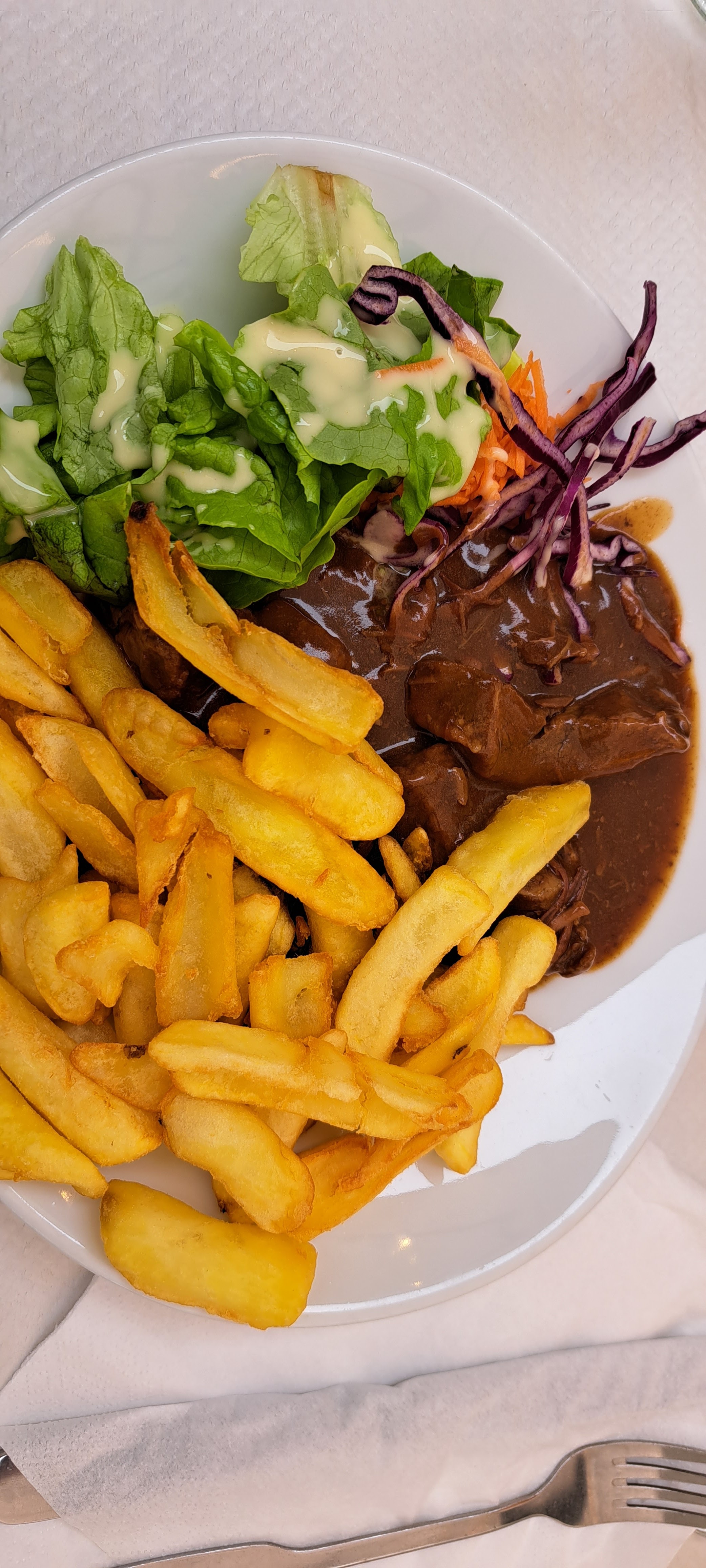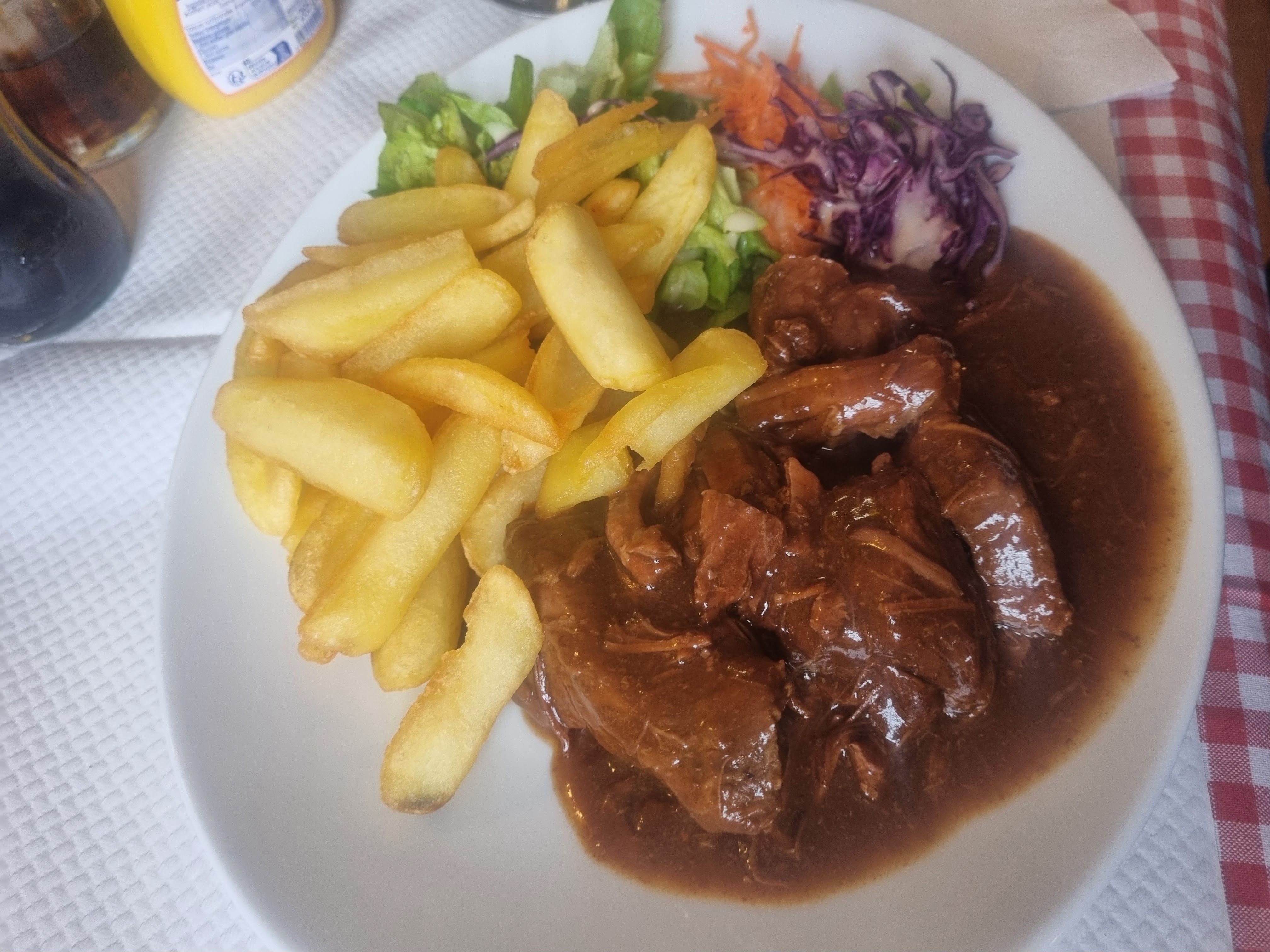 Carbonnade servi tiède...frites pareils....je n'ai donc pas fini de manger car ce fut très vite froid... dommage service impeccable,serveuse super!