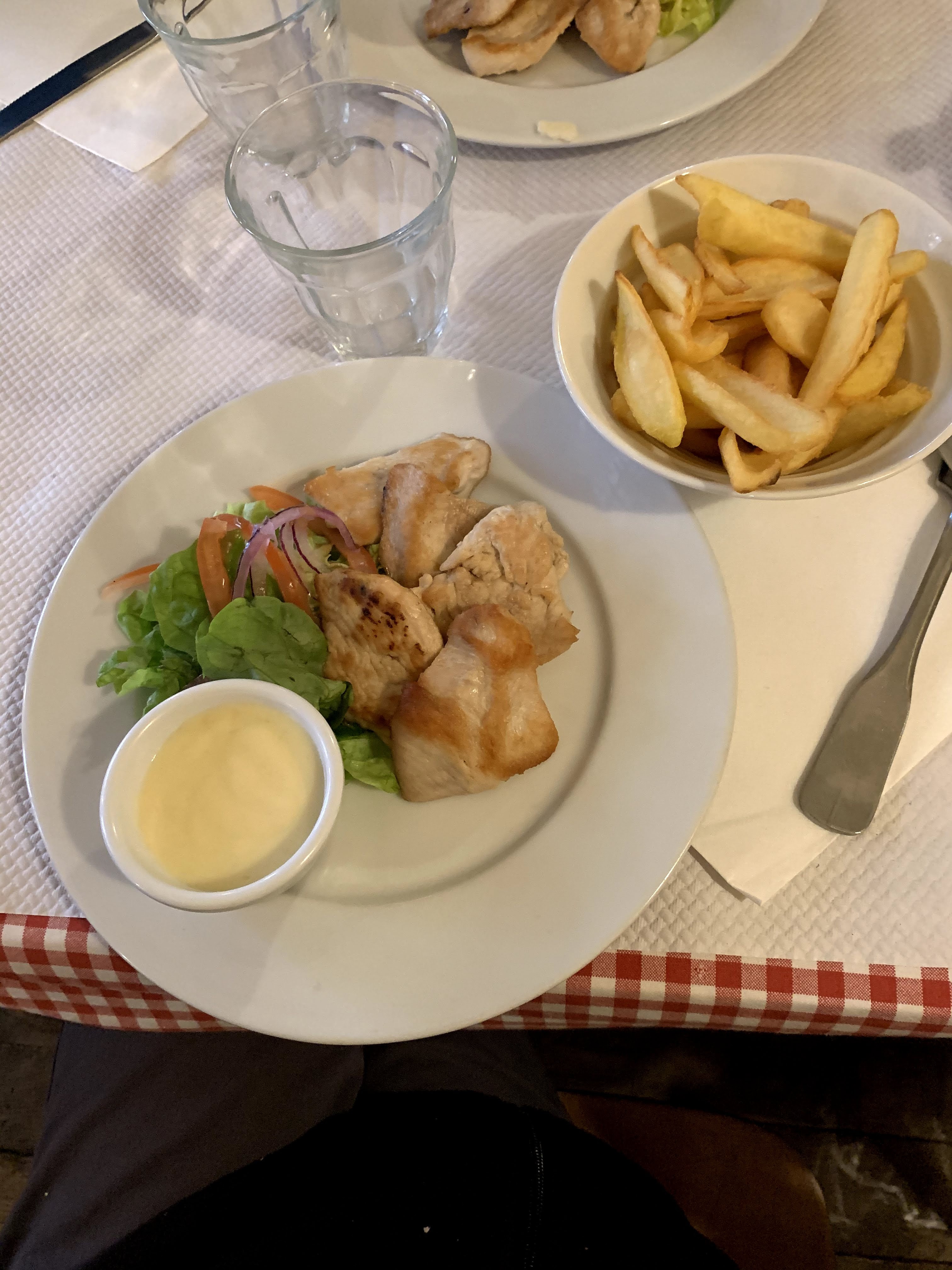 Aiguillettes de poulet au maroilles : poulet trop cuit et très sec, salade inexistante et frites quelconques, le petit pot de sauce maroilles a plus le goût de crème que de maroilles…. Bref, très décevant, on mange beaucoup mieux chez sois…