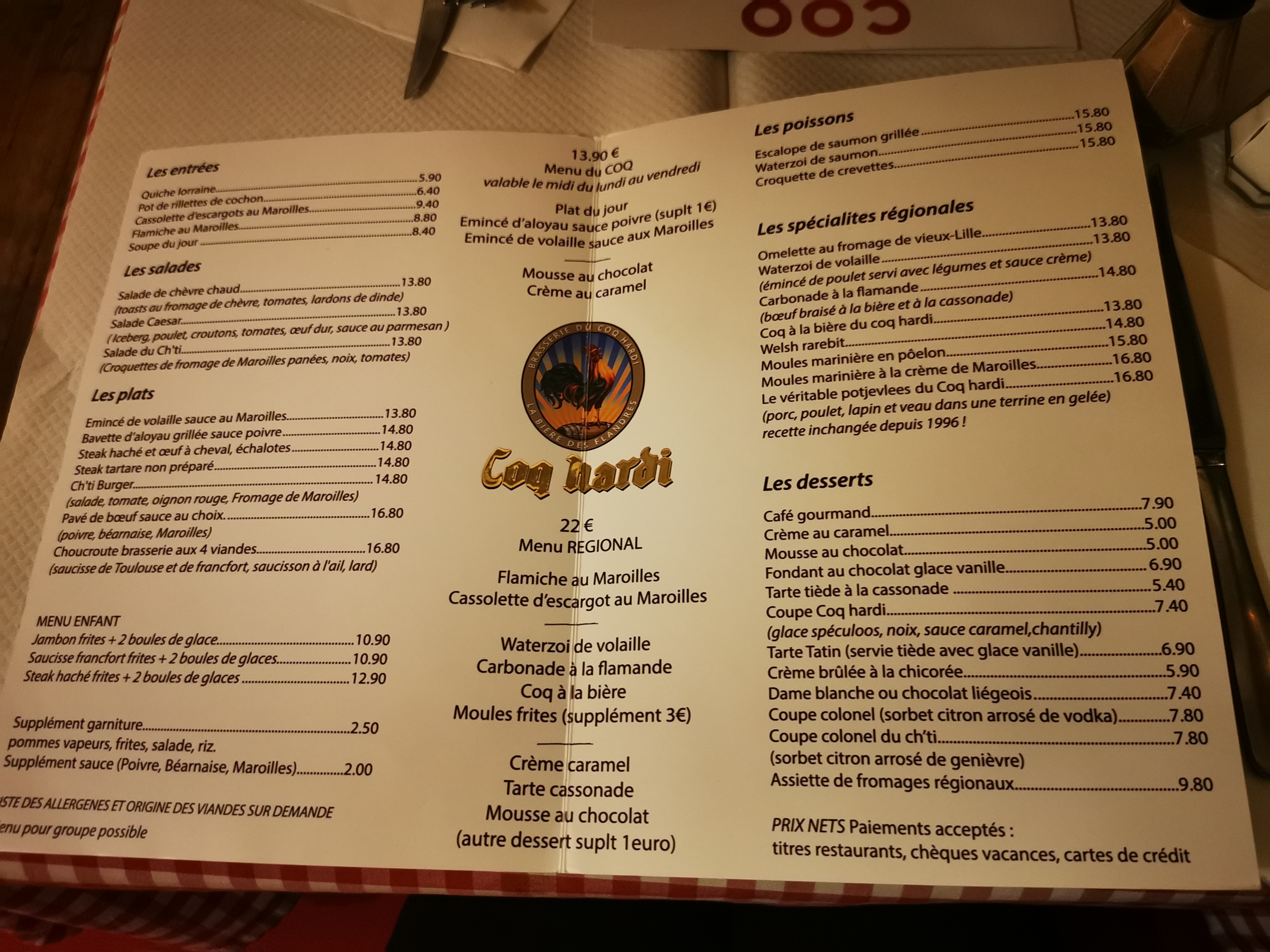 Une très belle adresse sur Lille. Le coq hardi. Une petite découverte pour nous. Service impeccable. Serveur agréable et souriant.. les prix sont abordables.