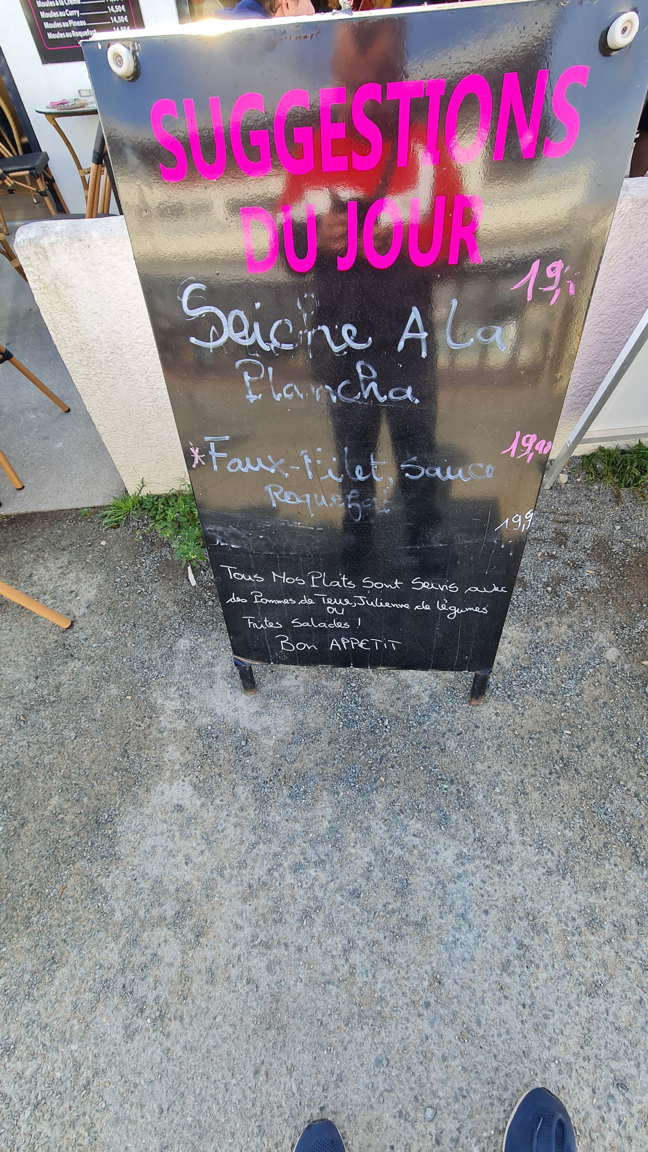Au départ le sourire mais cela n a pas dure. On se laisse tenter par des moules au Pineau. On le cherche toujours… à la limite de se demander s ils n ont pas confondu marinière et Pineau… à non la note fait bien mention de 16€ pour le Pineau…par contre, des crabes, des algues… ça c était le pti plus (gratuit lol) et le tout pas forcement chaud. Ha Les frites… ! La portion d enfant dans un petit bol. Le tout en plein soleil, coca et eau ont bien chauffes! Toilettes sales (11h30 du matin) Et le sourire toujours pas de la partie même la note réglé. Nos voisins de table ont émis les même réflexion que nous… on c est sentis bien moins seul! Beau piège à touriste qui fonctionne!
