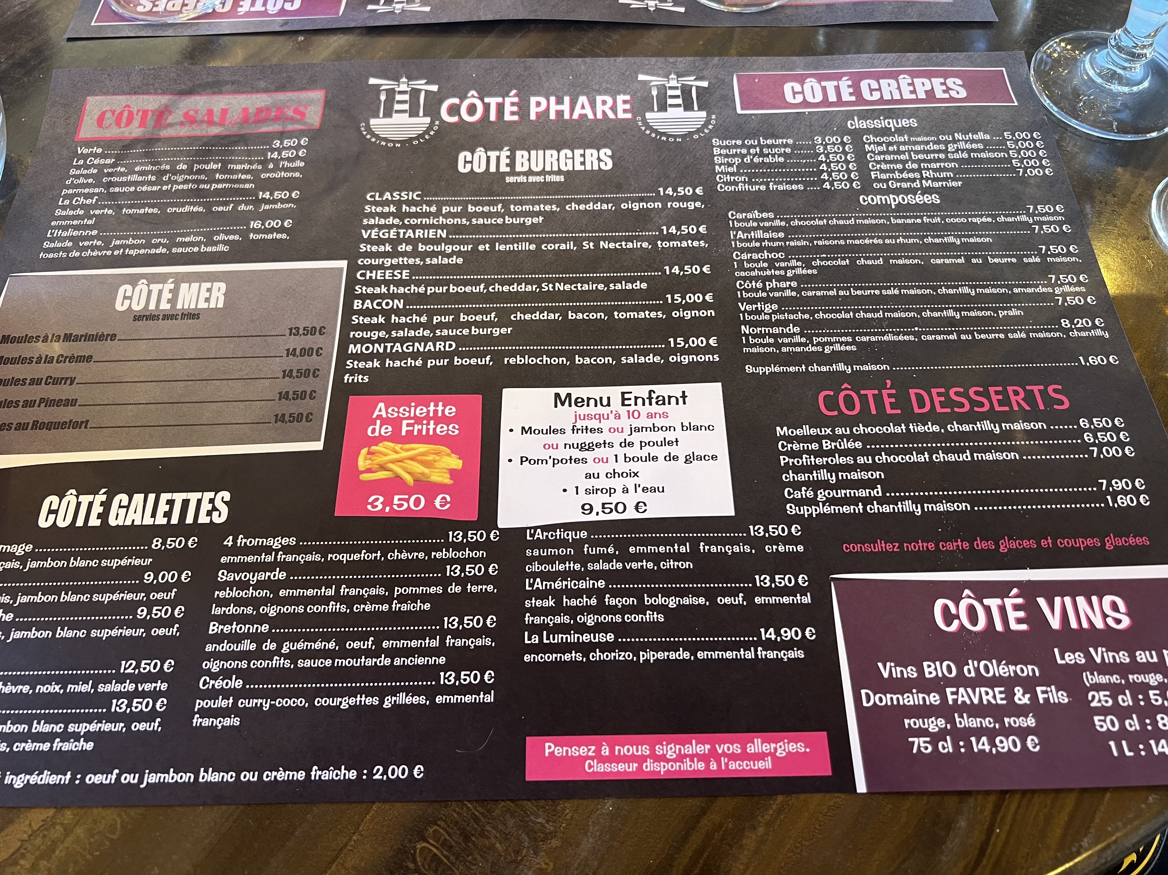 Nuggets frites surgelés pour nos enfants. Et moi quand je commande des moules frites je m’aperçois qu’une moule sur 2 est vide et que celles restantes sont toutes petites. Quand je fais une réclamation à la serveuse elle me répond que ce n’est pas la saison et qu’elles sont importées, elles ne viennent pas d’oleron. Un comble pour un restaurant. Je n’ai eu aucun geste ou proposition de sa part pour satisfaire mon repas. Pourquoi simplement proposer qu’à la bonne saison. Business is business