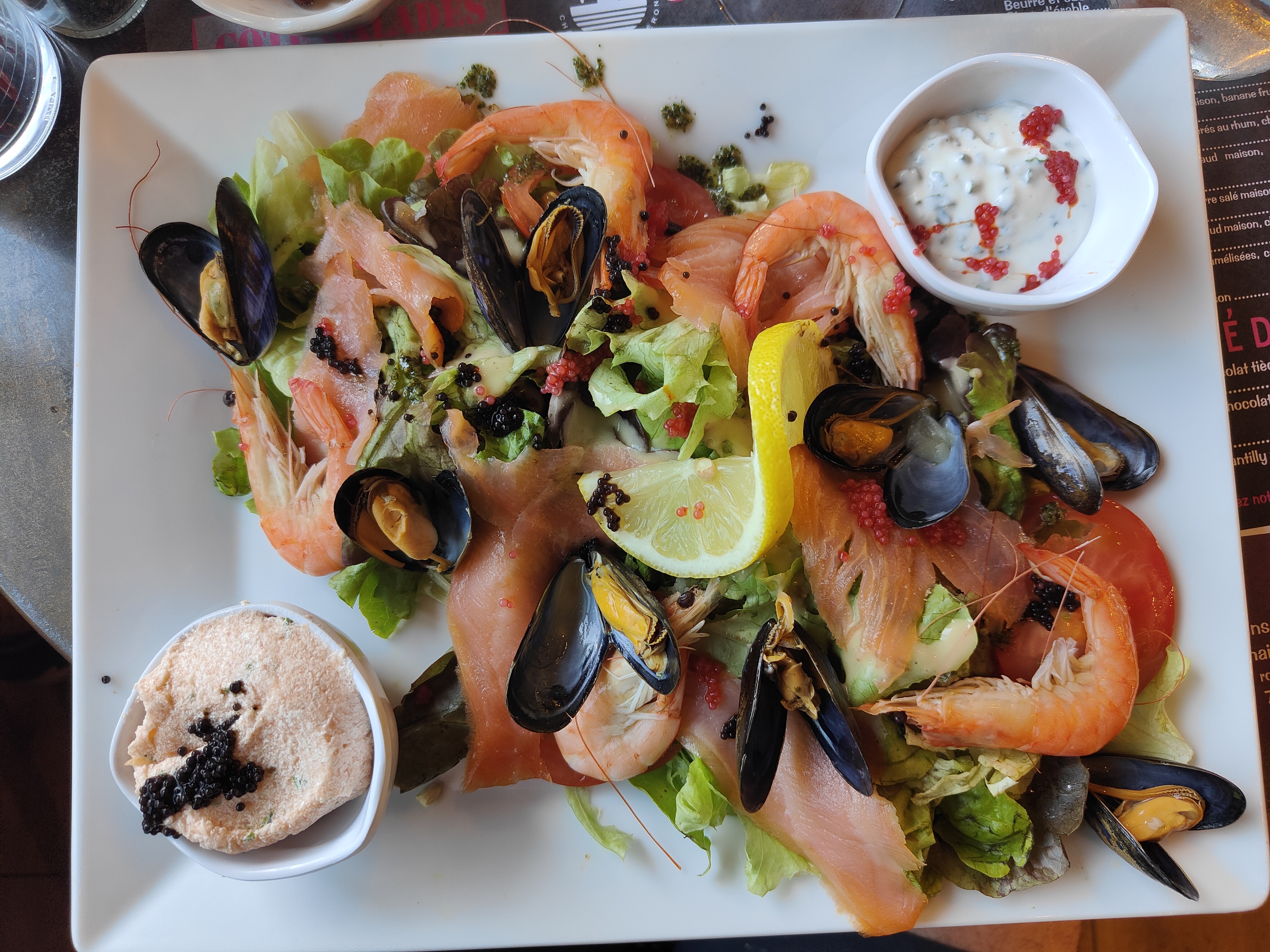 Burger montagnard au reblochon... Si ce n'est pas du local... Je ne m'y connais pas ! 17.5€ la salade nordique = Terrine de saumon, oeufs de lump, 5 crevettes, 6 moules... et 2 tranches de saumon fumé... Pour du surgelé, ça laisse de quoi méditer.