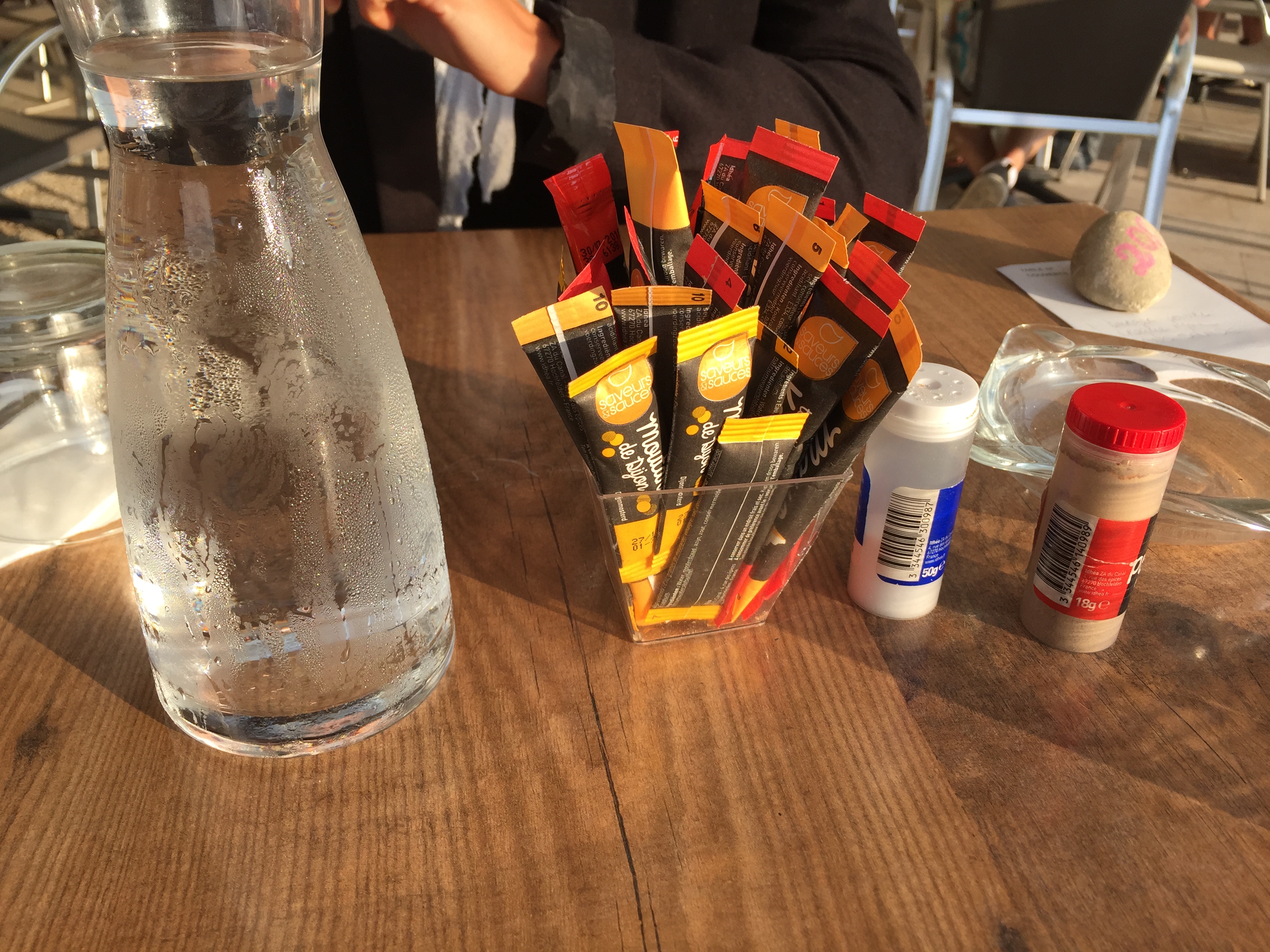 Nous nous installons pour prendre un verre en terrasse exposée au soleil. Lorsque la serveuse s’est rapprochée de nous pour nous demander ce que nous voulions, nous lui avons répondu que nous souhaitions juste boire un verre au soleil pour le moment. Alors elle nous a répondu que cette table était déjà dressée pour le déjeuner (quelques couverts et trois serviettes). Elle nous a alors invité à se décaler sur la table à gauche à l’ombre. Pour saluer ce geste commercial, nous avons décidé d’aller prendre un verre ailleurs. Bonne journée
