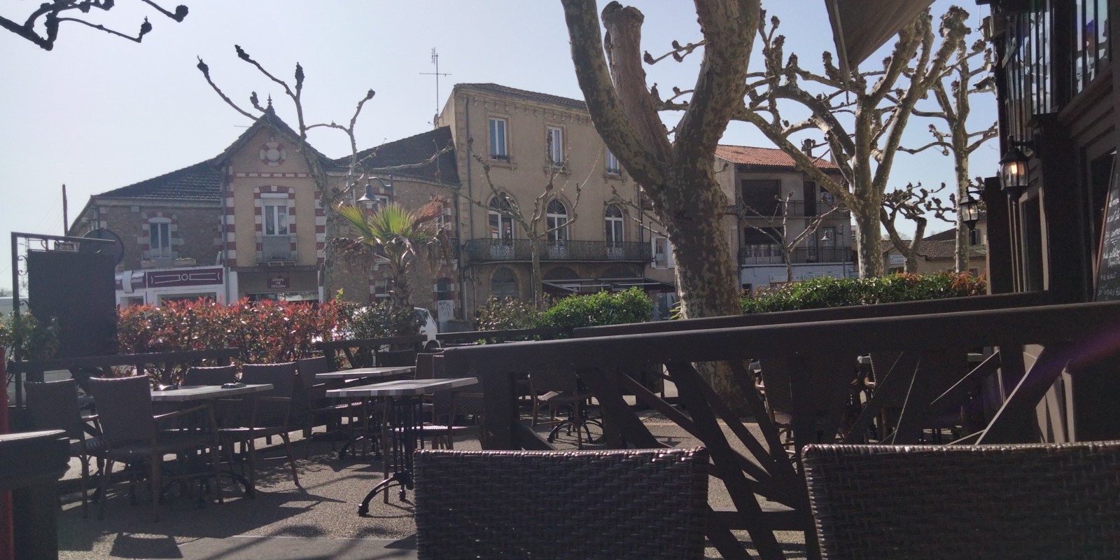 Petite terrasse ombragée sur une place de village, une pause café bien agréable