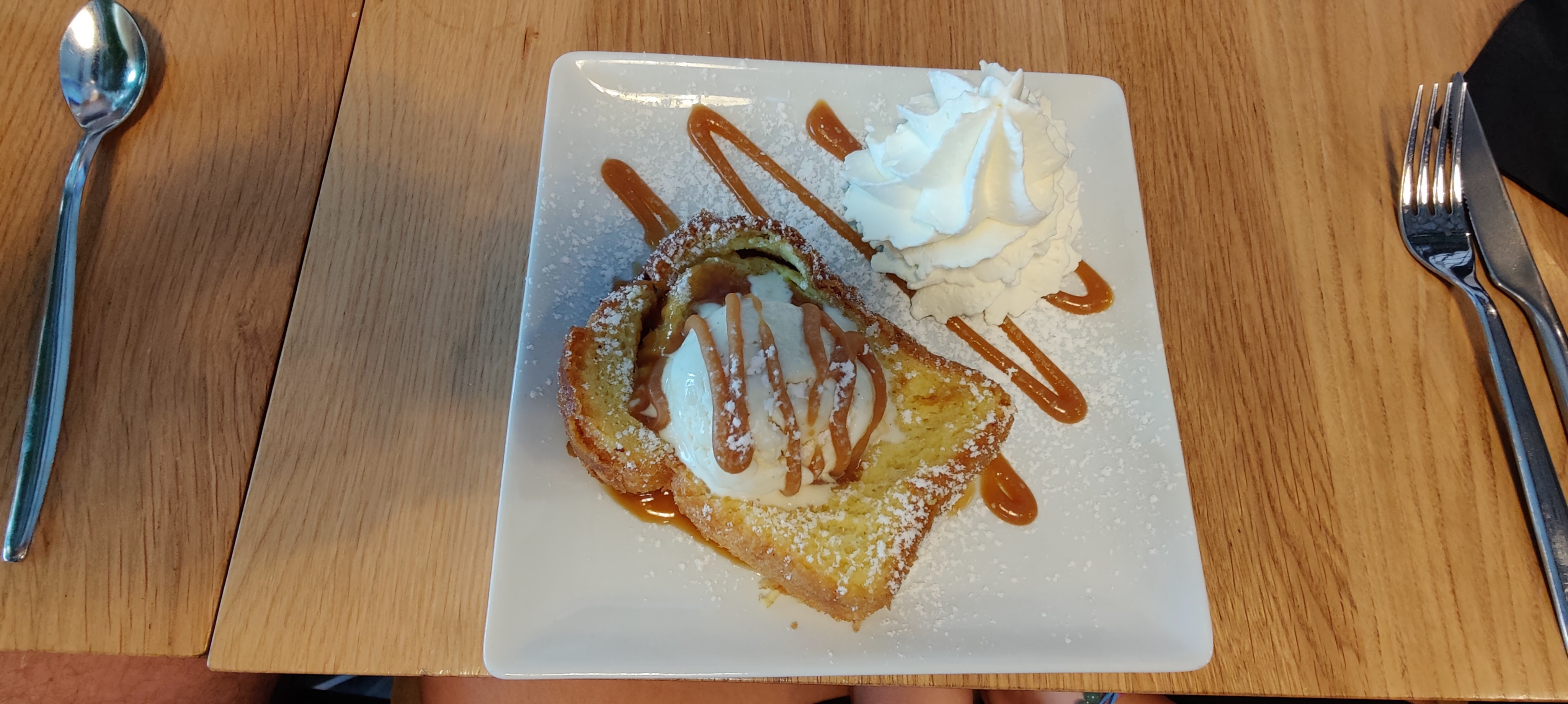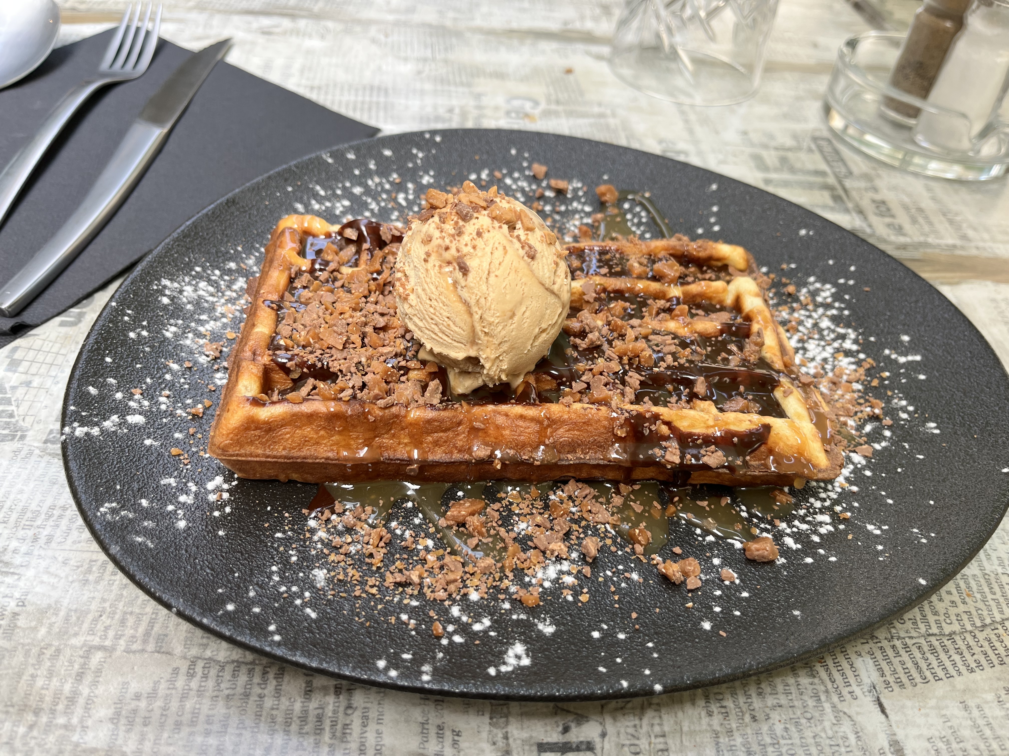 J'y suis allé deux fois : l'après-midi pour du café glacé et des gaufres (voir photo) et le soir pour de la guinness, du football et des snacks. Les deux fois, j’étais très content de ce que j’avais obtenu. Tout le monde était gentil et serviable.