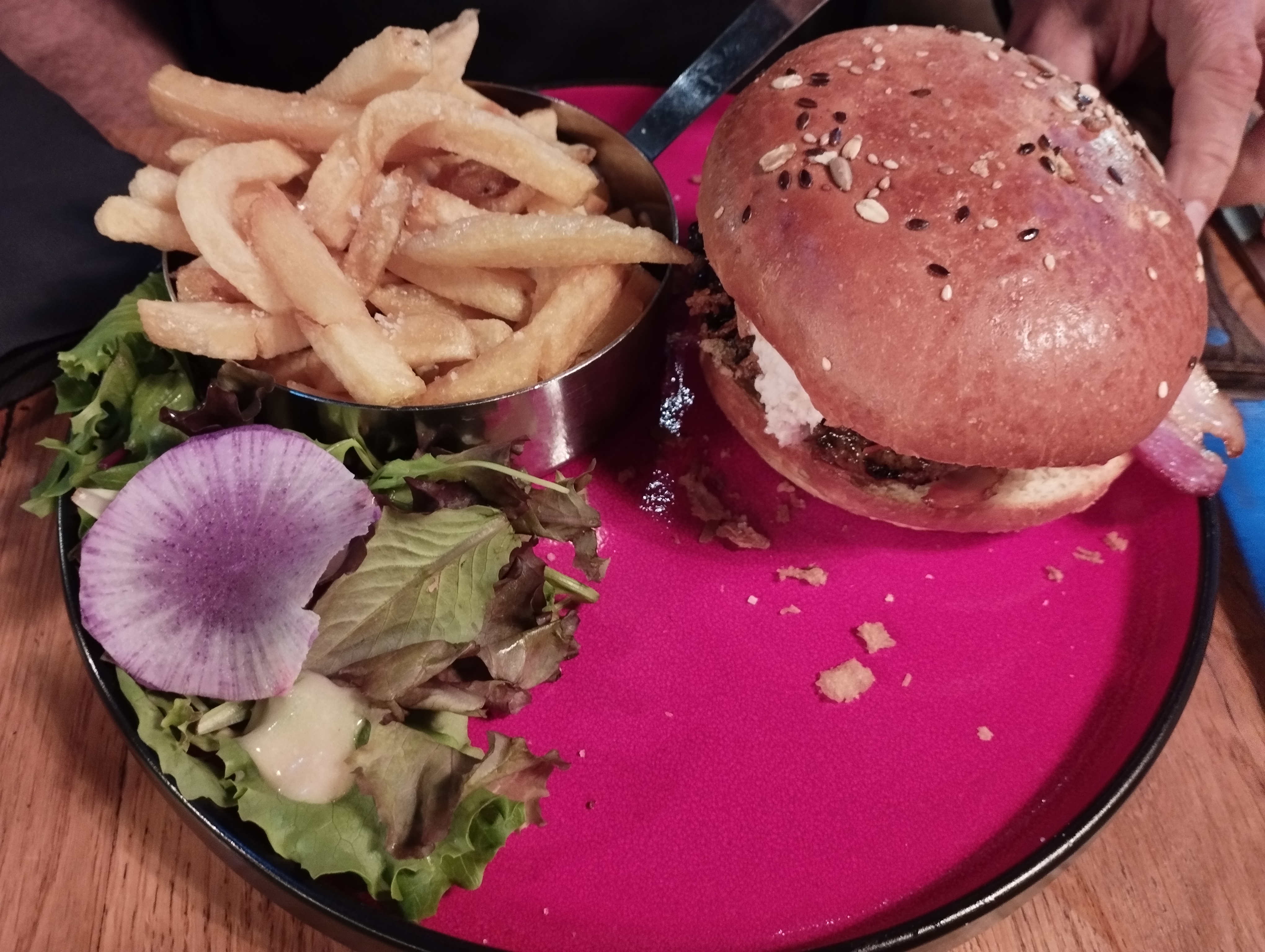 A peine arrivé a table le patron de l'établissement nous recommande vivement de laisser un avis positif sur son établissement se qui est totalement normal pour son buisness, je commande un burger classique une fois servis le burger n'a rien d'un burger certes le pain est maison mais le gout n'y est pas viande congelé et servis avec peu de condiment, je ne sens pas le gout de viande fraiche ou du fromage rien y est, enfin bref le burger n'a rien de spécial je n'arrive pas a le finir, le patron ramasse nos assiettes et je me permet de lui signaler que le burger ne ma pas plus, tout d'un coup se n'est plus un patron que j'ai en fasse de moi mais un enfant qui m'assure qu'il en a vendu beaucoup aujourd'hui tout en protestant mon avis sur le burger. Il en viens même a juger mon physique qu'il trouve trop maigre, cependant malgré ma maigreur je peut vous assurer que se burger n'était vraiment pas digne. Mes amies ont appréciés leur plats mais pas moi. Donc monsieur le patron si vous me lisez comme je vous l'ai dit de vive voix : La quantité ne fait pas la qualité :)