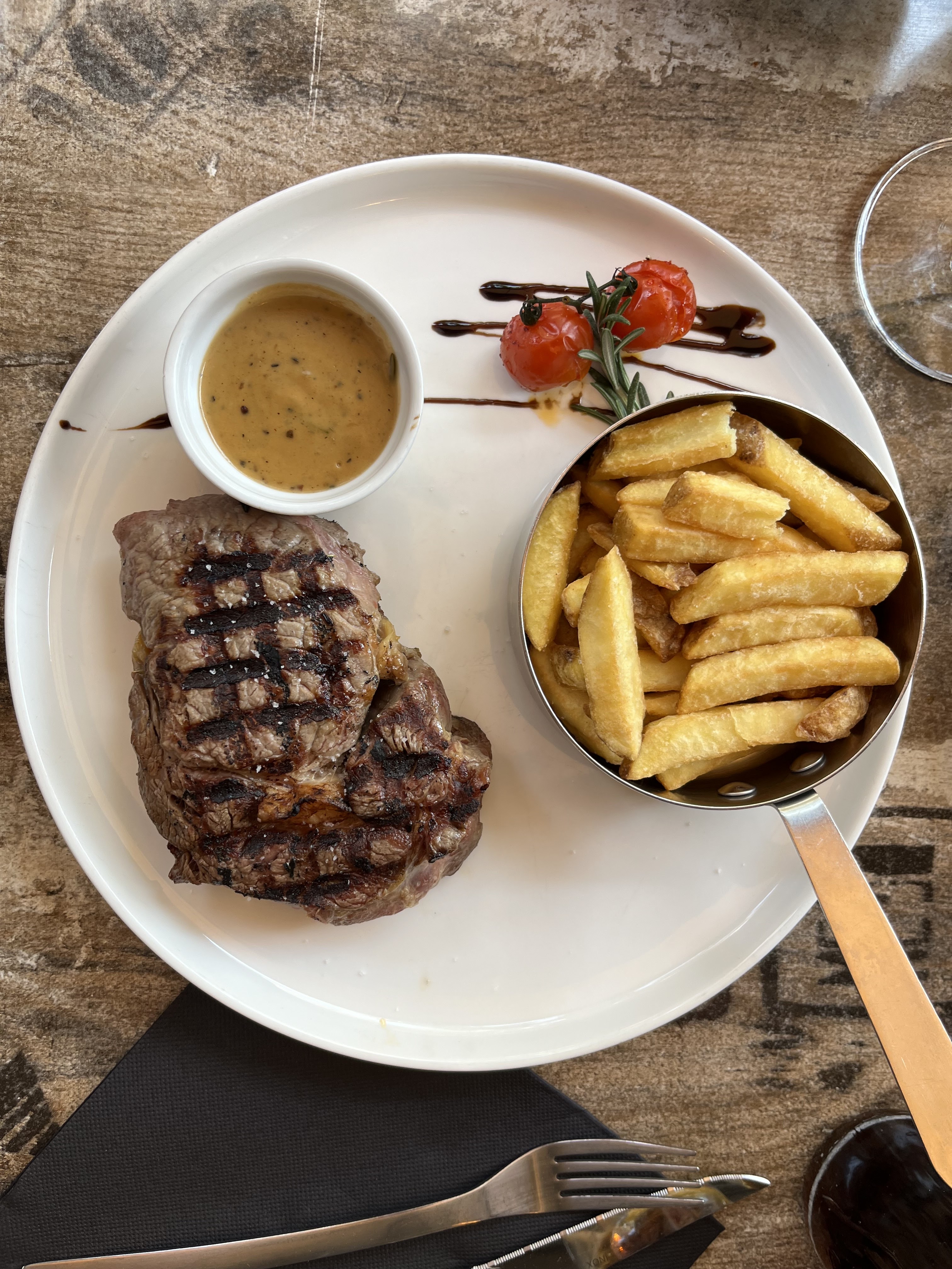 Je débattais entre un 3 ou un 4 étoiles. Je n'ai pas aimé le steak Black Angus que j'ai commandé. J'ai commandé du moyen rare mais c'était tellement rare. Ils l'ont cuisiné à nouveau mais toujours rare à son retour. Difficile à couper et très moelleux. Je n’ai pas beaucoup aimé ça ni les frites et c’était 36 euros. Je n’ai pas mangé beaucoup ou ça. Dieu merci, ma famille l'a terminé pour moi, donc il n'a pas été jeté. Les 3 autres assiettes de ma famille, comprenant le canard, le fish and chips et le saumon, étaient bonnes. C’est pourquoi j’ai mis la note à 4. Je ne reviendrais probablement pas ou si je le faisais, je commanderais des pâtes, pas le steak.
