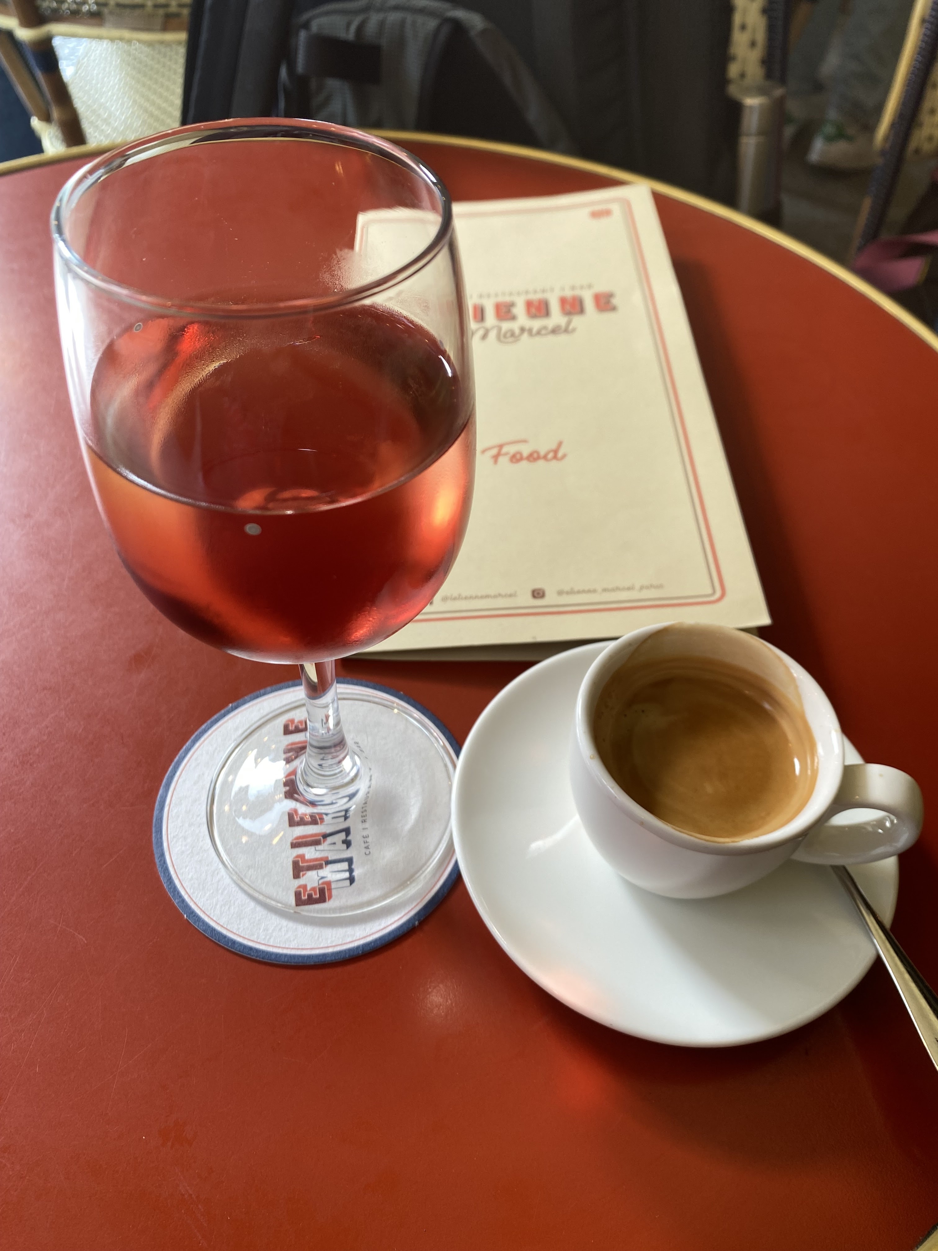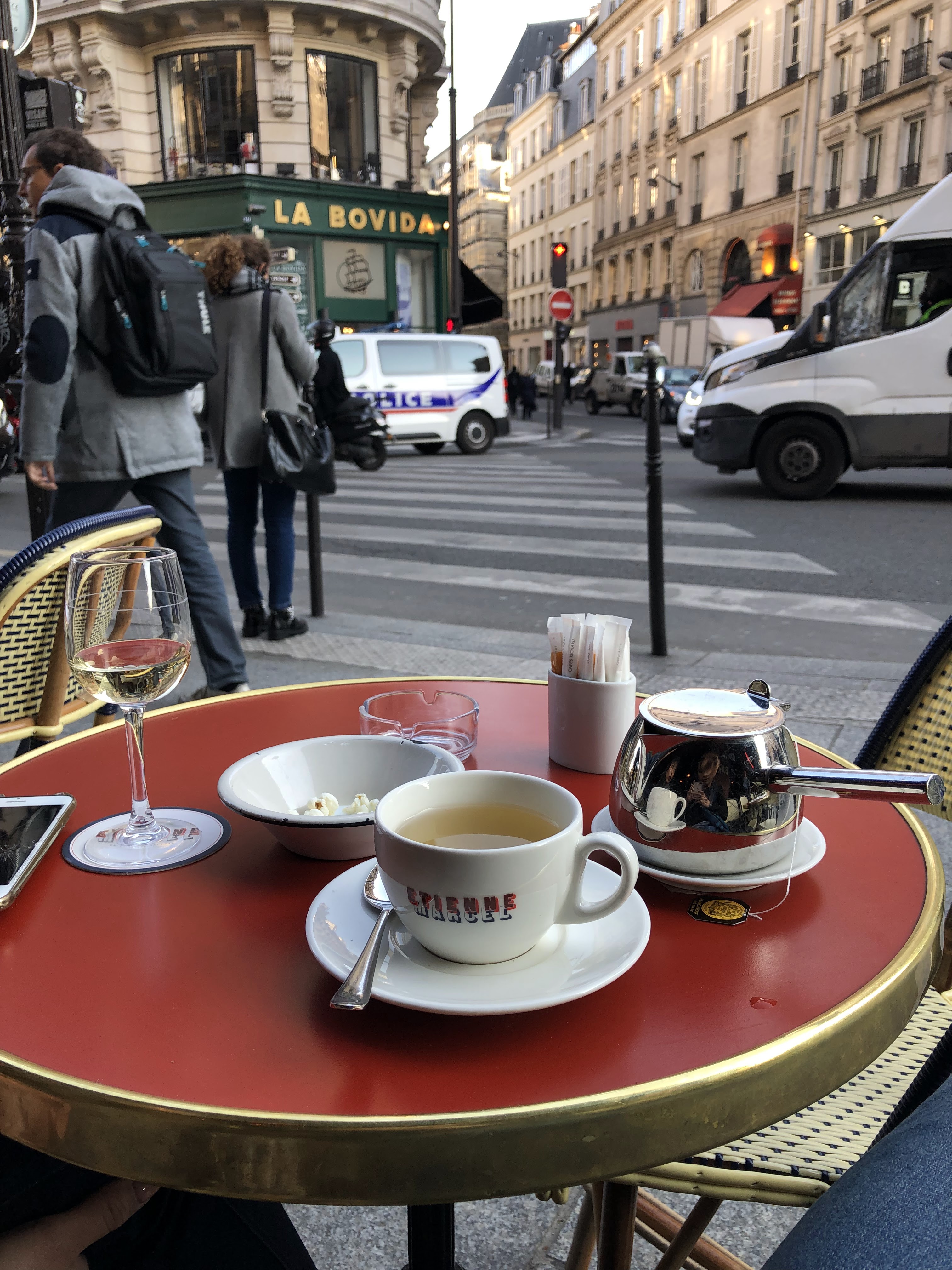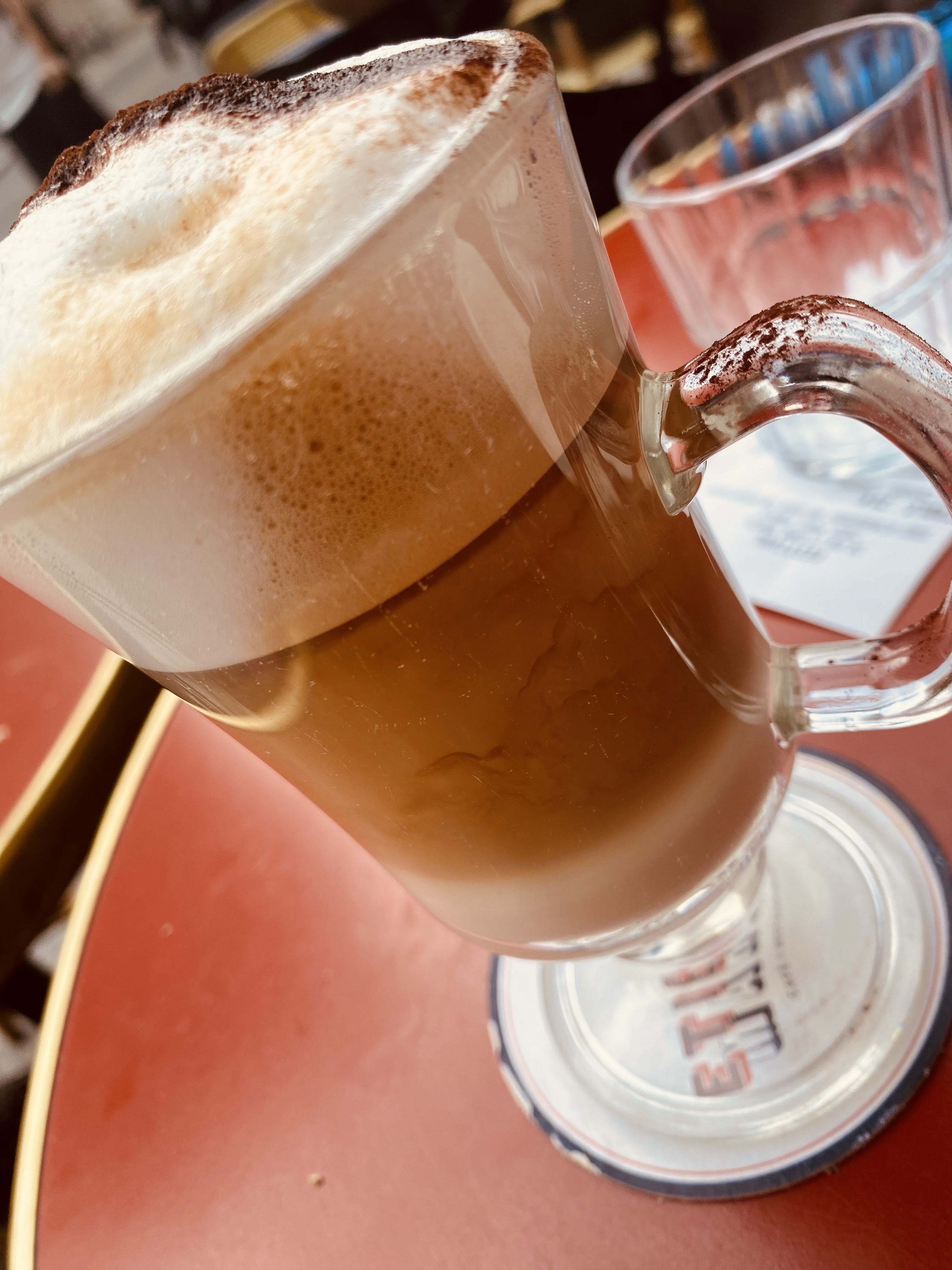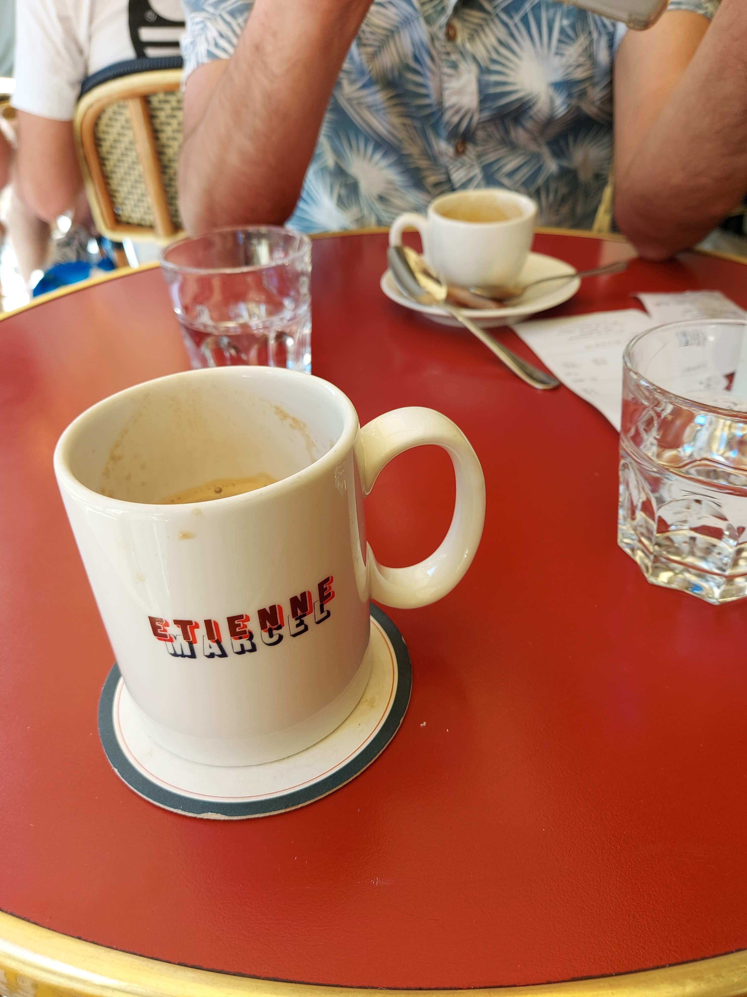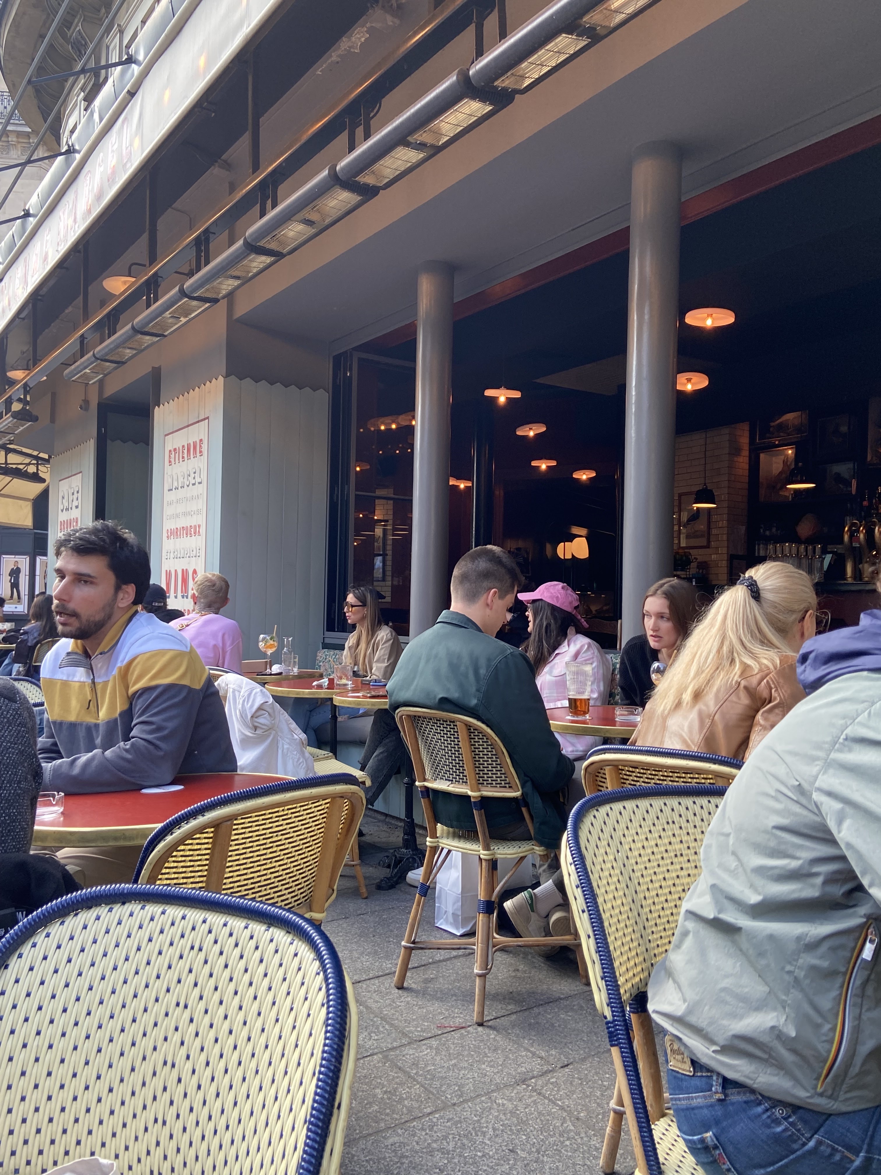 L'emplacement est top: en plein coeur de Paris, dans une rue très passante. Le serveur ne nous a pas donné de carte mais nous a demandé ce qu'on voulait. Café crème à 5€ (dans une tasse d'expresso avec un nuage de lait), café frappé à 7€ (dans un grand verre rempli de glaçon): ça fait un peu cher pour ce que c'est.