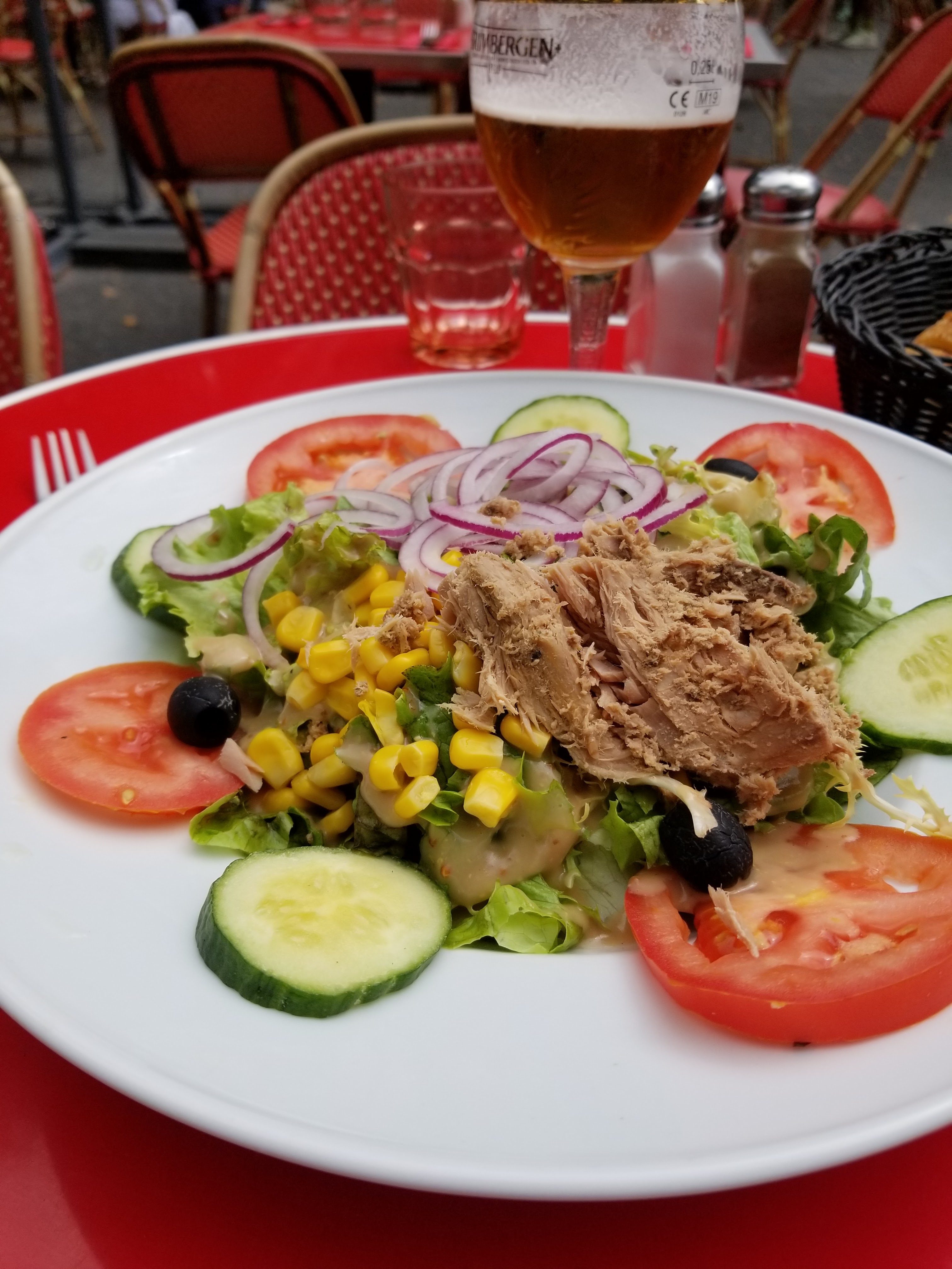 Bon emplacement, le reste. . Grand établissement parisien, belle terrasse, distanciation respectée. Service correct, serveur professionnel attentif. En revanche ils gèrent la marge côté quantités comme on dit. Salade du chef ( niçoise) , un bon petit tapis de salade pour faire gonfler, 3 tranches de concombre, 4 de tomates, une pincée de maïs, une pincée de thon et le tour est joué pour 13,90 un des plats du jour. Honnêtement c'est vraiment limite, faut pas avoir trop faim.. Autant dire que je ne me suis pas étouffé, ce n'est pas plus mal me direz vous :-) Ajoutez une bière pression Grimbergen 25cl à 5,80 € . En bref, bon emplacement, service correct, portions petites pour les prix pratiqués.